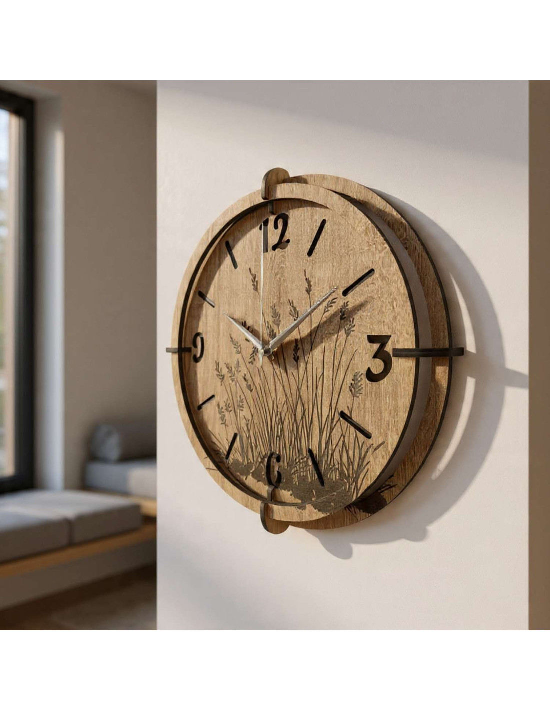 Moderne Wanduhren aus Holz mit einem filigranen, eingravierten Wiesenmotiv bringen Ruhe und Harmonie in den Innenraum.