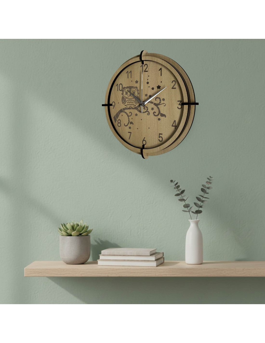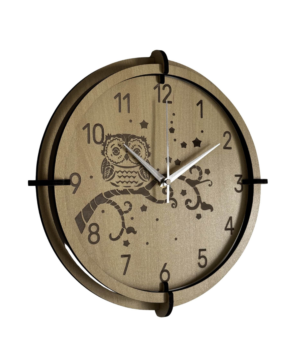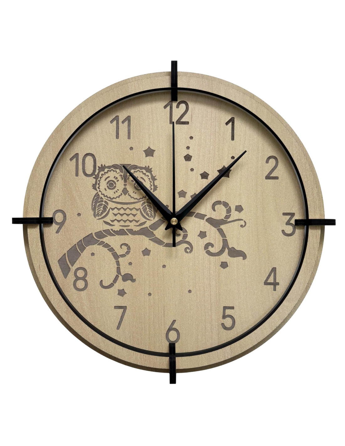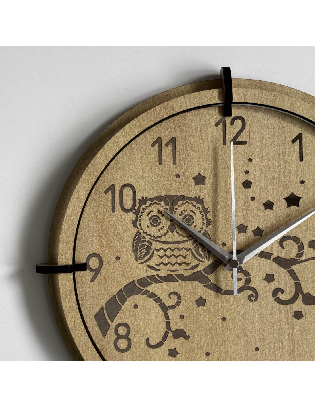 Moderne Wanduhr aus Ahornholz mit einem zarten, eingravierten Eulenmotiv für Kinder bringt Ruhe und Harmonie in den Raum.