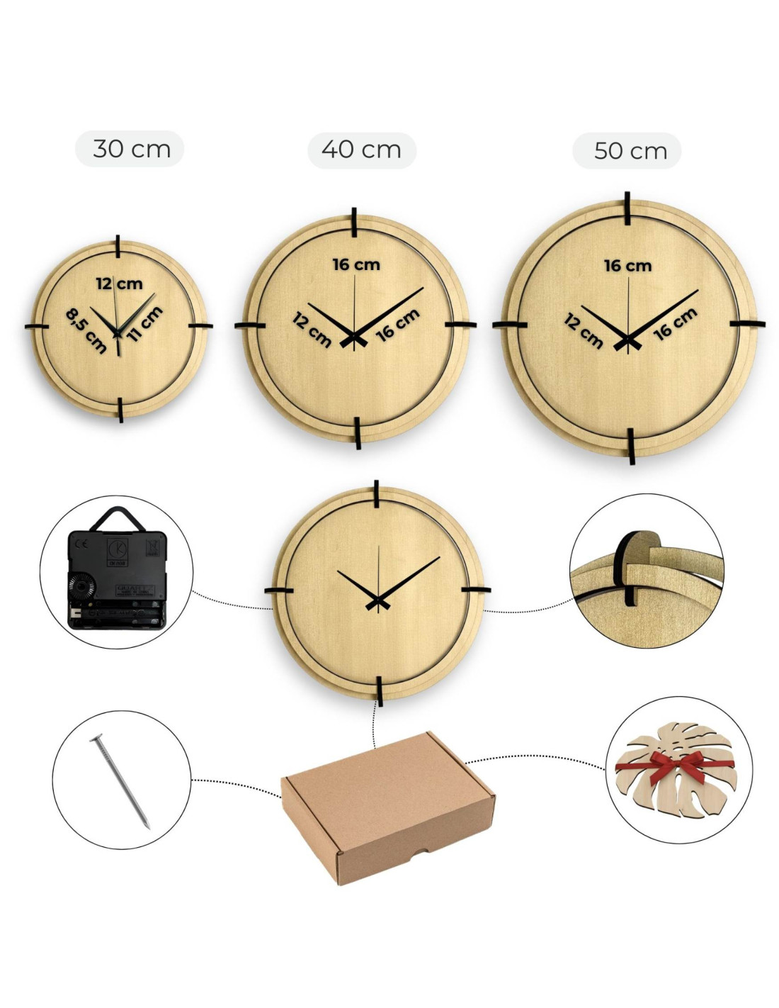- Uhrendurchmesser: Wählen Sie zwischen 30 cm, 40 cm oder 50 cm