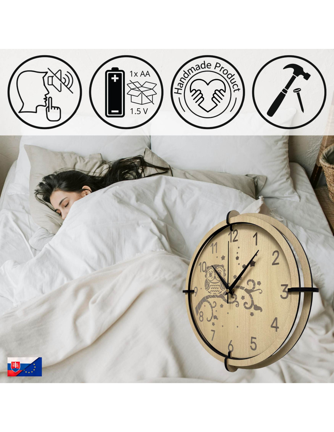 Das leise Quarzwerk garantiert einen präzisen und geräuschlosen Betrieb und ist somit ideal für Kinderzimmer, Wohnzimmer oder Schlafzimmer geeignet .