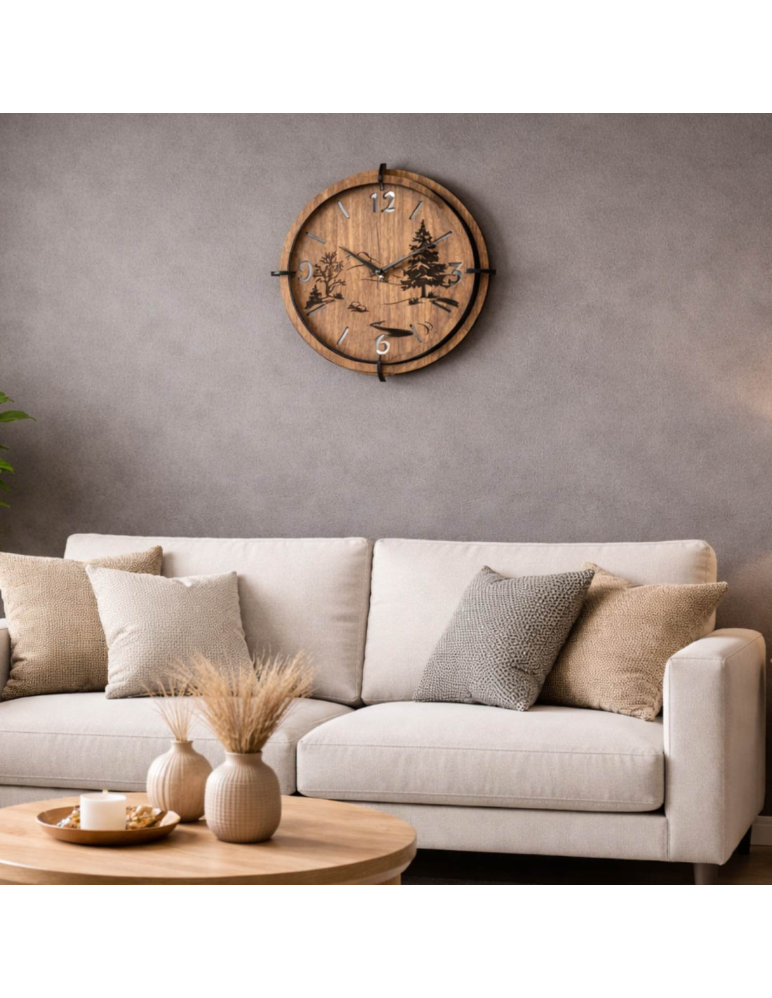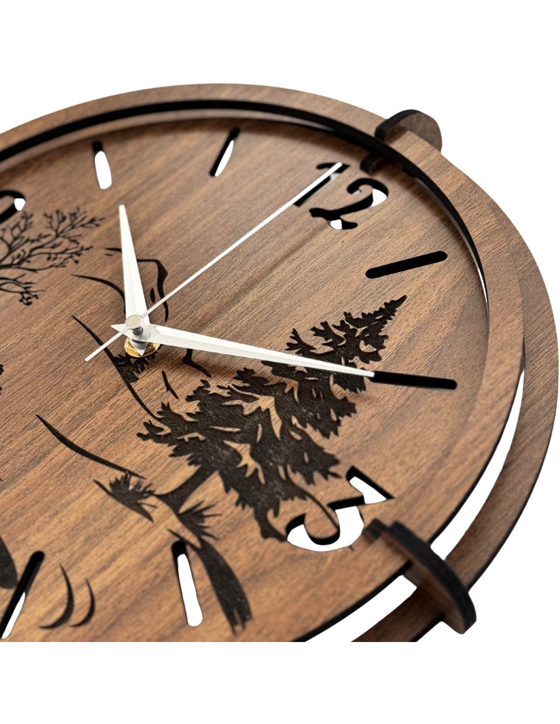 Moderne Wanduhr aus Holz mit einem dreidimensionalen Panoramamotiv aus Wald und Bergen bringt die Kraft der Natur und ein Gefühl der Freiheit in den Innenraum.