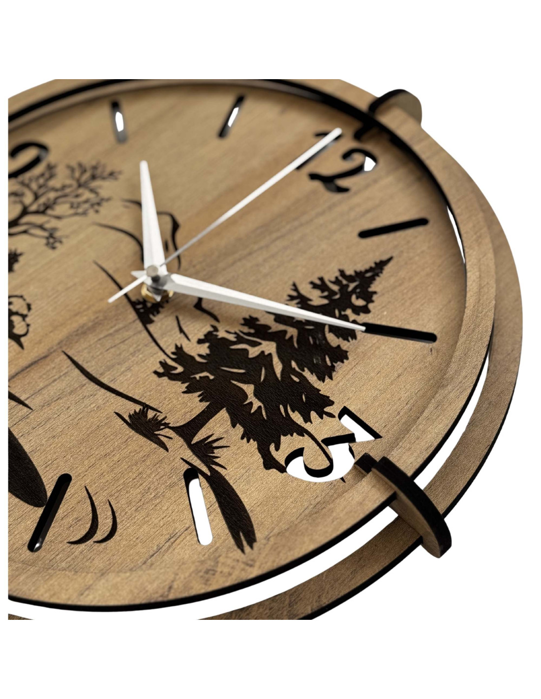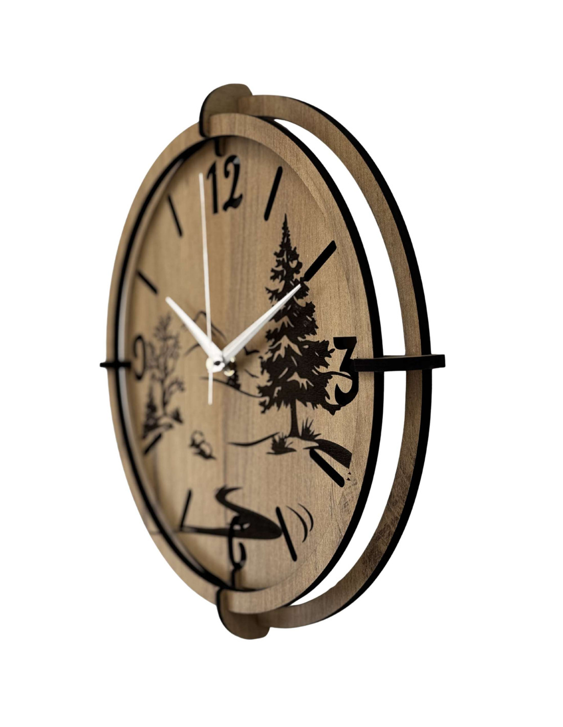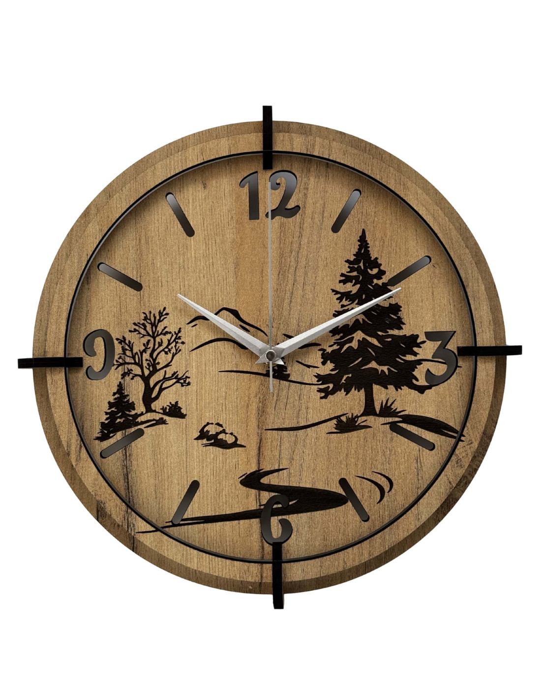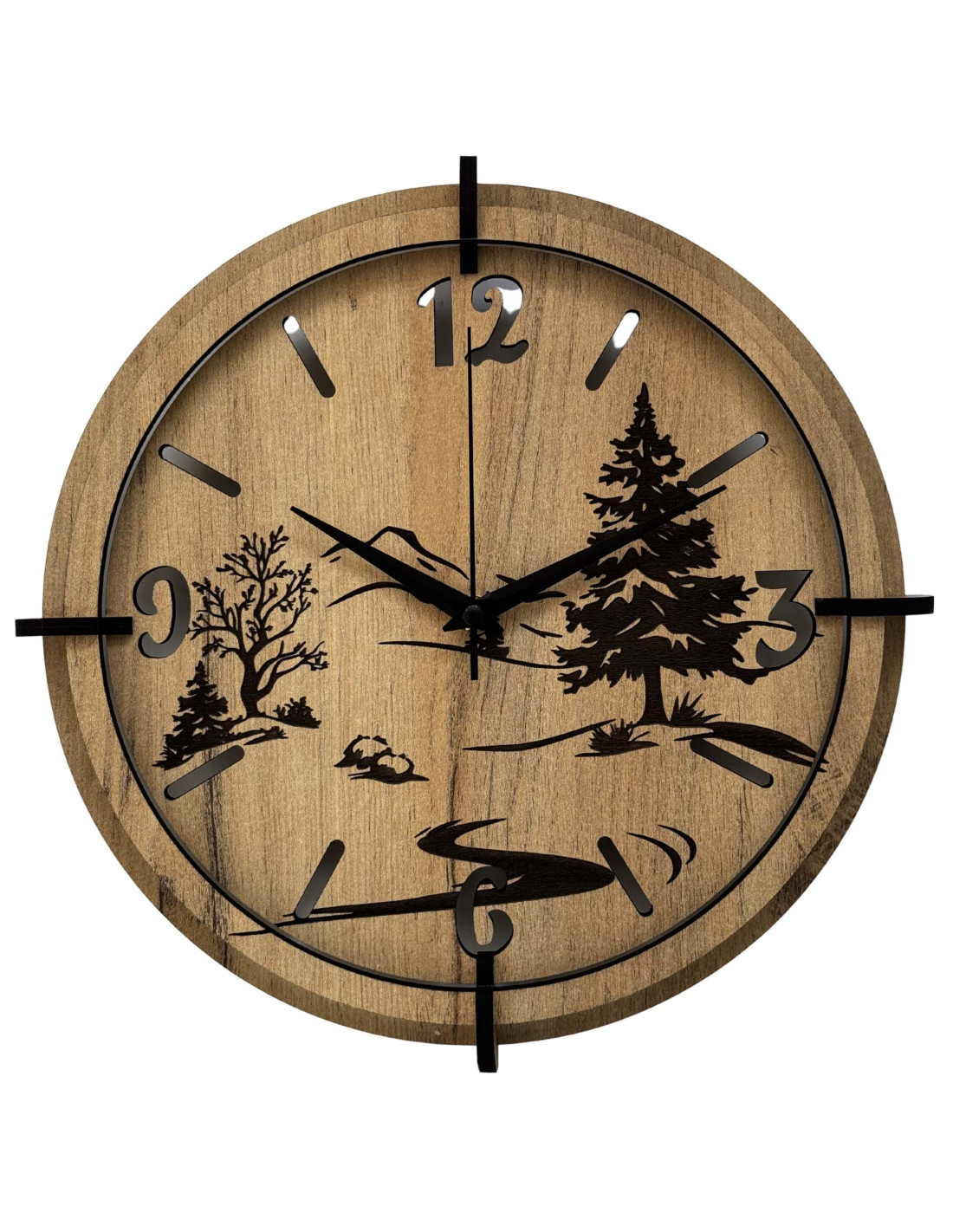 Das detaillierte Design zeigt einen dominanten immergrünen Baum, zarte Baumsilhouetten, einen Berghorizont und einen gewundenen Fluss , die in eine hochwertige HDF-Platte mit HDF GOLD OAK -Dekor eingearbeitet sind, was der Uhr ein warmes und natürliches Aussehen verleiht.