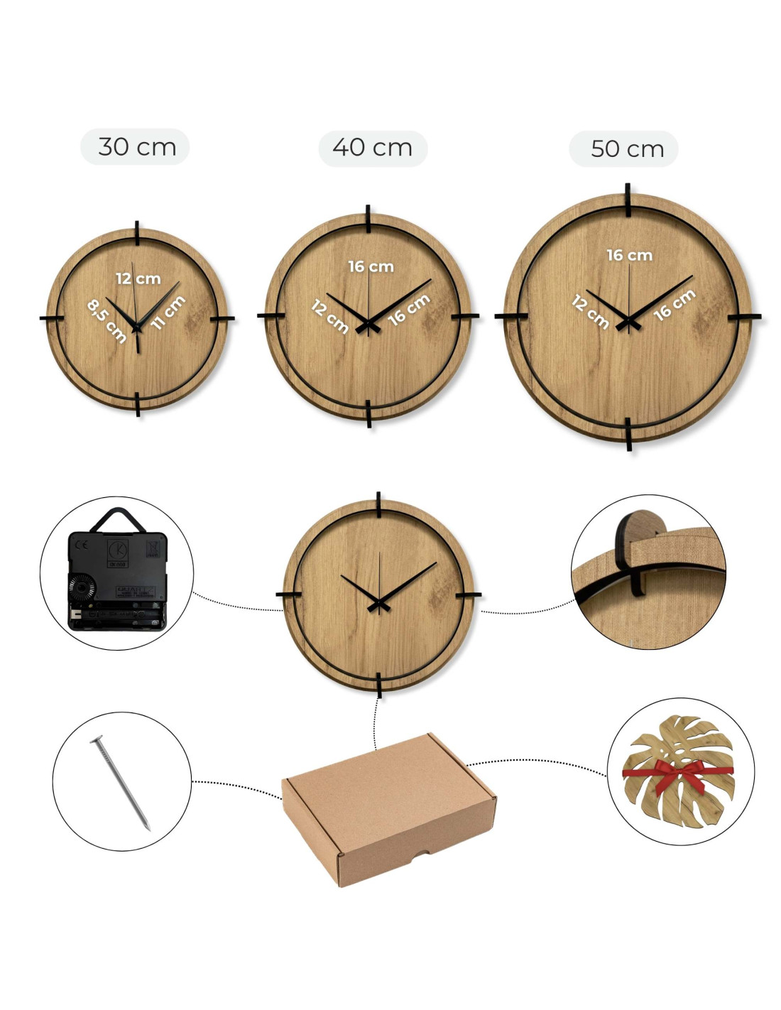 - Uhrendurchmesser: Wählen Sie zwischen 30 cm, 40 cm oder 50 cm