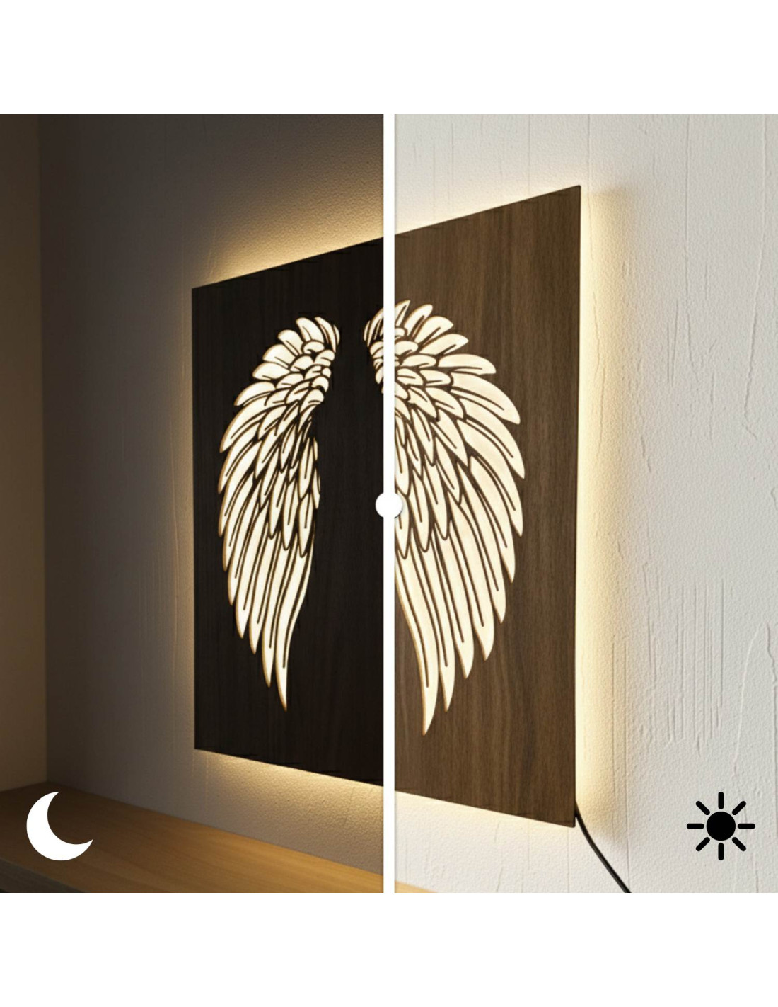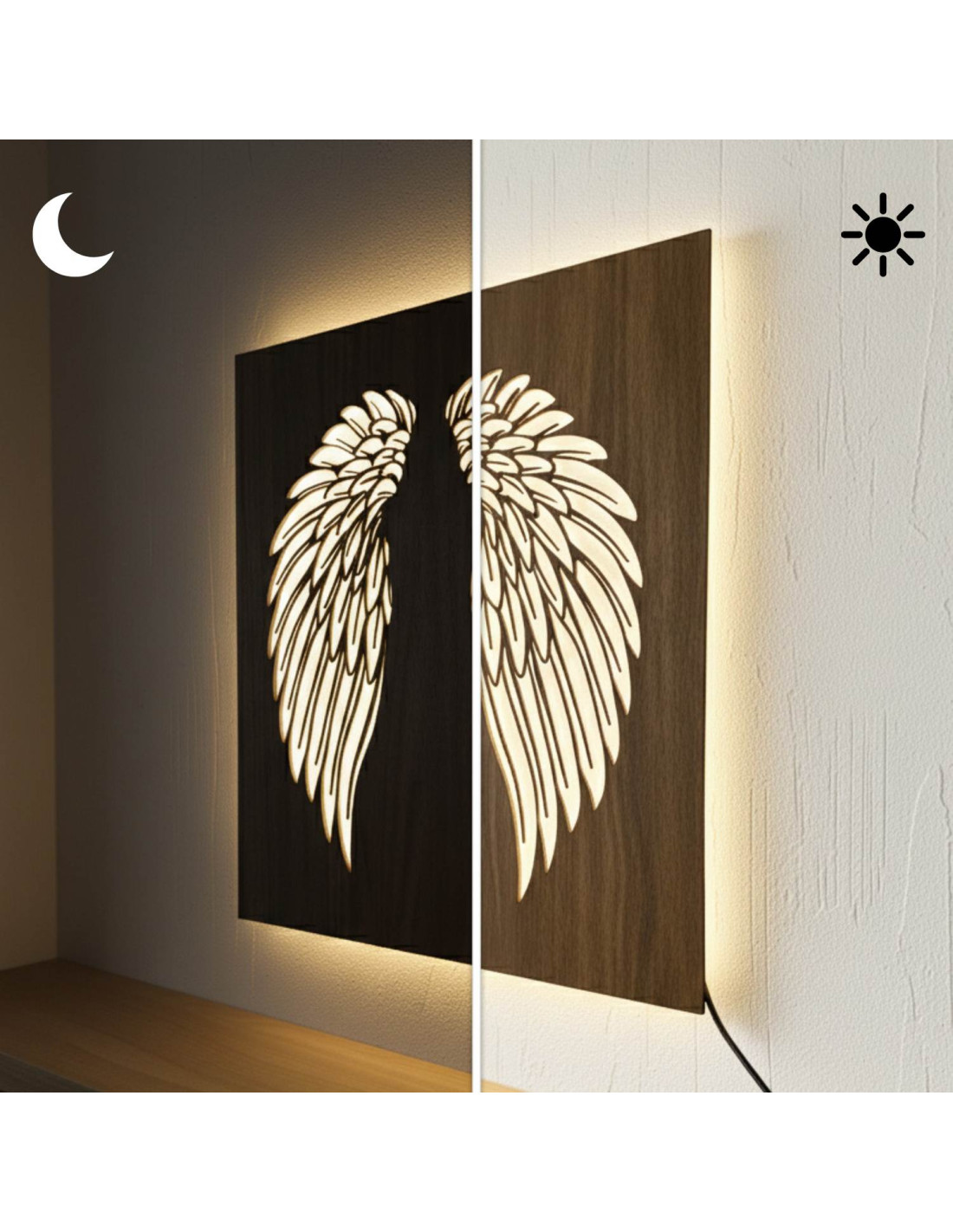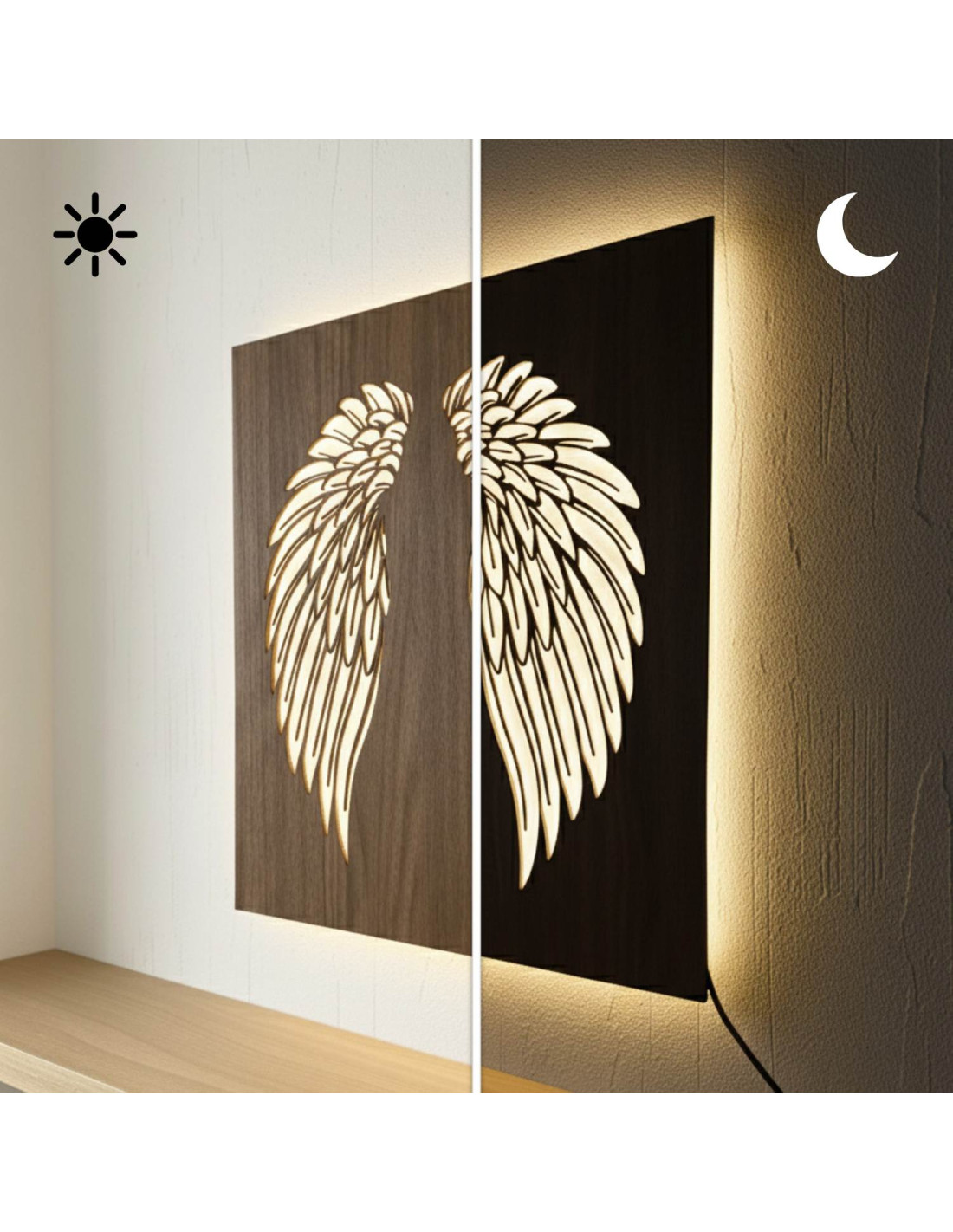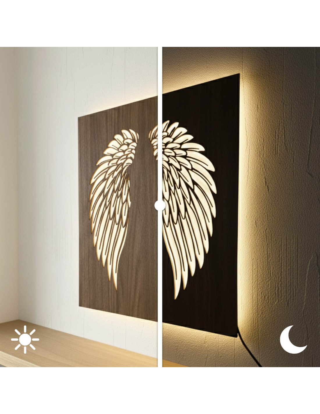 Hinterleuchtetes Holzbild mit LED-Beleuchtung – Engelsflügel an der Wand