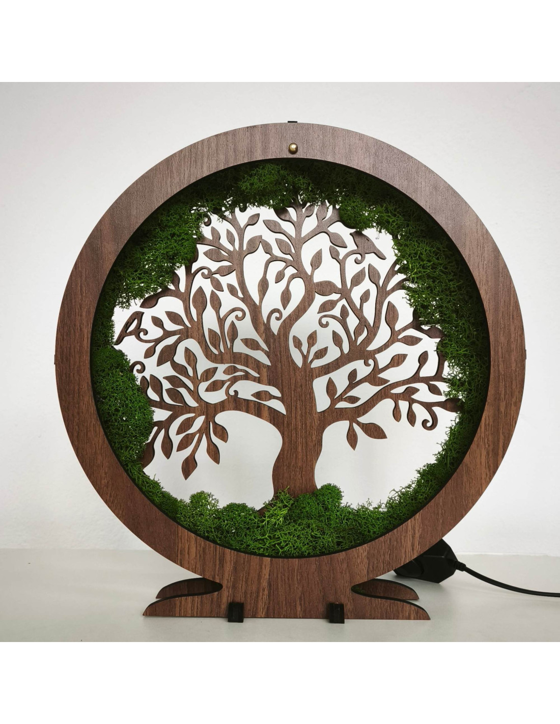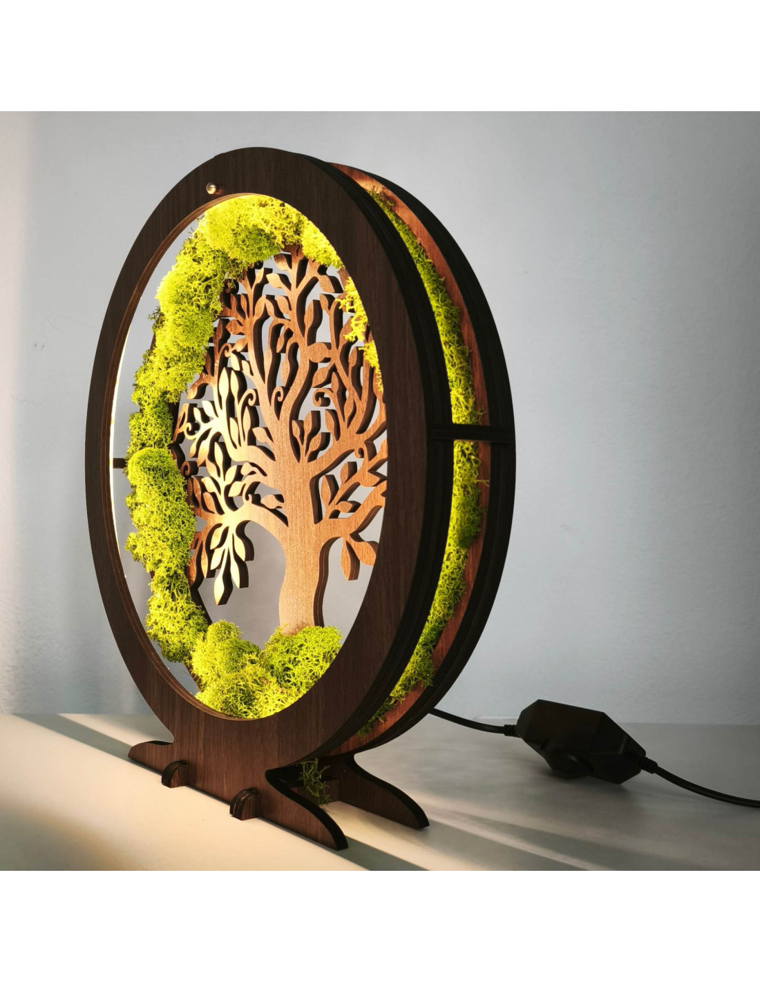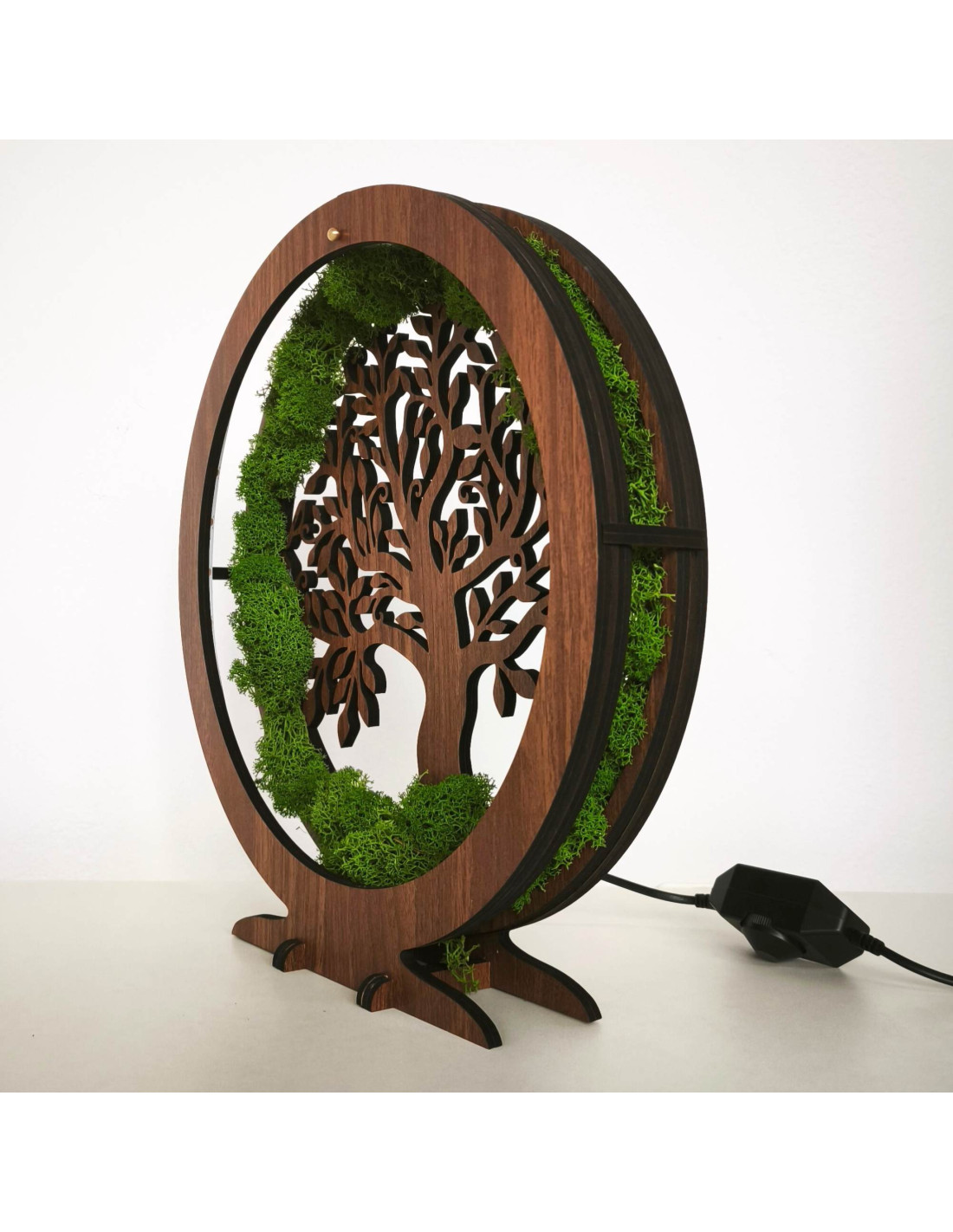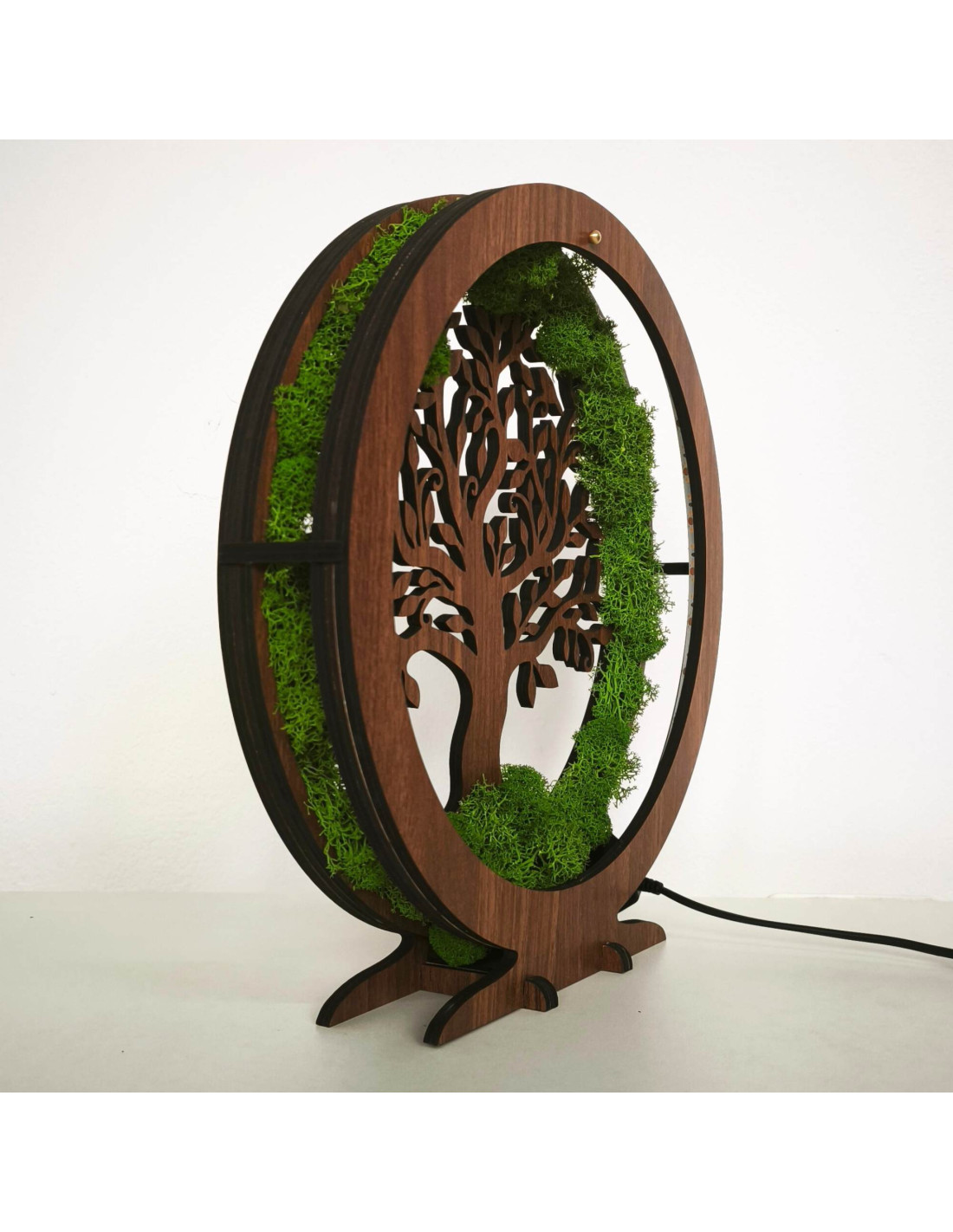 Es besteht aus 15 mm dicken HDF-Platten in der Farbe Walnuss-Wenge und ist mit stabilisiertem Moos verziert, das am Rand angebracht ist und einen einzigartigen natürlichen Effekt erzeugt.