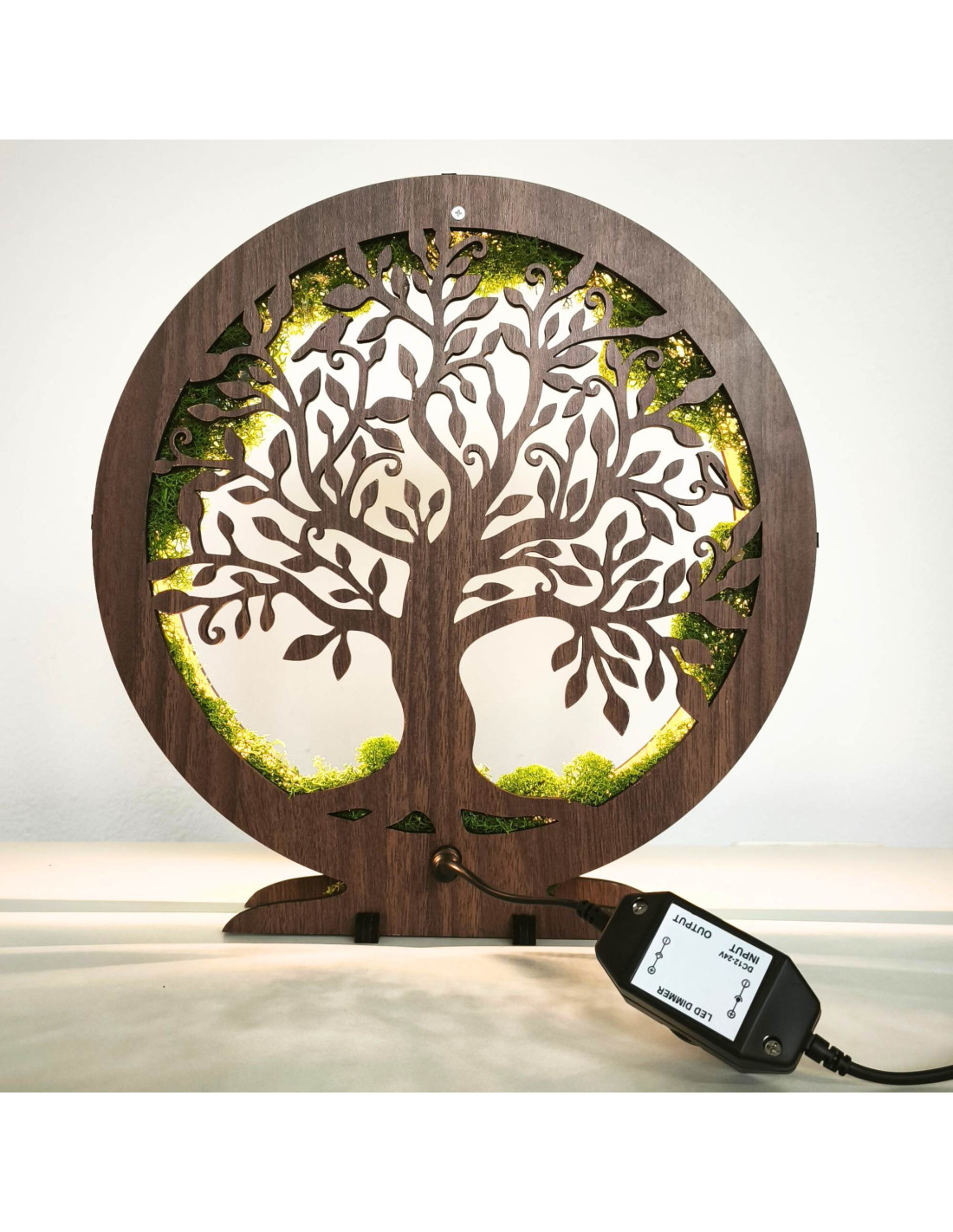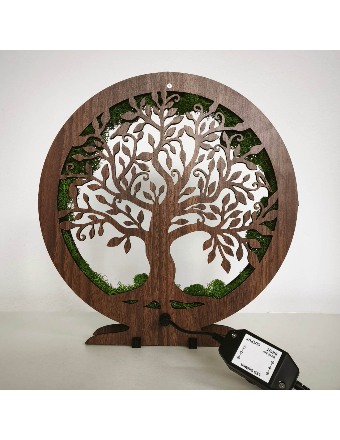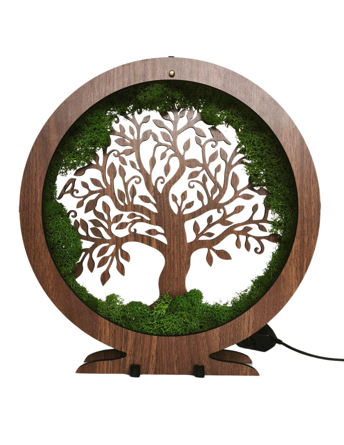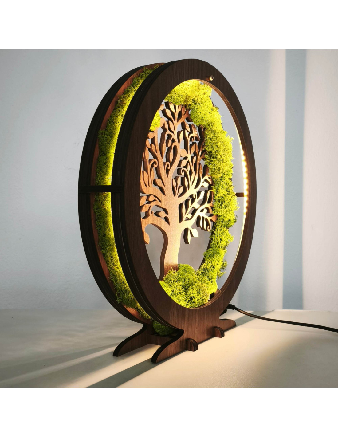 Es besteht aus 15 mm dicken HDF-Platten in der Farbe Walnuss-Wenge und ist mit stabilisiertem Moos verziert, das am Rand angebracht ist und einen einzigartigen natürlichen Effekt erzeugt.
