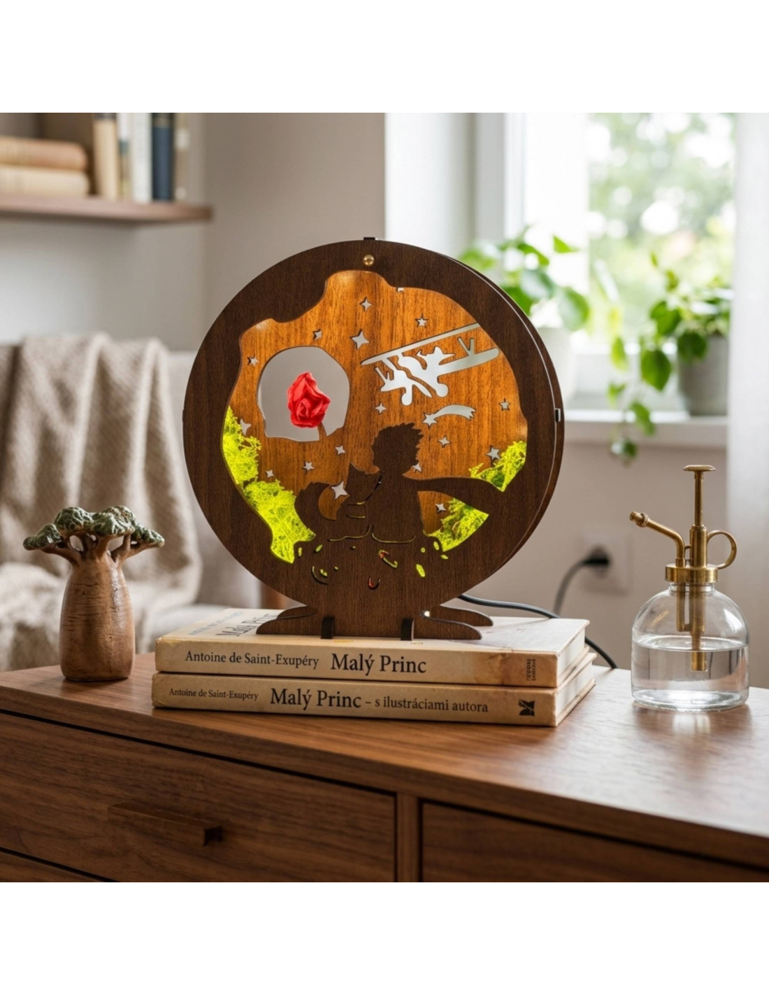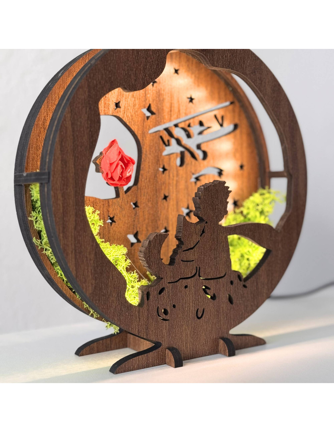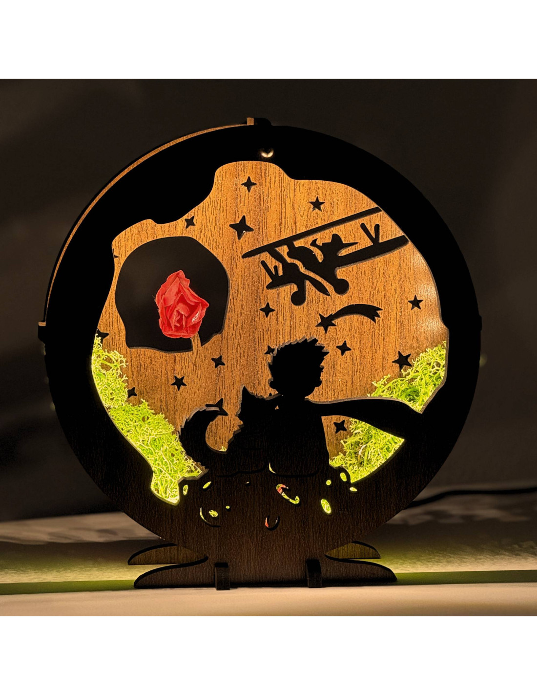 Diese dimmbare LED-Tischleuchte mit dem Motiv des Kleinen Prinzen ist eine einzigartige Kombination aus Märchen, natürlichen Elementen und moderner Beleuchtung.
