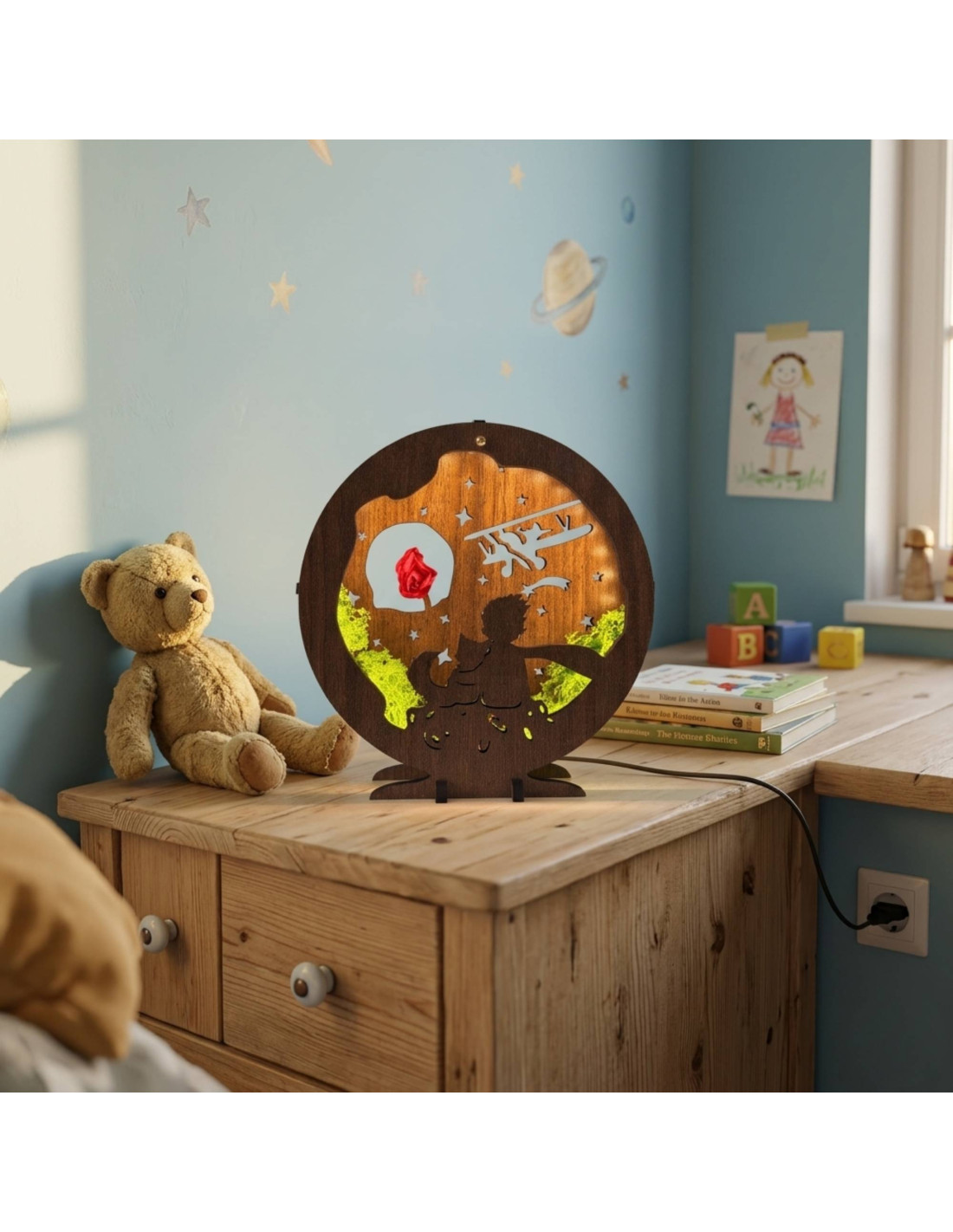 Das detailreiche Design mit der Figur des Kleinen Prinzen, einer Rose und dem Nachthimmel erzeugt ein angenehmes, warmes Umgebungslicht , ideal für das Wohnzimmer, Schlafzimmer oder Kinderzimmer.