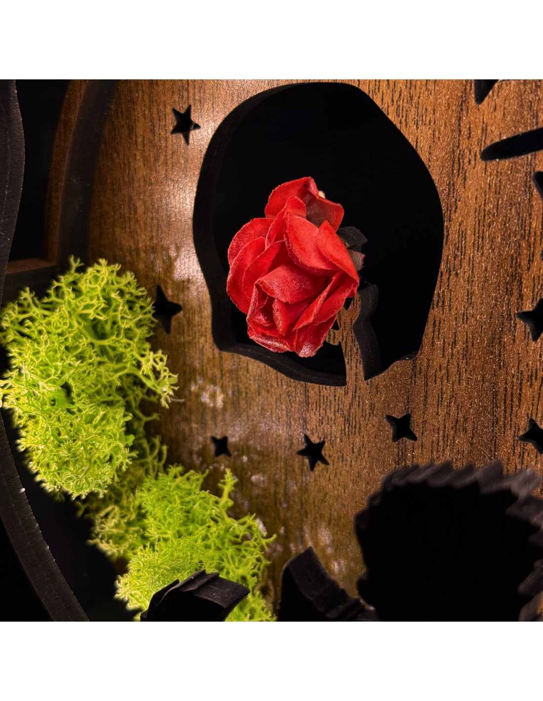 Das Design wird durch stabilisiertes Moos ergänzt, das sein natürliches Aussehen beibehält und keiner Pflege bedarf.