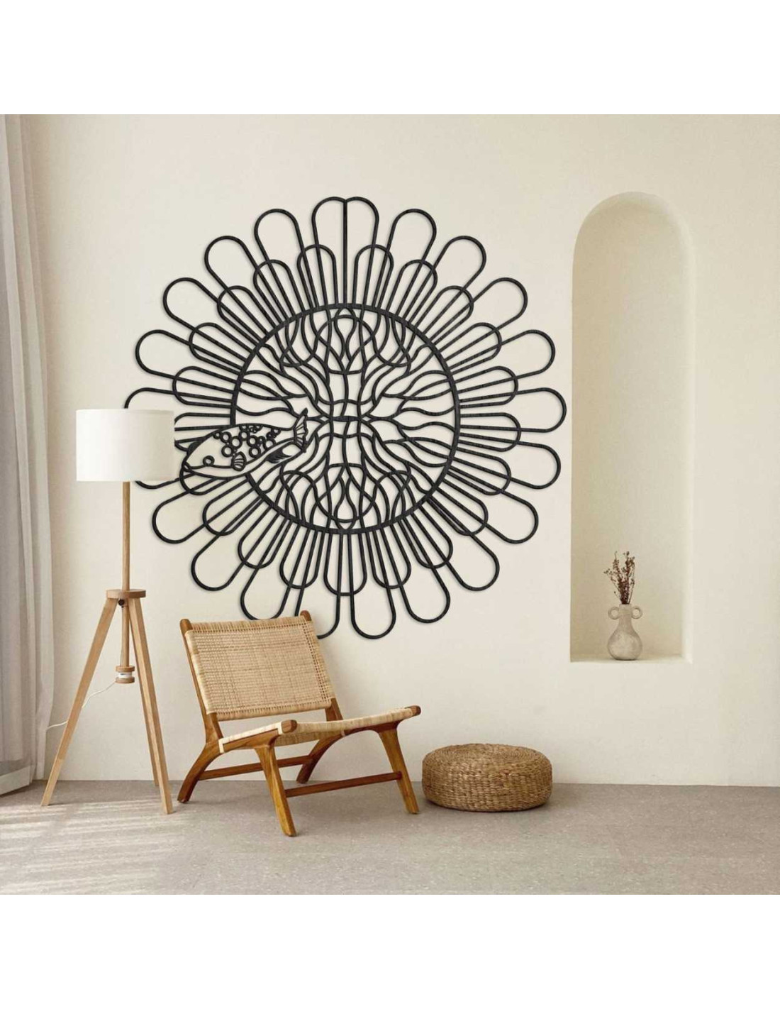 Stilvolle Wanddekoration in Kreisform mit geometrischer Anordnung und einem Fischmotiv.