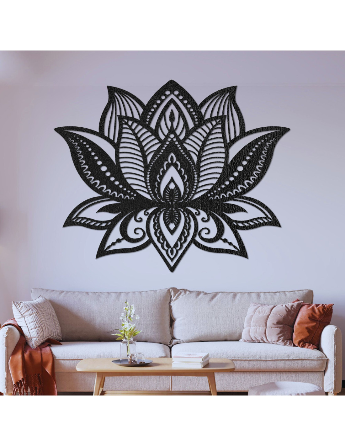 Die sorgfältig eingearbeiteten Muster bilden eine symmetrische Lotusblume, die Harmonie, Frieden und Einheit symbolisiert.