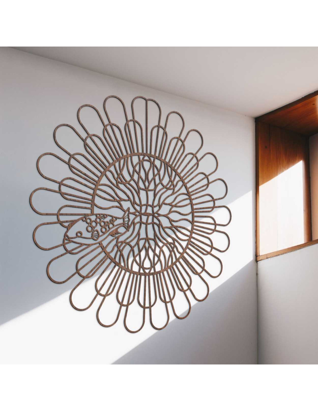 Eine großformatige Dekoration mit einem aufwendigen Blumenmotiv aus gebogenem Material verleiht dem Raum ein Gefühl von Bewegung und Organik.