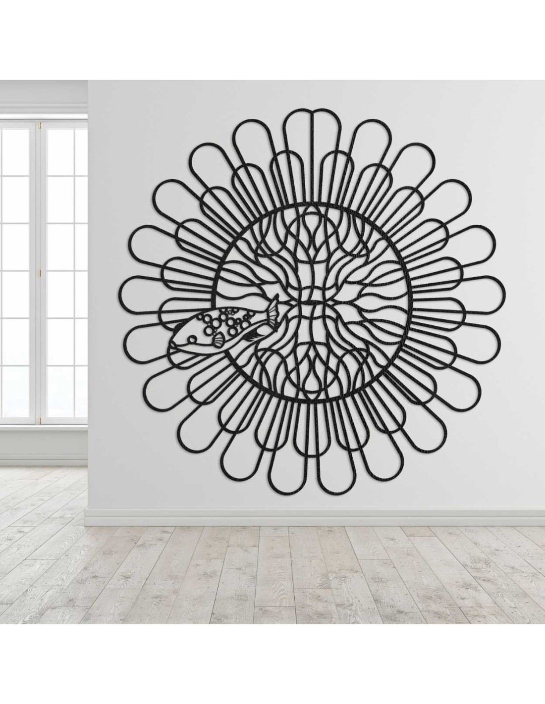 Eine großformatige Dekoration mit einem aufwendigen Blumenmotiv aus gebogenem Material verleiht dem Raum ein Gefühl von Bewegung und Organik.