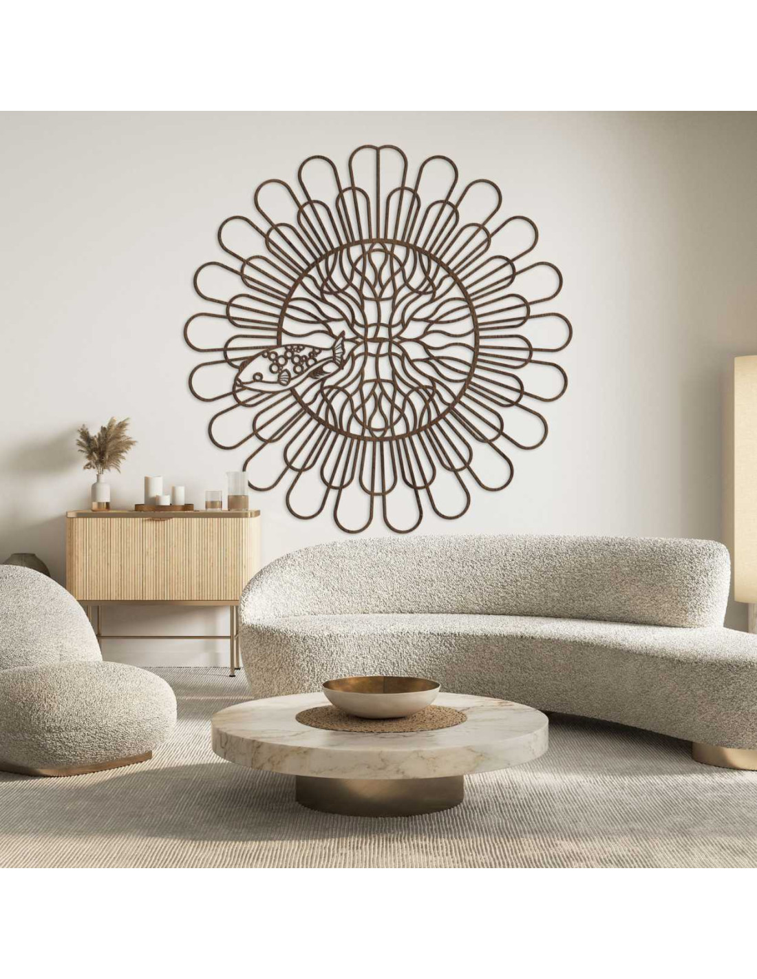 Eine großformatige Dekoration mit einem aufwendigen Blumenmotiv aus gebogenem Material verleiht dem Raum ein Gefühl von Bewegung und Organik.
