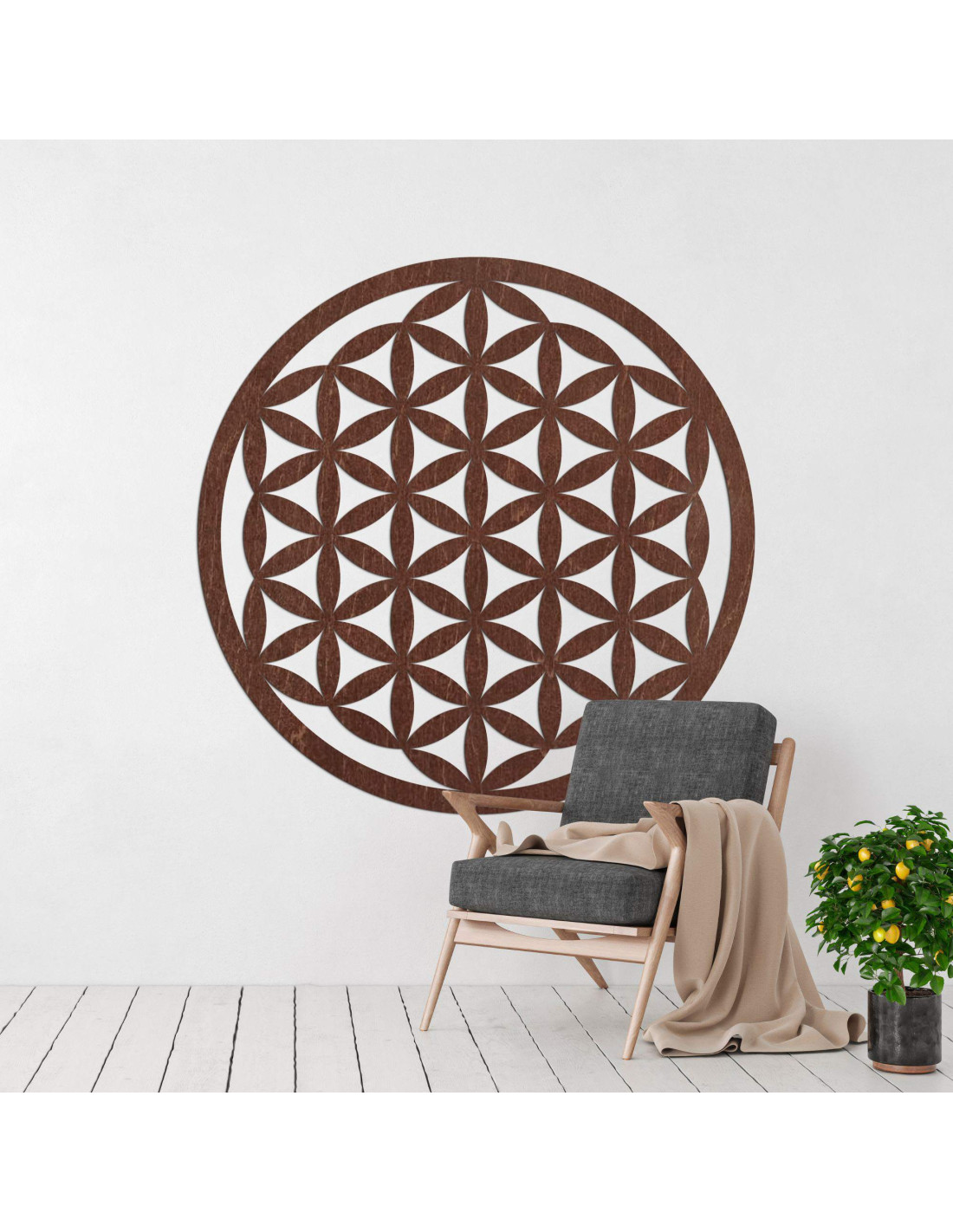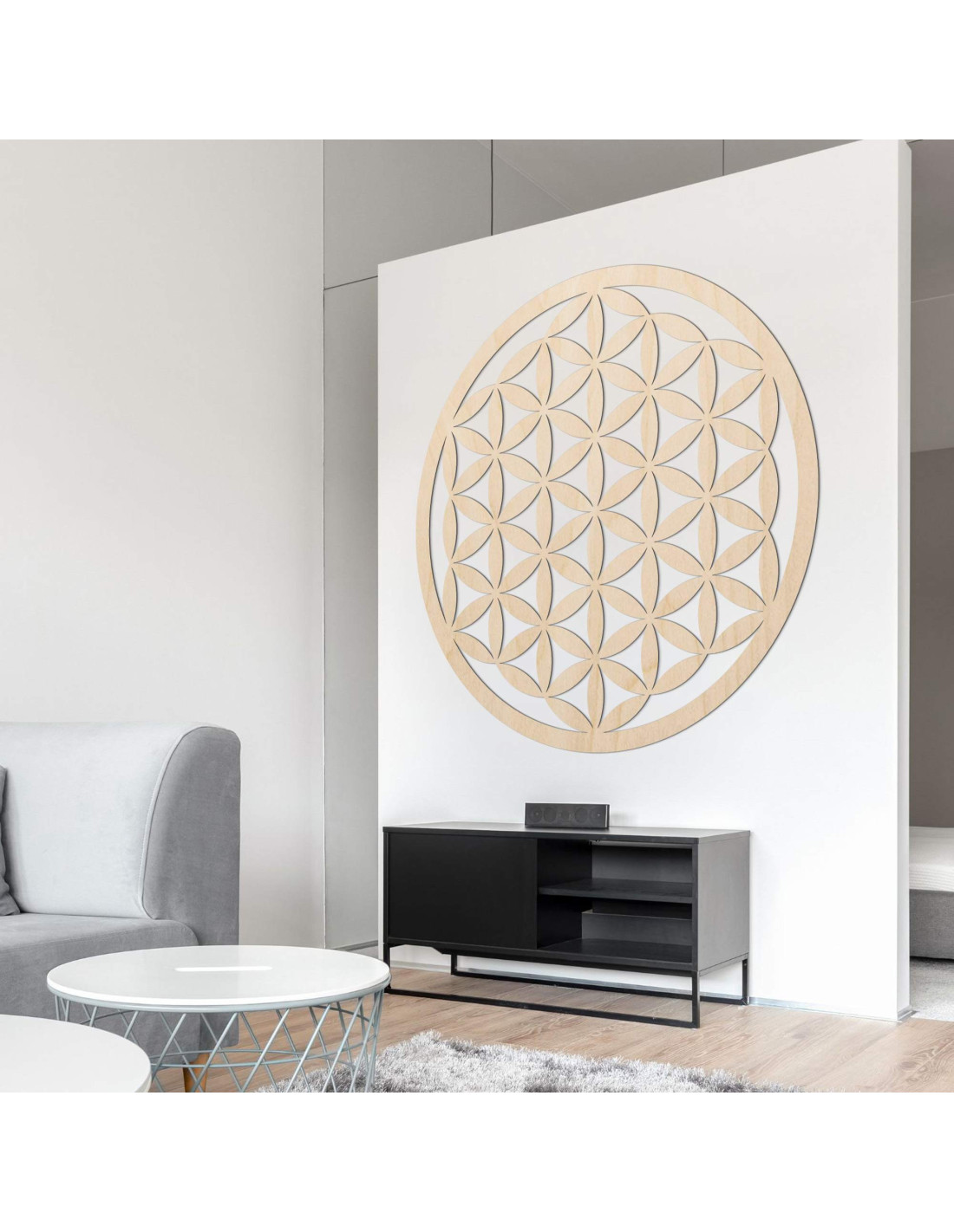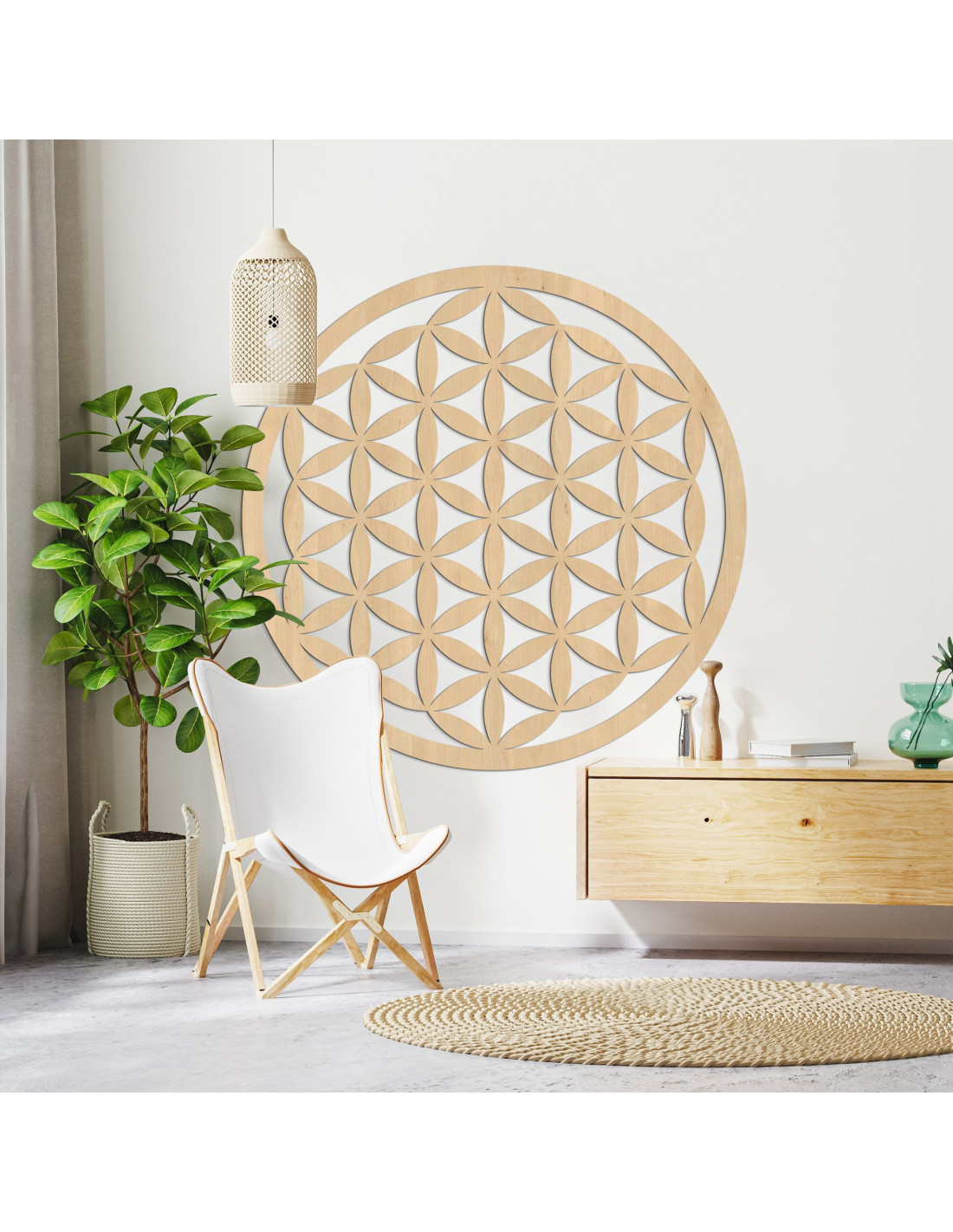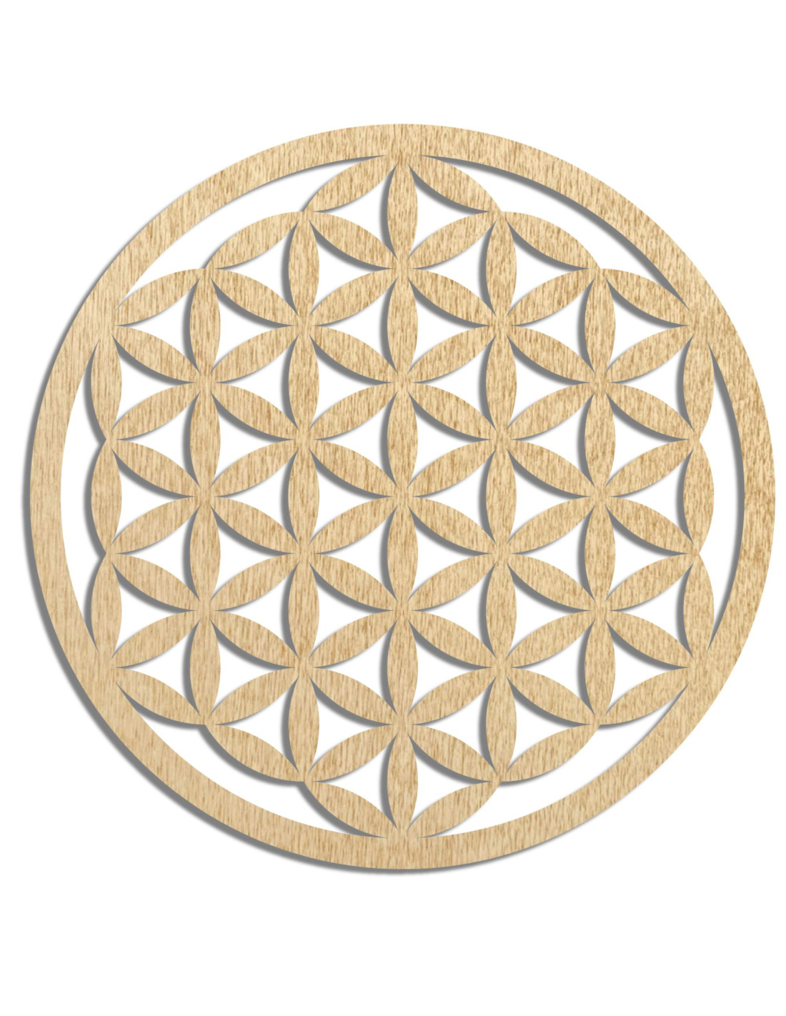 Eine Holzdekoration mit einem Lebensblumenmotiv wird Ihren Raum mit einem Symbol für Einheit, Harmonie und unendliche Energie bereichern.