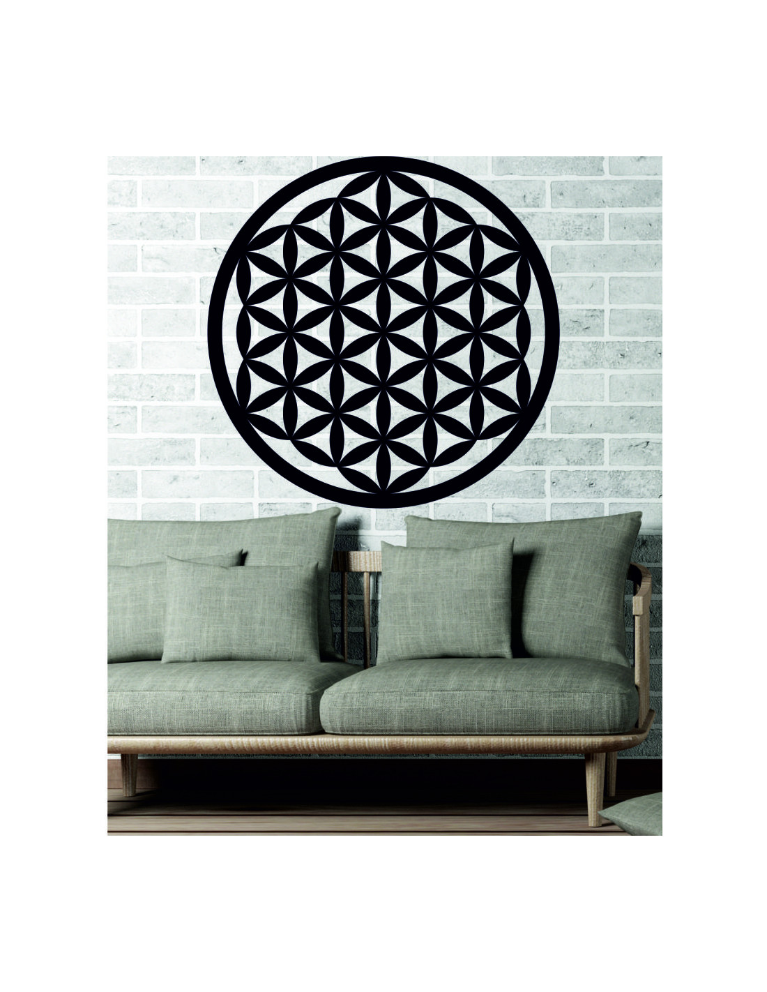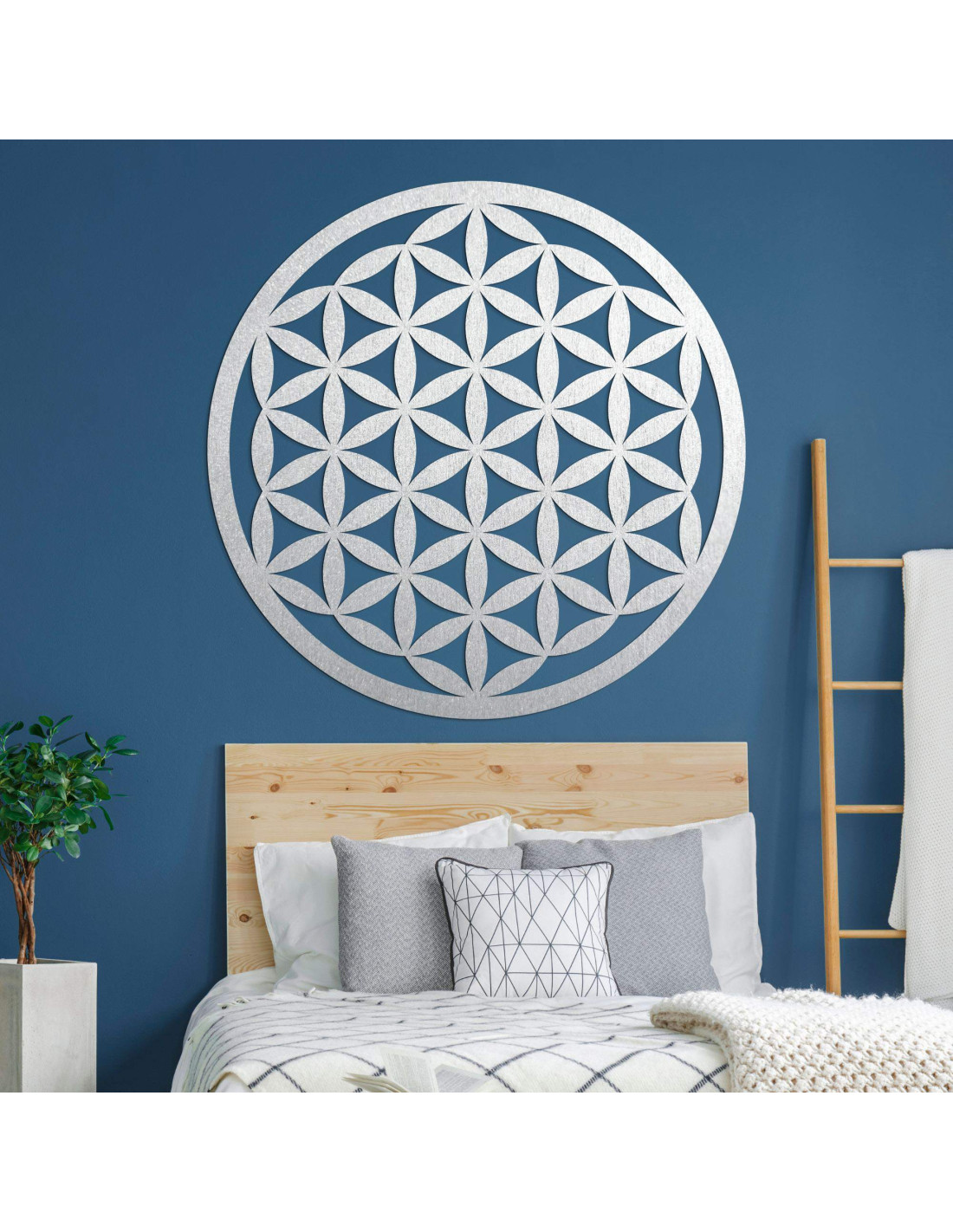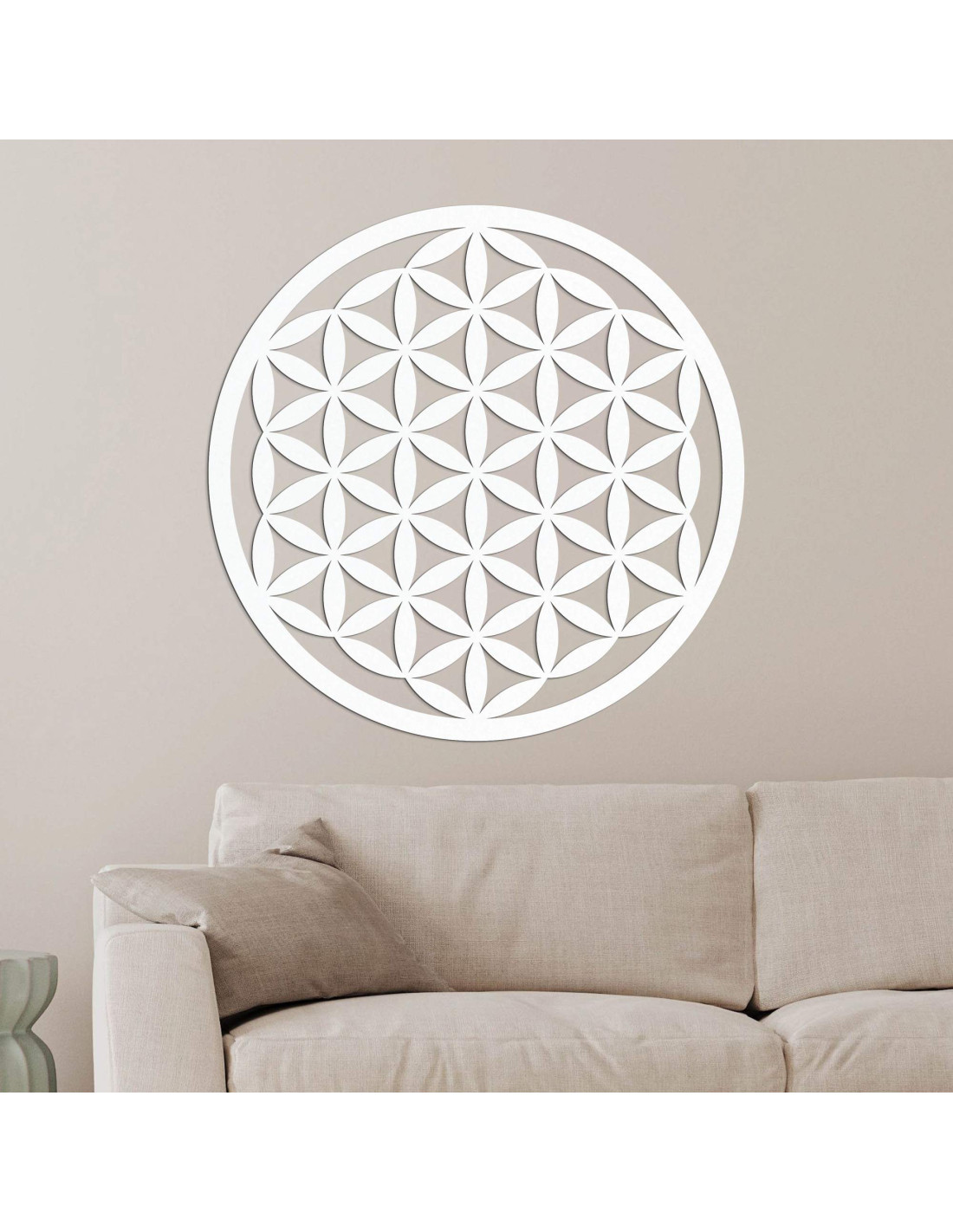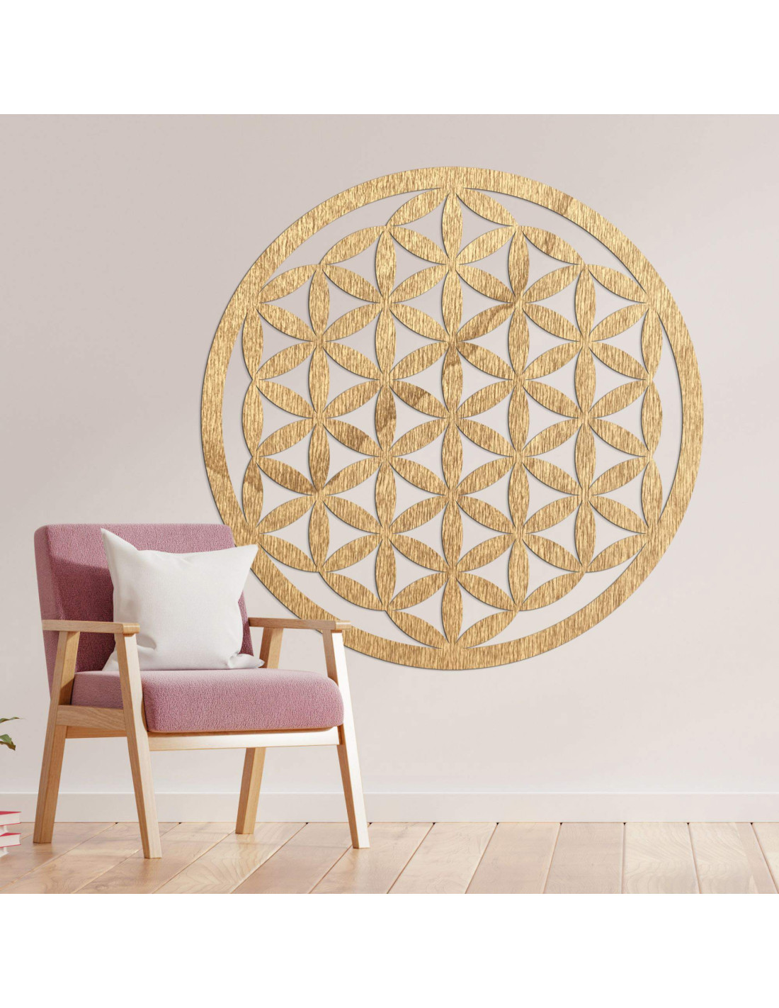 Eine Holzdekoration mit einem Lebensblumenmotiv wird Ihren Raum mit einem Symbol für Einheit, Harmonie und unendliche Energie bereichern.