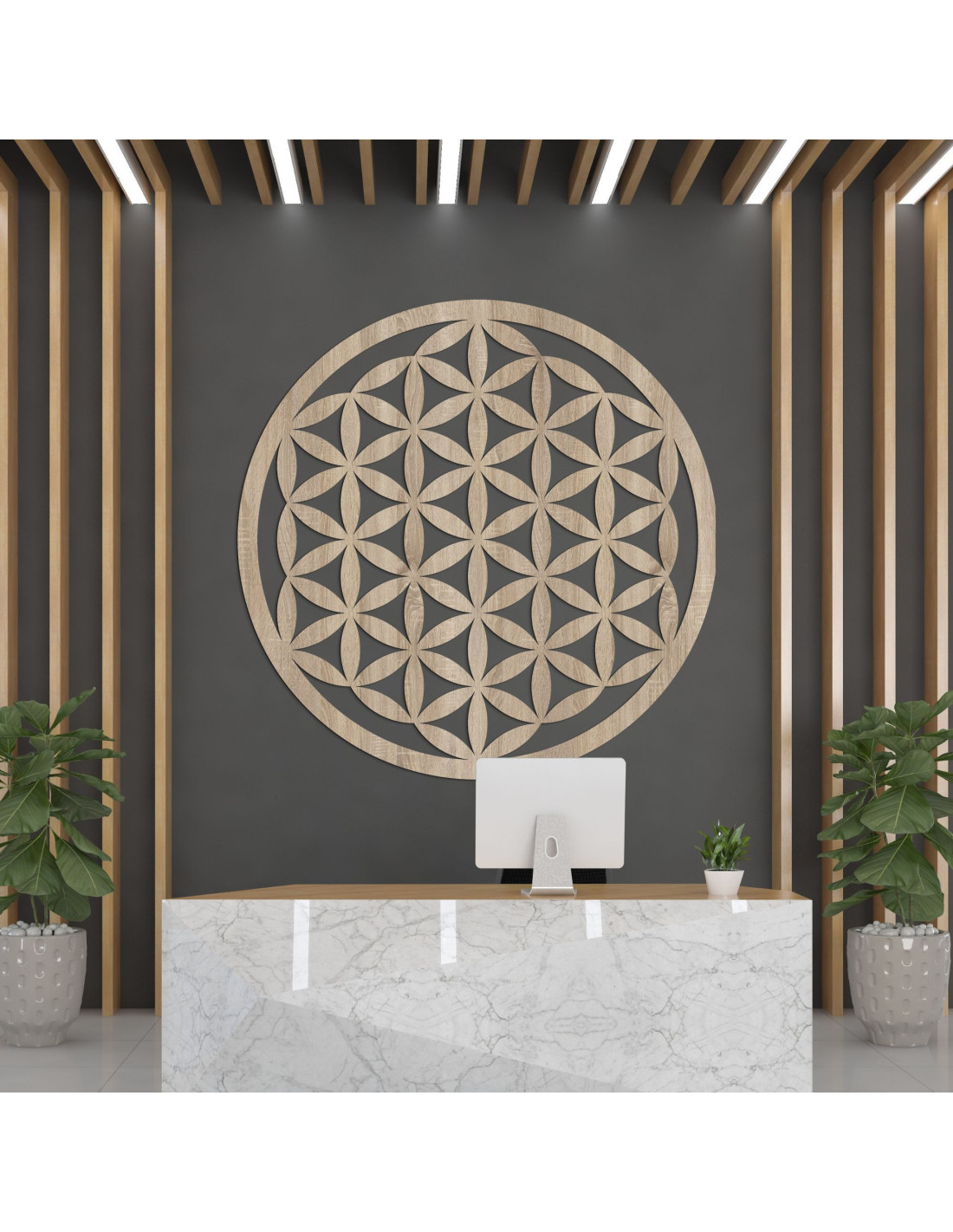 Eine Holzdekoration mit einem Lebensblumenmotiv wird Ihren Raum mit einem Symbol für Einheit, Harmonie und unendliche Energie bereichern.