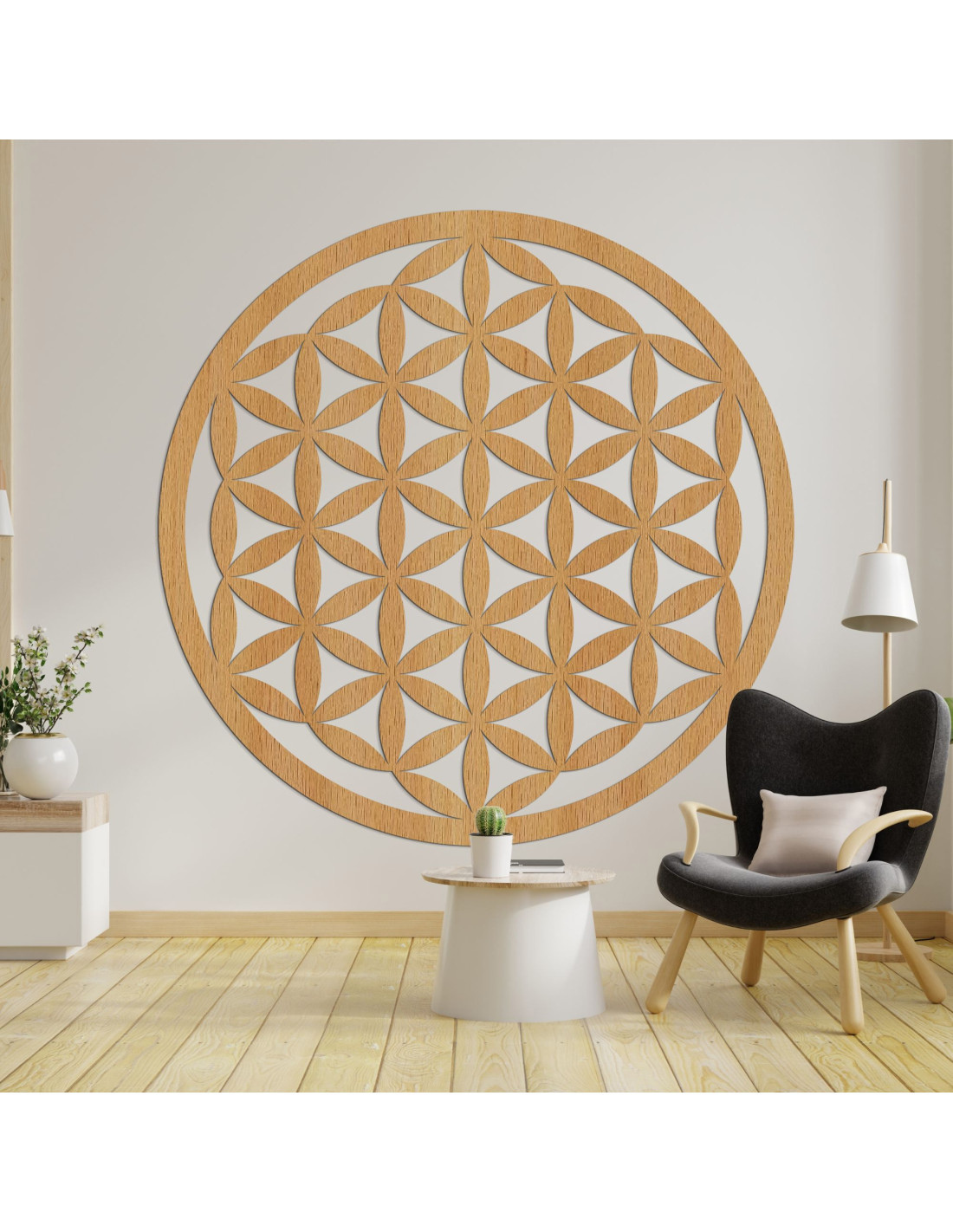 Eine Holzdekoration mit einem Lebensblumenmotiv wird Ihren Raum mit einem Symbol für Einheit, Harmonie und unendliche Energie bereichern.