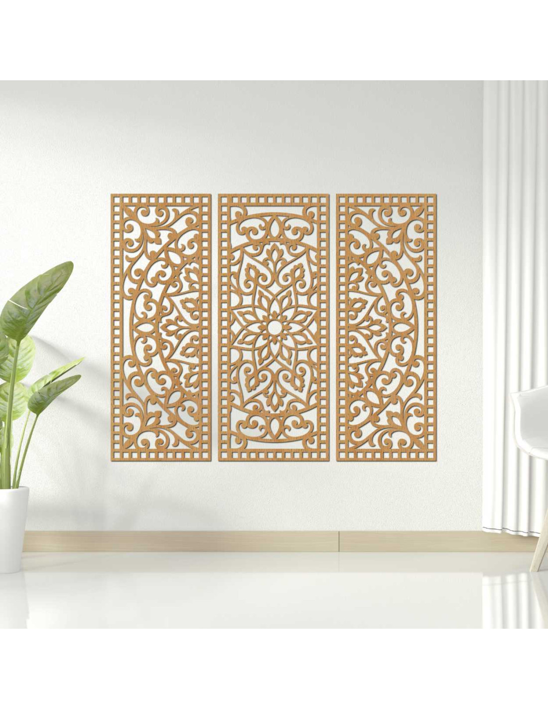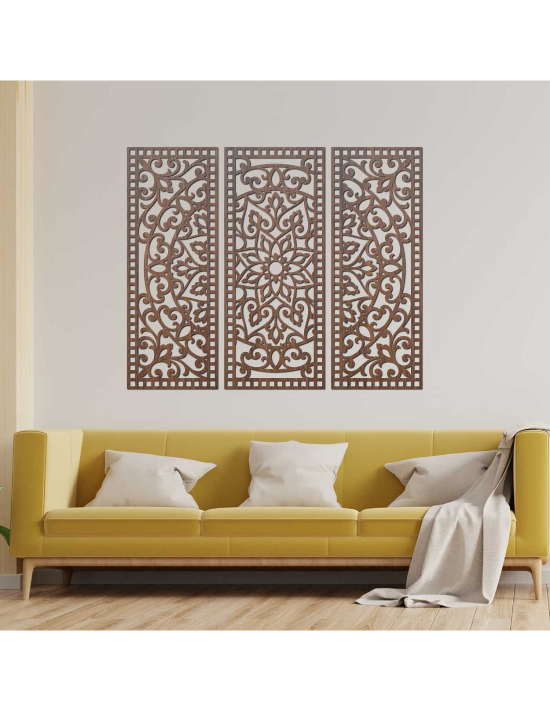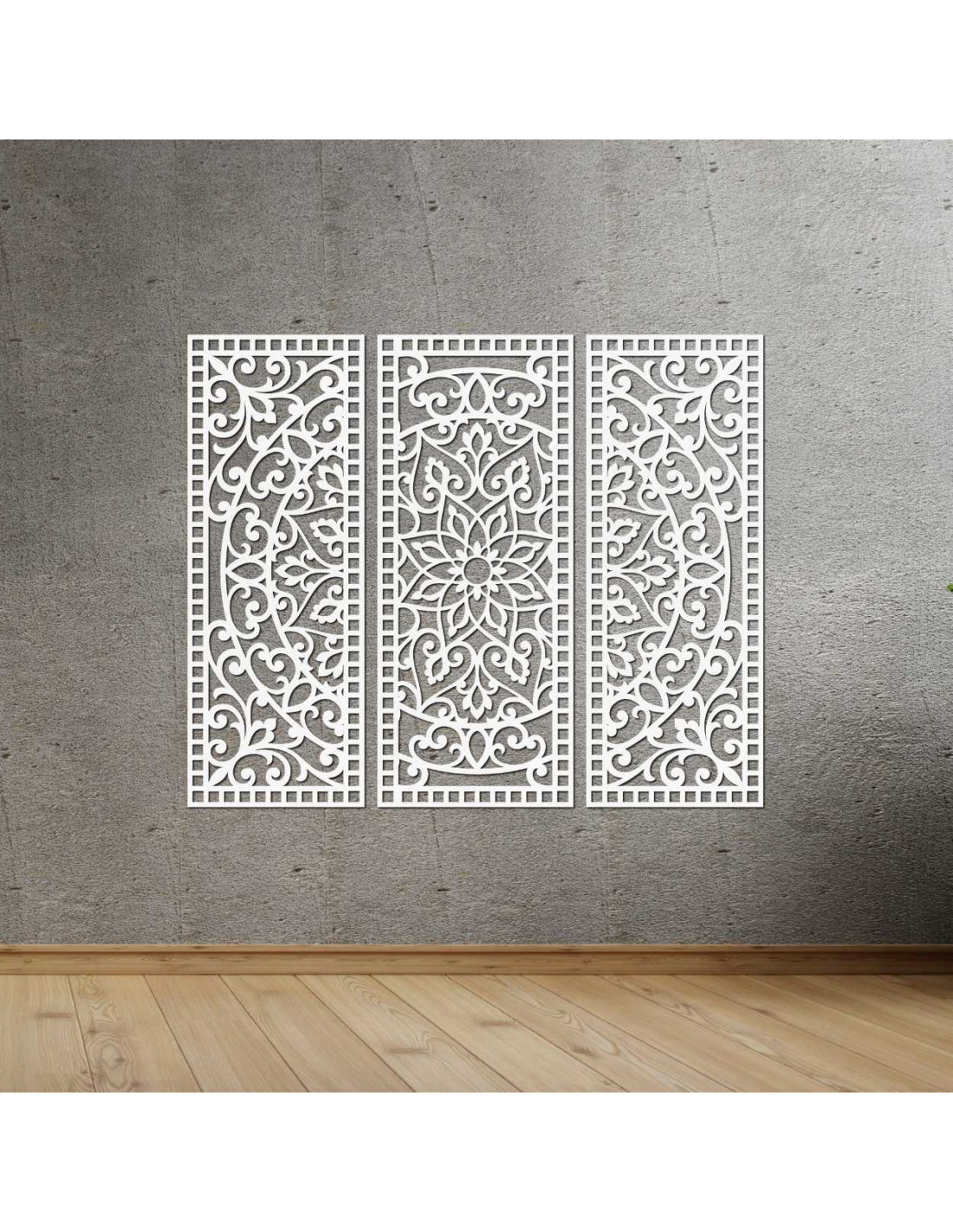 Eleganz, Ausgewogenheit und Präzision der Handarbeit vereinen sich in dem einzigartigen Kunstwerk Floral Mandala aus Holz – 3-teilige Boho-Wanddekoration . Die fein geschnitzten Details und die harmonische Komposition der drei Tafeln schaffen eine perfekte Balance zwischen Natur und Geometrie und verwandeln jeden Raum in einen Ort der Ruhe und Inspiration.