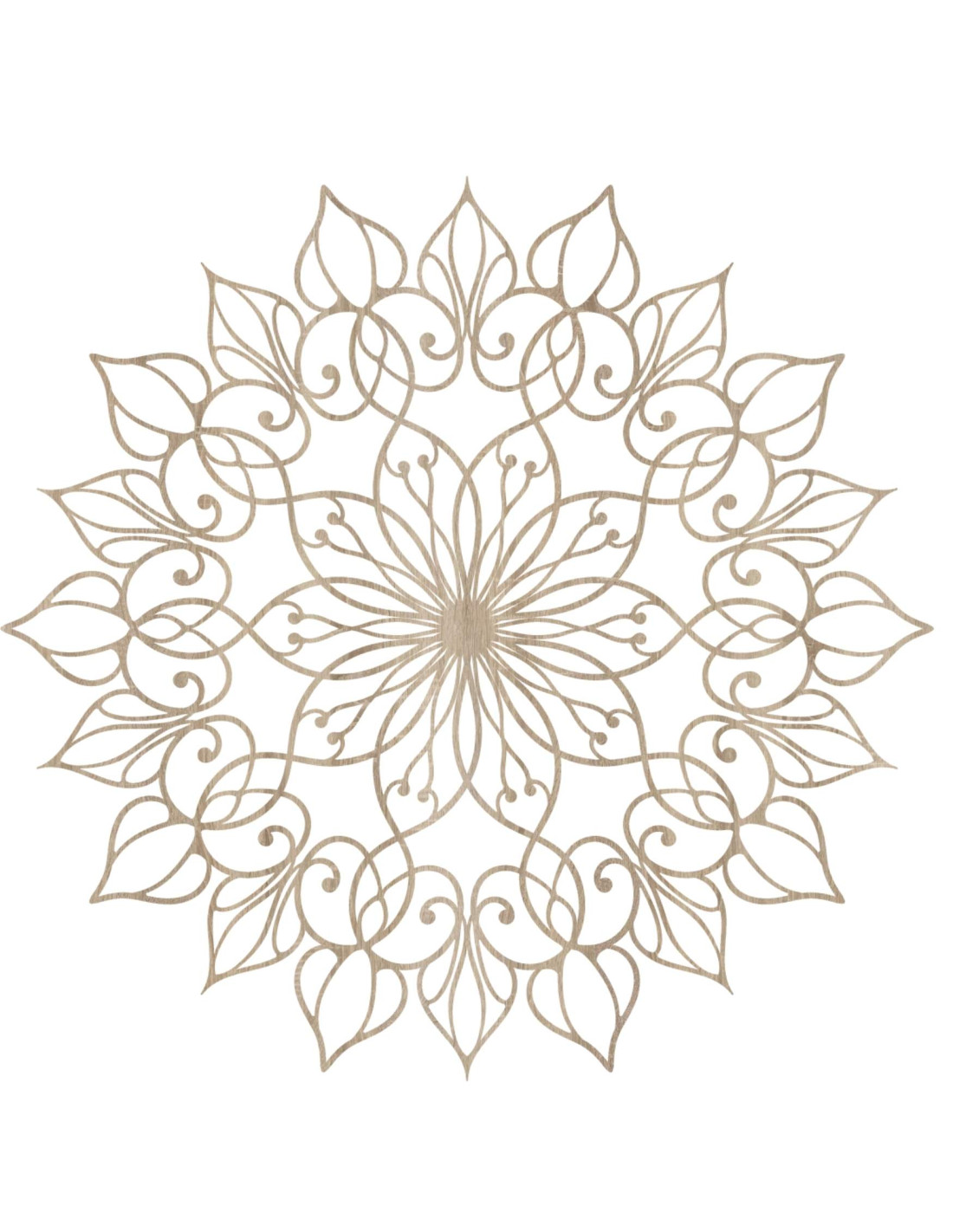 Diese einzigartige Wanddekoration zeigt das Mandala der Blume des Lebens mit einem präzise gearbeiteten, detailreichen Muster. Der goldene Farbton verleiht dem Raum eine luxuriöse, warme und harmonische Atmosphäre und macht sie zu einem unverwechselbaren Gestaltungselement in jedem Interieur.