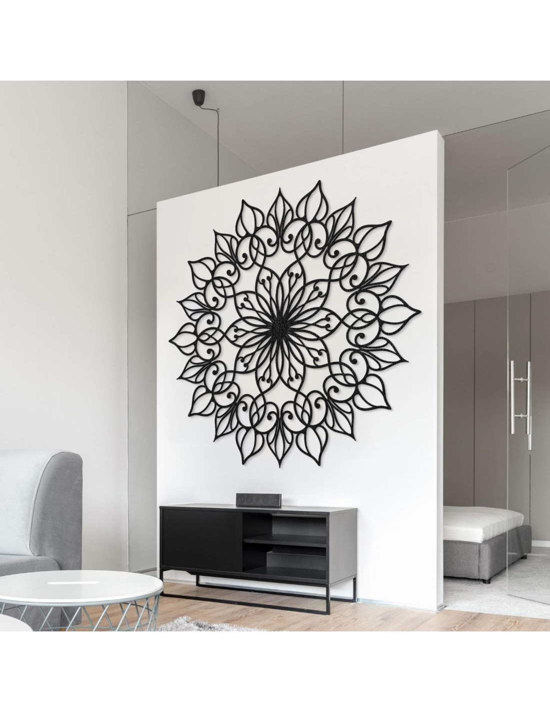 Das Mandala hat eine harmonische Wirkung und schafft eine ruhige, ausgeglichene Atmosphäre , ideal für moderne und minimalistische Räume.