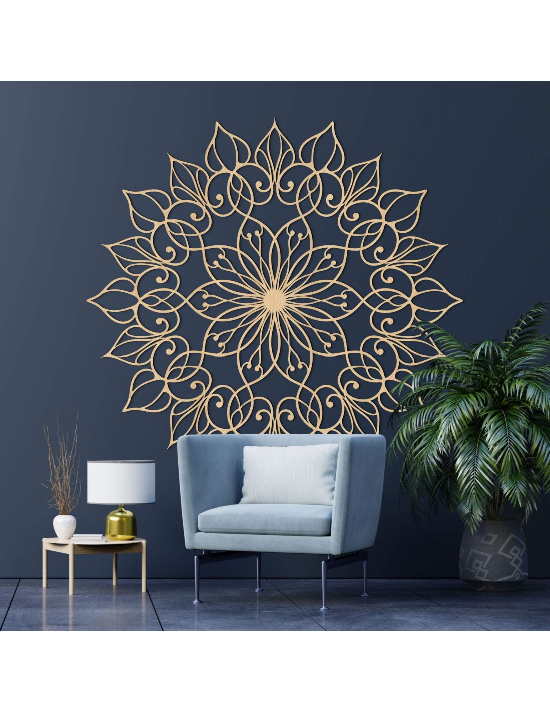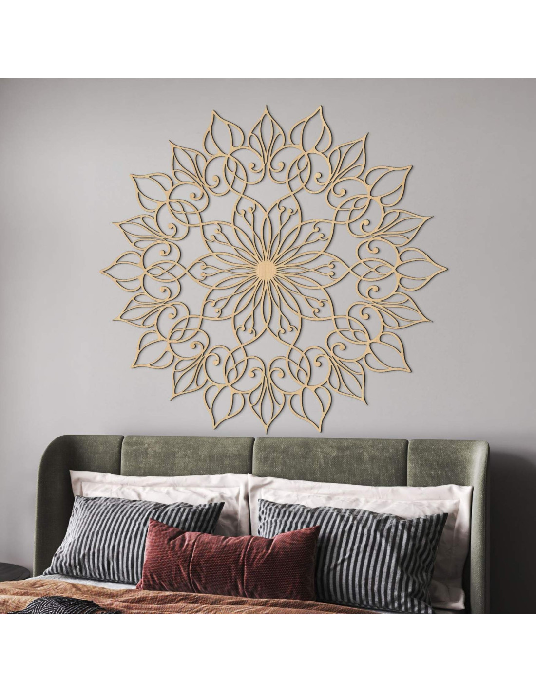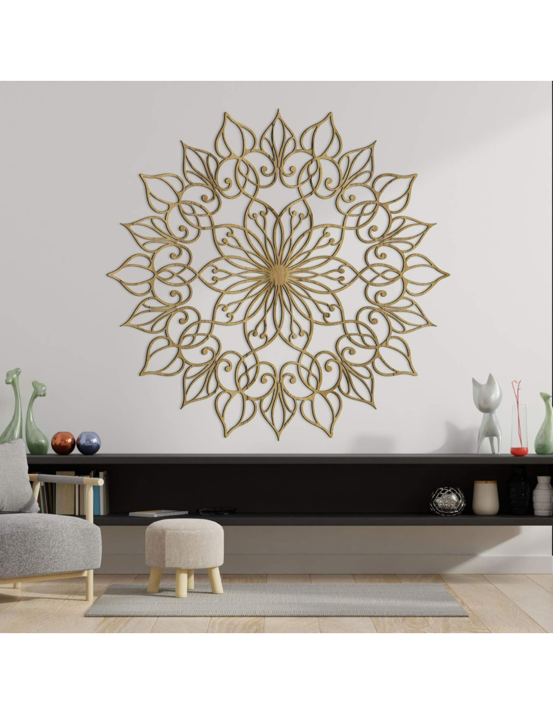 Diese einzigartige Wanddekoration zeigt das Mandala der Blume des Lebens mit einem präzise gearbeiteten, detailreichen Muster. Der goldene Farbton verleiht dem Raum eine luxuriöse, warme und harmonische Atmosphäre und macht sie zu einem unverwechselbaren Gestaltungselement in jedem Interieur.