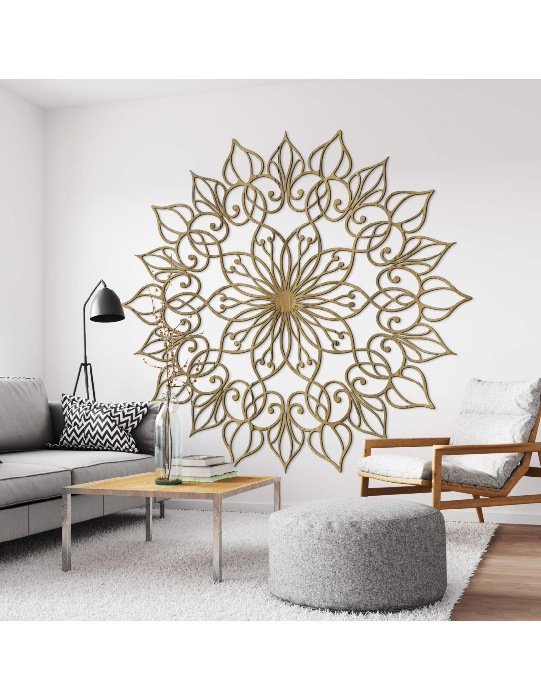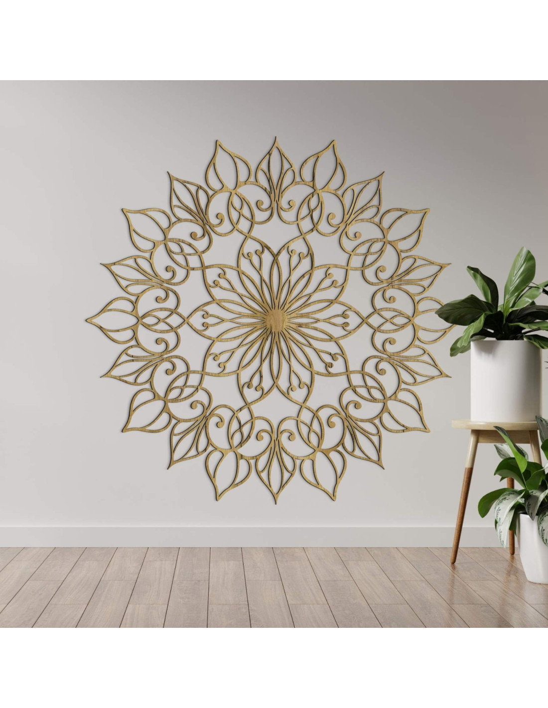 Diese einzigartige Wanddekoration zeigt das Mandala der Blume des Lebens mit einem präzise gearbeiteten, detailreichen Muster. Der goldene Farbton verleiht dem Raum eine luxuriöse, warme und harmonische Atmosphäre und macht sie zu einem unverwechselbaren Gestaltungselement in jedem Interieur.