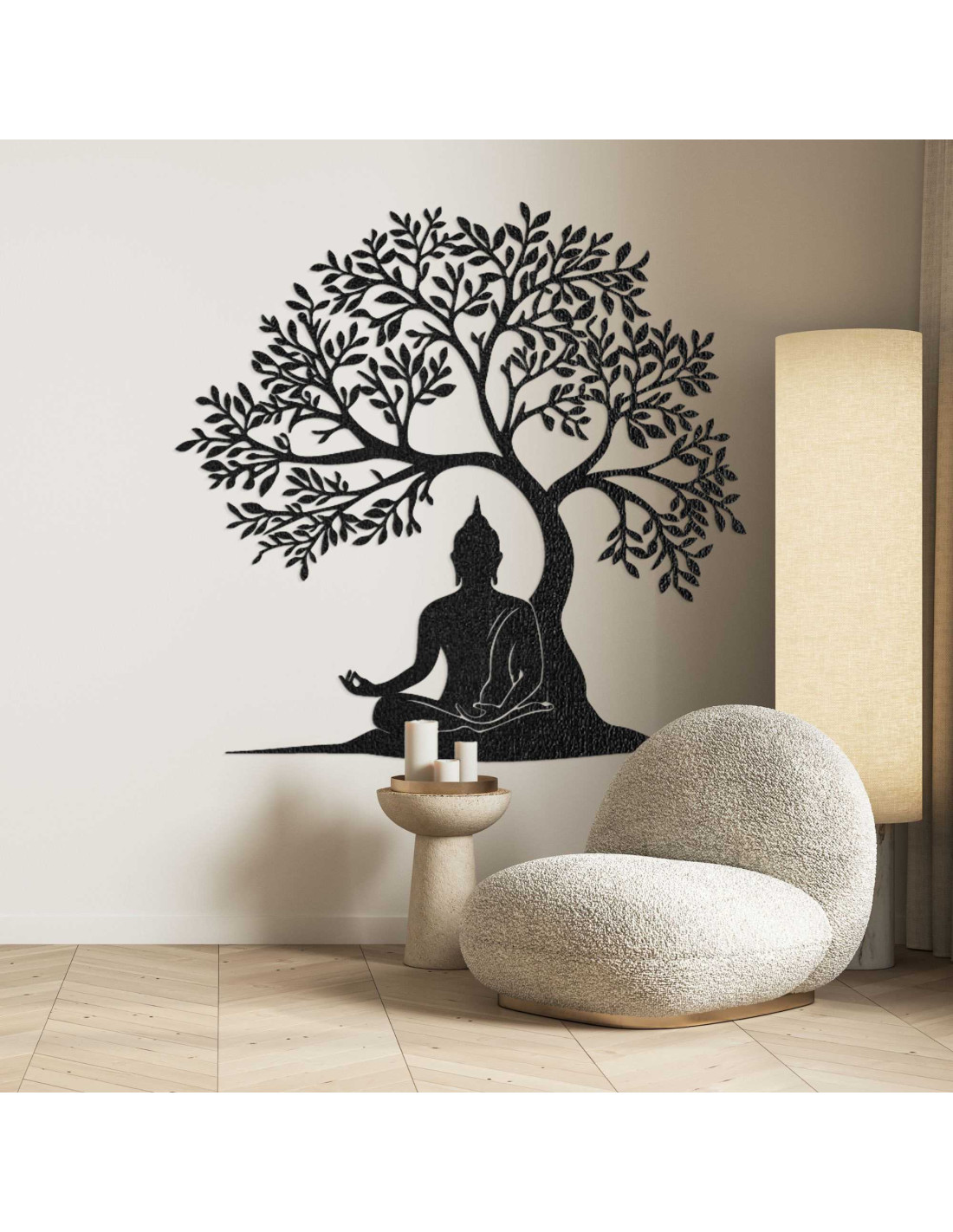 Das Design vereint Weisheit und natürliche Harmonie zu einer kunstvollen Komposition . Der Buddha in Lotusposition unter dem Baum symbolisiert die Erlangung der Erleuchtung . Die Dekoration erzeugt eine emotionale Atmosphäre ganz ohne Worte. Jedes Element hat seine eigene Bedeutung und Botschaft , die länger nachwirkt als ein flüchtiger Blick .