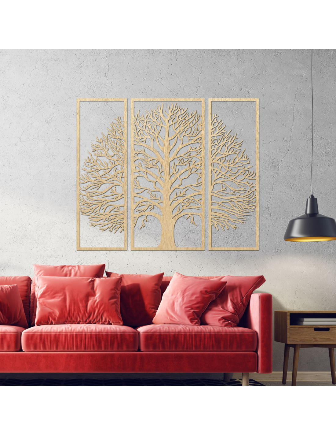 Die dreiteilige Dekoration in Form eines Lebensbaums aus Holz ist ein stilvolles und elegantes Accessoire, das jedes Interieur aufwertet.