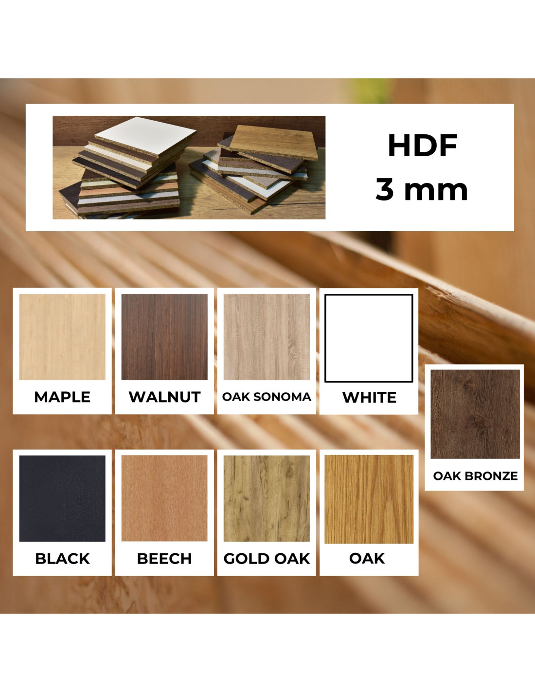 • Sperrholz hat eine Dicke von 5 mm / HDF hat eine Dicke von 3 mm.