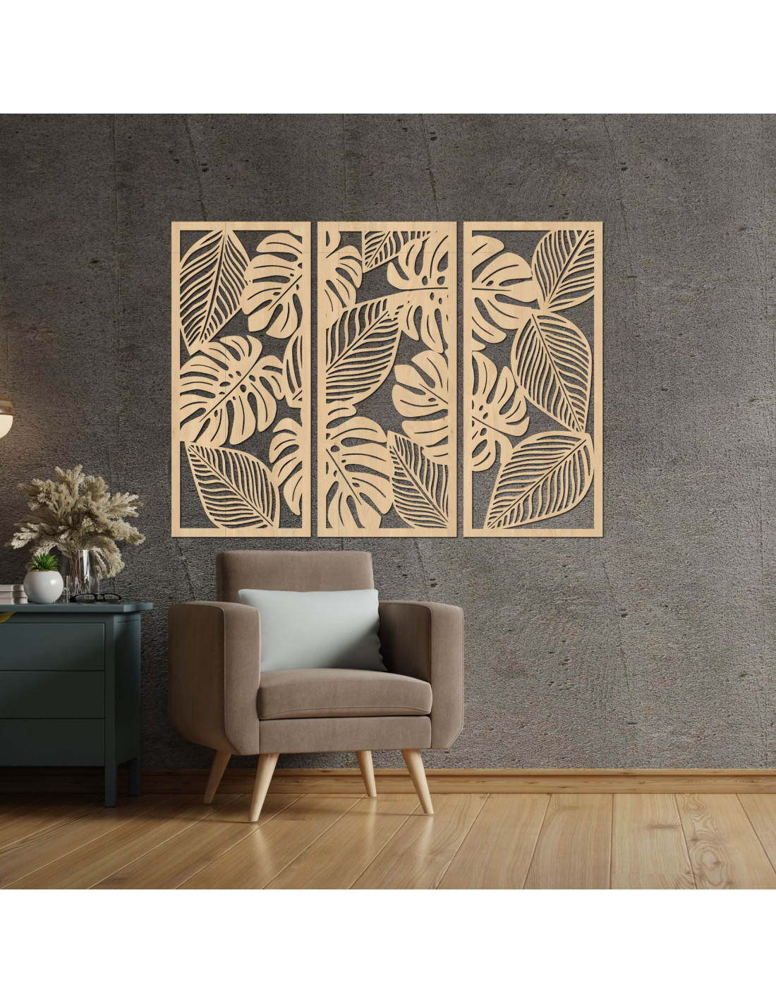 Erleben Sie natürliche Harmonie mit unserem dreiteiligen Wandbild aus Holz mit Monstera-Motiv .
