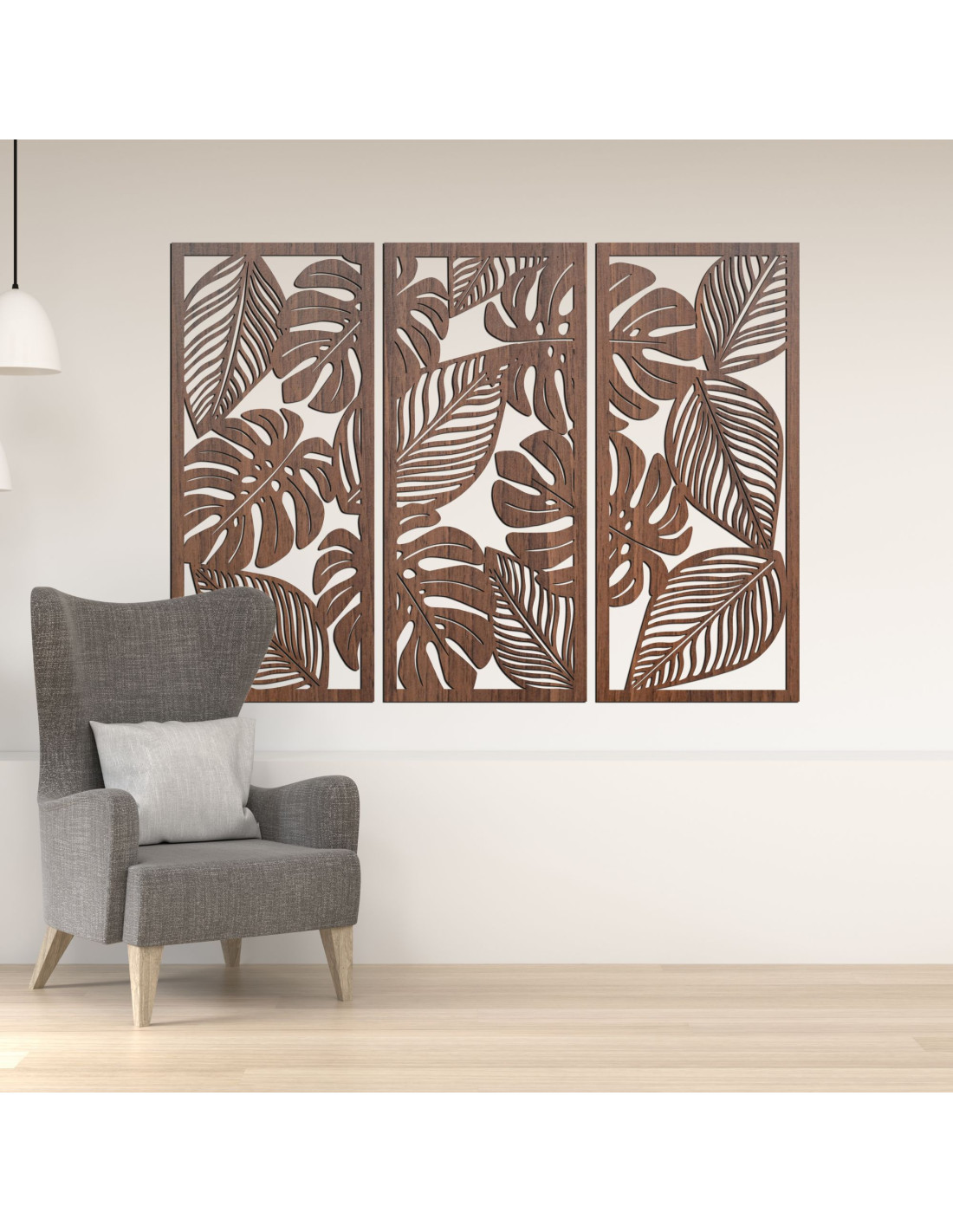 SentopVerleihen Sie Ihrem Interieur mit unserem dreiteiligen Wandbild aus Holz mit Monstera-Motiv neues Leben.