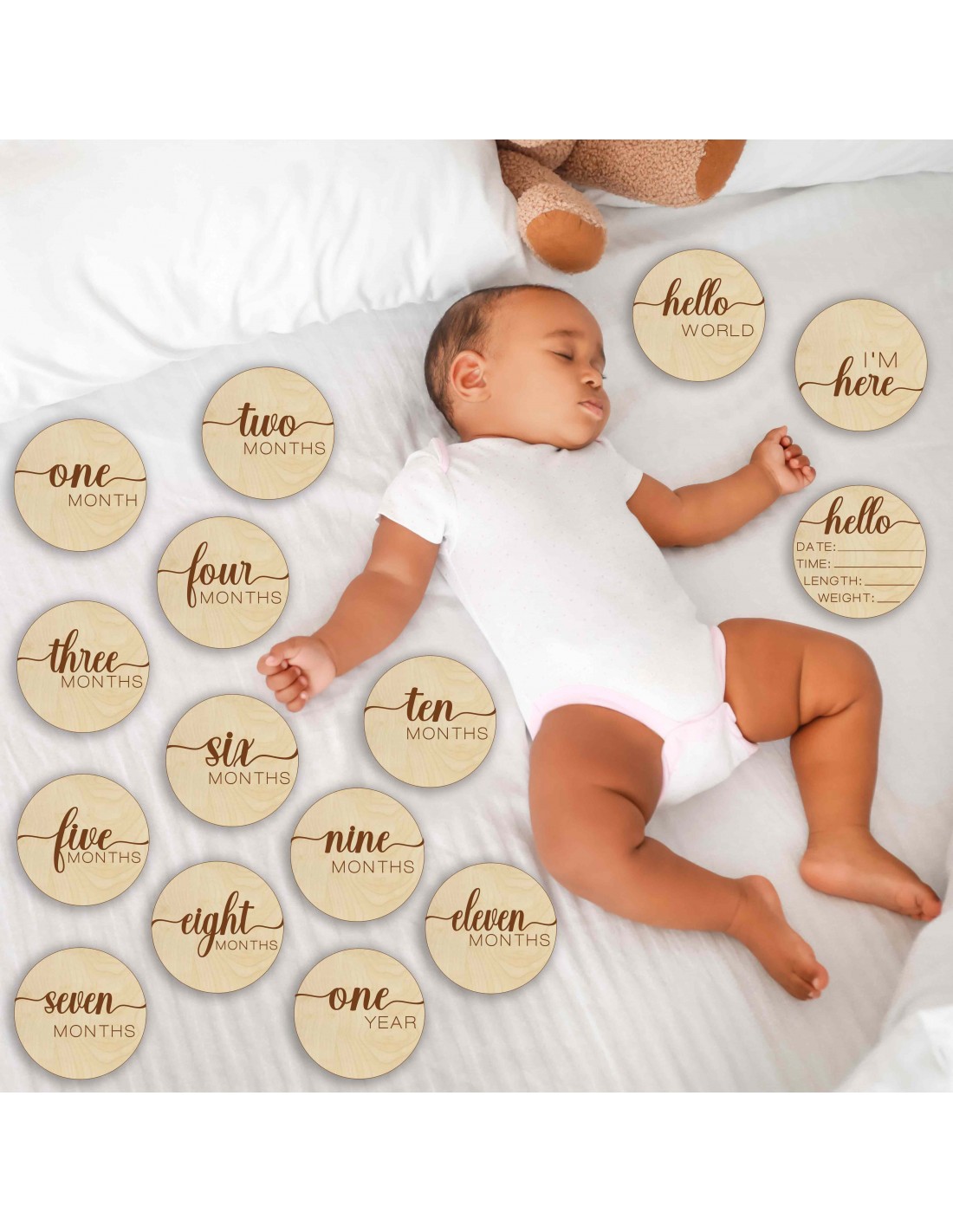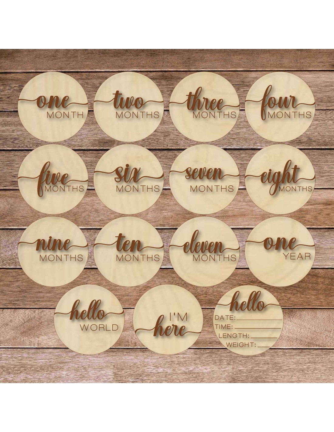 Das Set enthält 15 Holztafeln (1 Stück – 10 x 10 cm) , die sich perfekt dazu eignen, das Wachstum Ihres Babys im Laufe eines Jahres zu verfolgen.