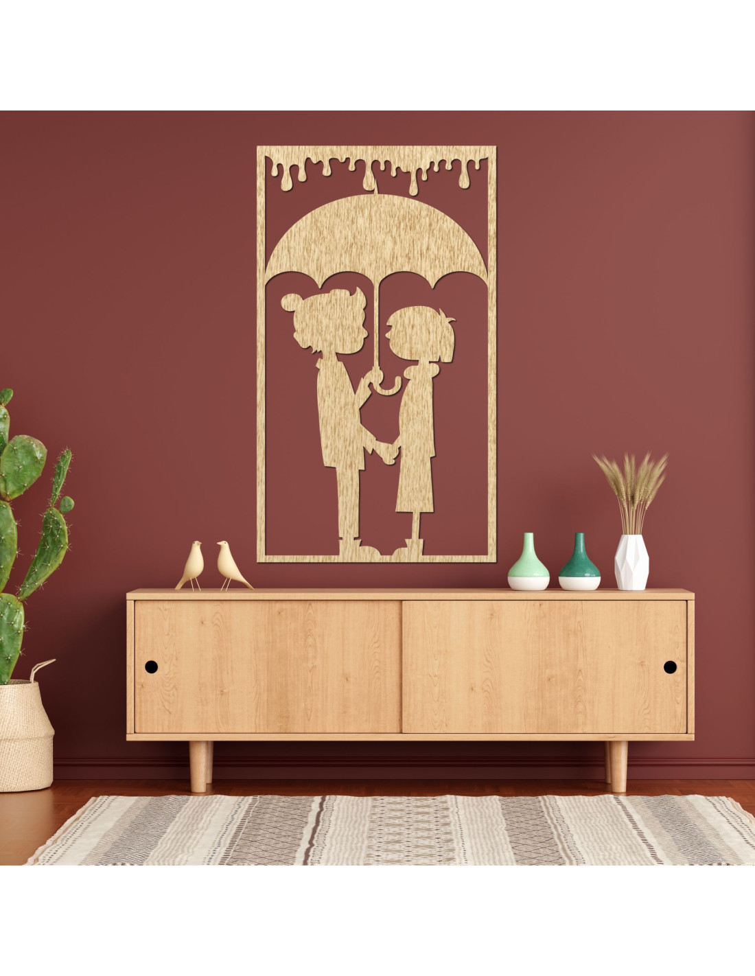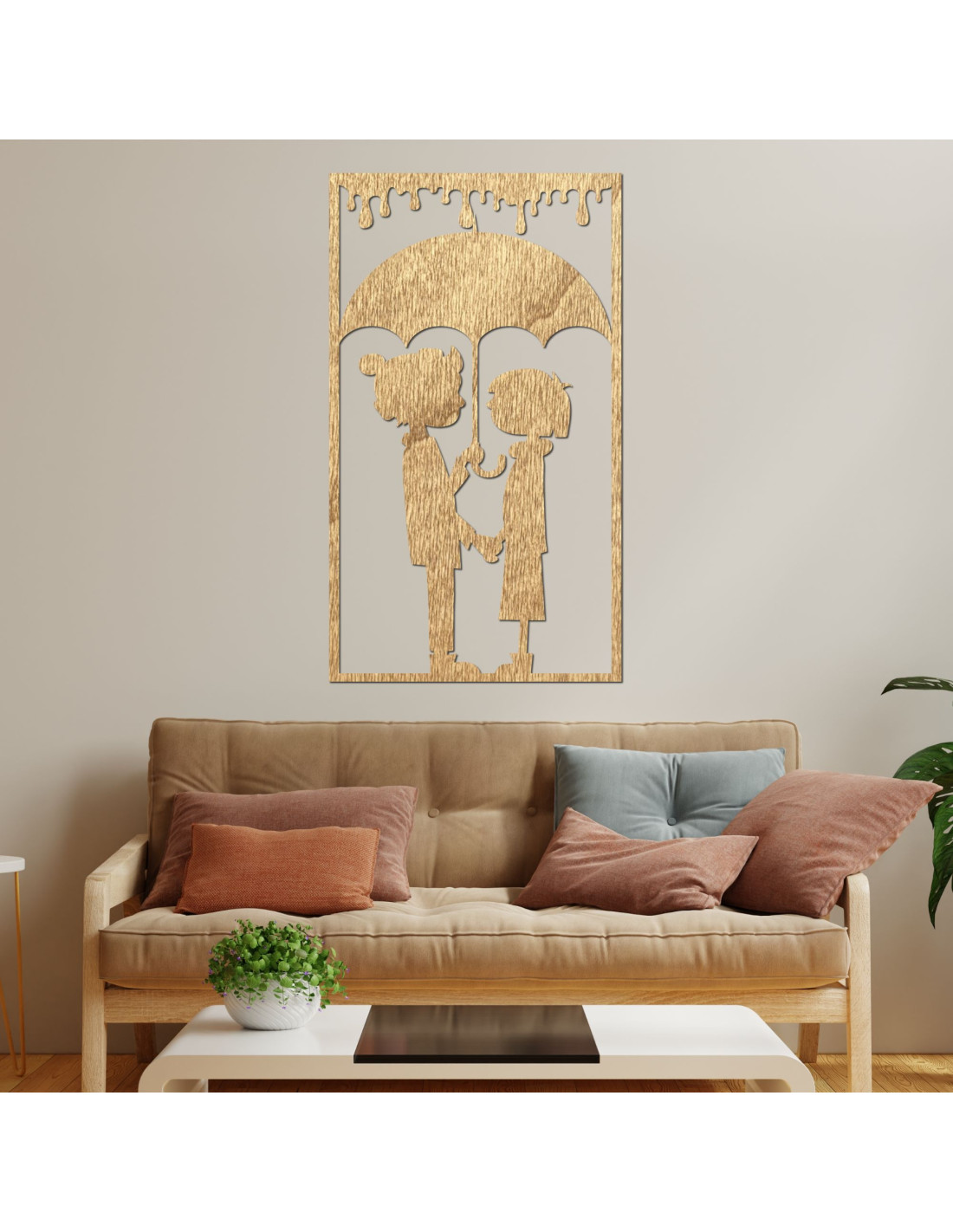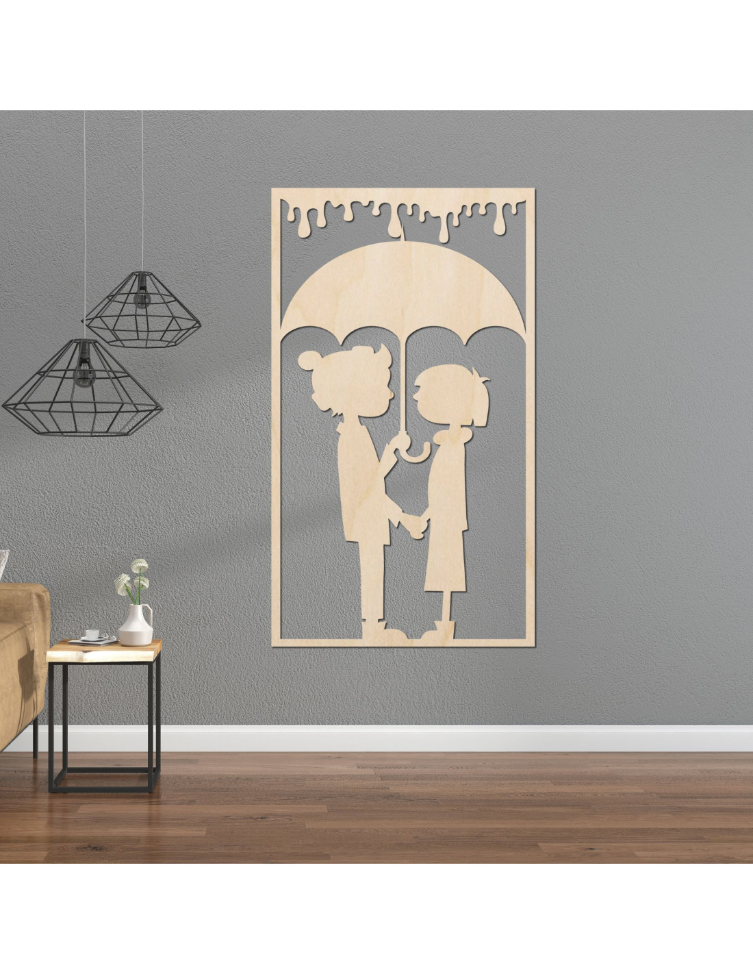 Die elegante Holzdekoration mit dem Motiv von Figuren unter einem Regenschirm verbindet Schlichtheit mit einer starken emotionalen Botschaft. Diese Wanddekoration ist geeignet, um Gefühle wie Liebe, Unterstützung oder Zusammengehörigkeit auszudrücken. Außerdem bringt das natürliche Material ein Gefühl von Wärme und Authentizität in den Raum. Sie eignet sich sowohl für moderne als auch für rustikale Innenräume, wo sie eine harmonische Atmosphäre schafft.