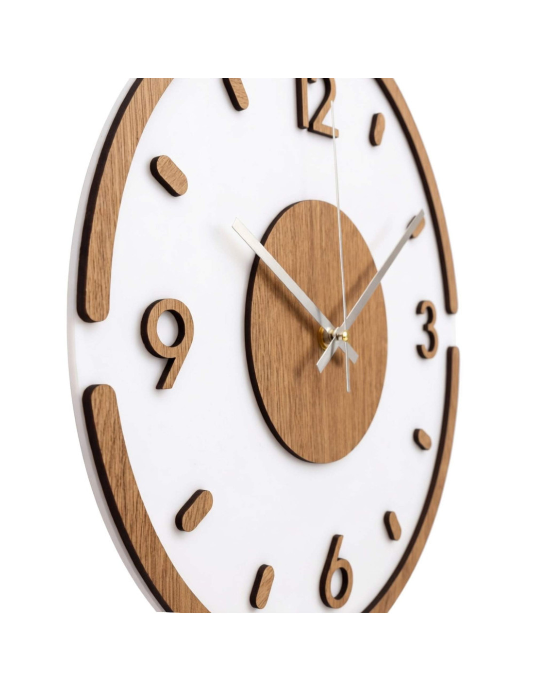 Die Uhr besteht aus einer hochwertigen HDF-Platte mit Eichenmuster, kombiniert mit glänzendem und elegantem weißem Plexiglas.
