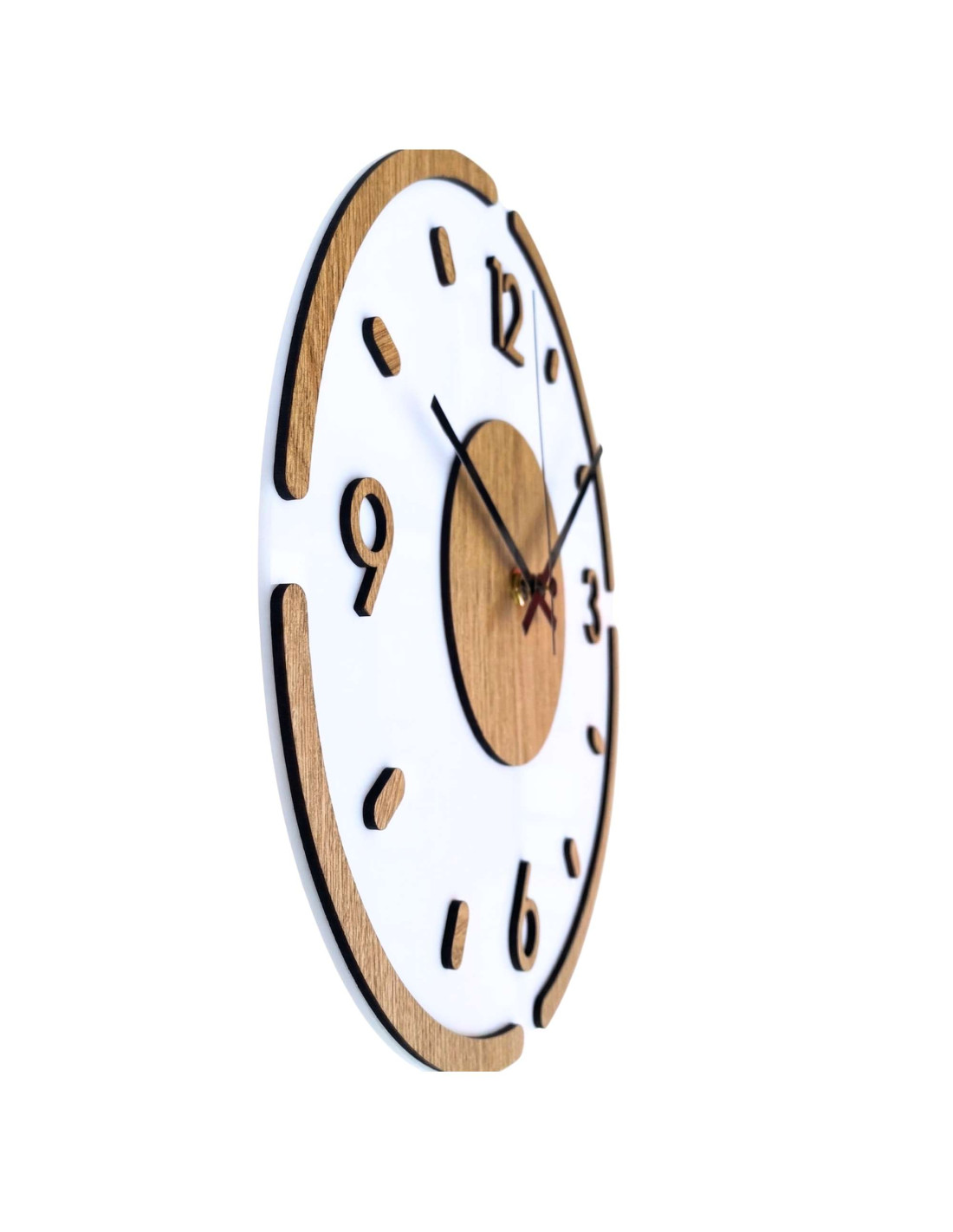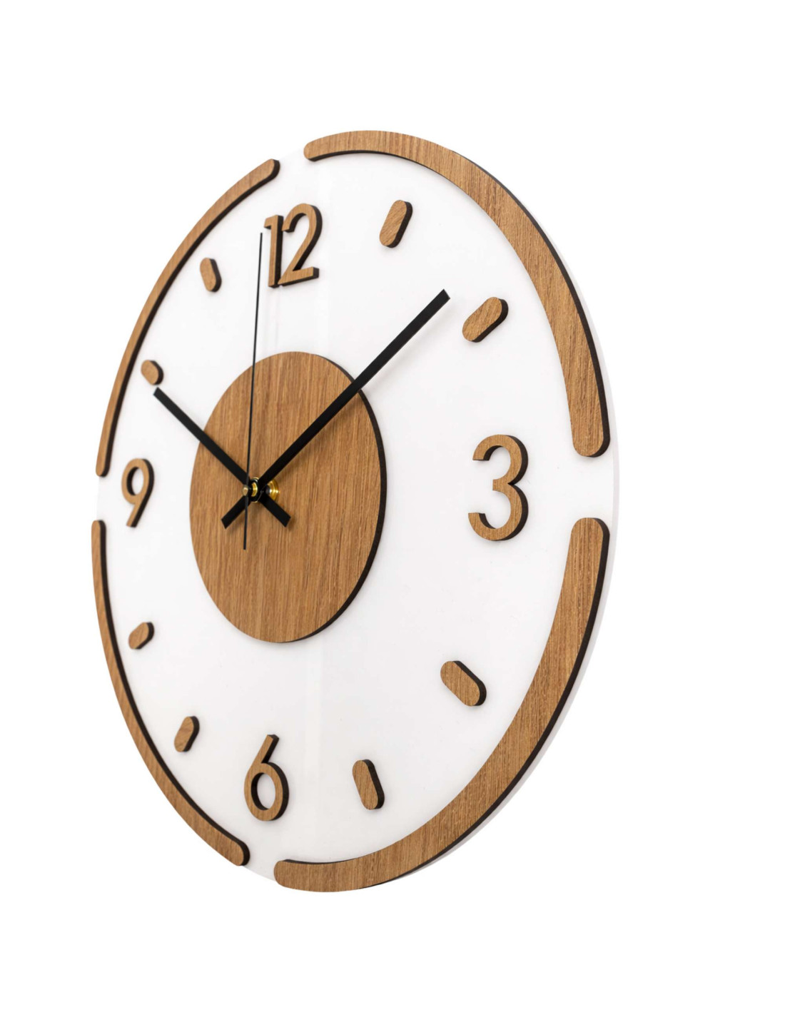 Die Uhr besteht aus einer hochwertigen HDF-Platte mit Eichenmuster, kombiniert mit glänzendem und elegantem weißem Plexiglas.