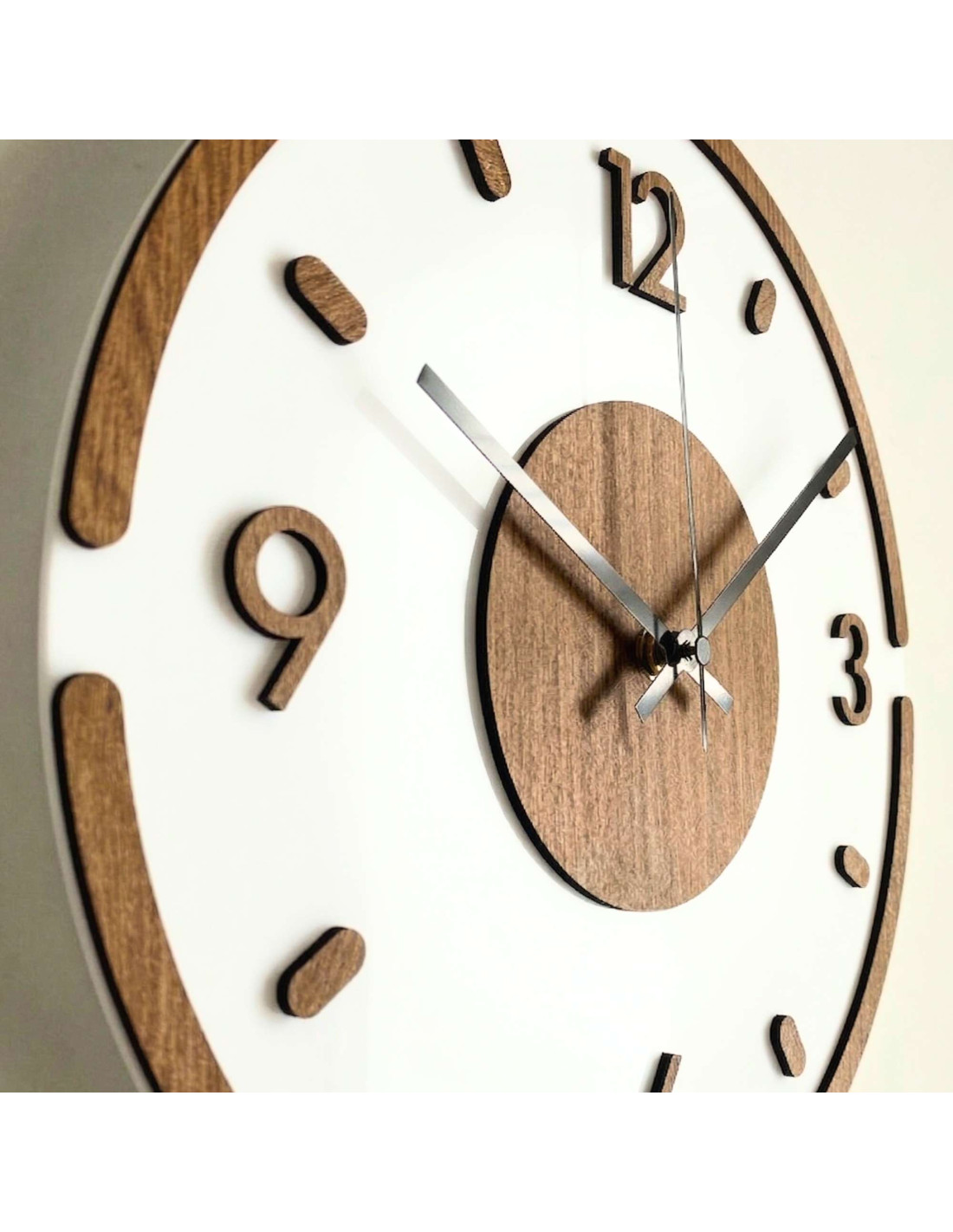 Die Uhr besteht aus einer hochwertigen HDF-Platte mit Eichenmuster, kombiniert mit glänzendem und elegantem weißem Plexiglas.