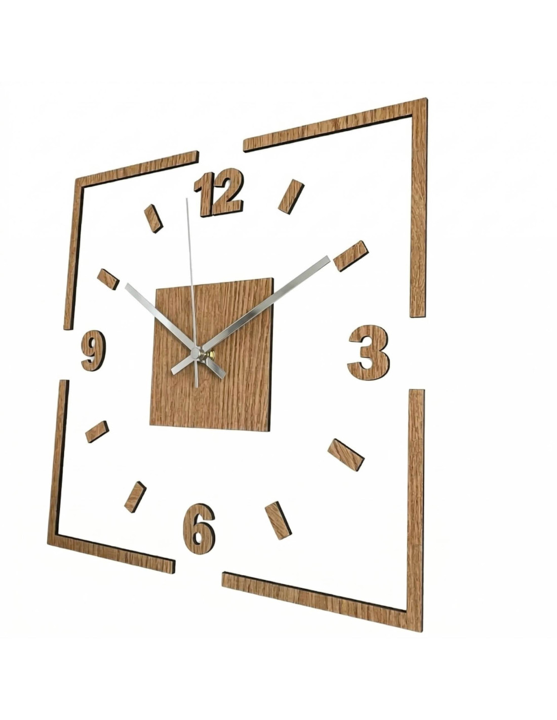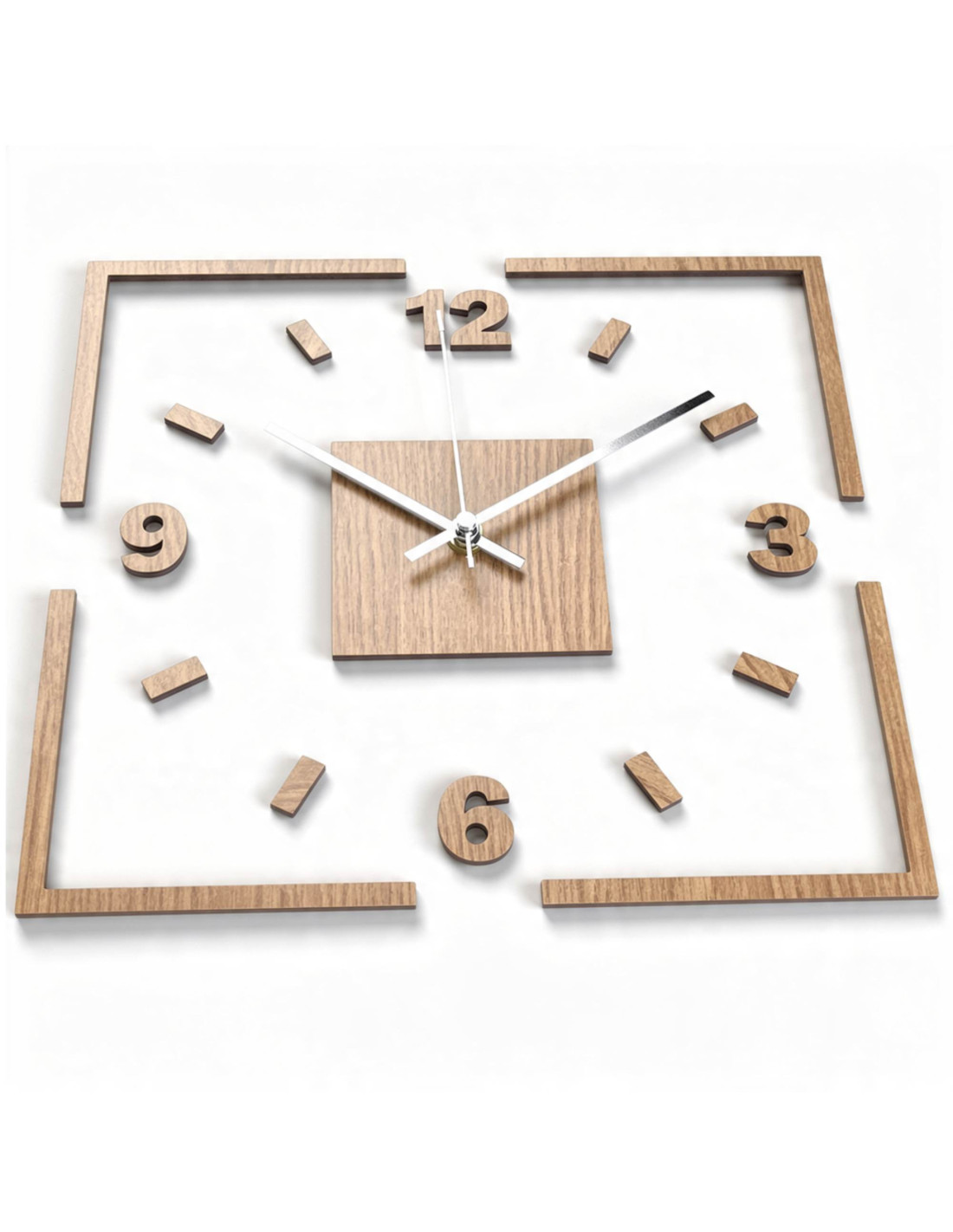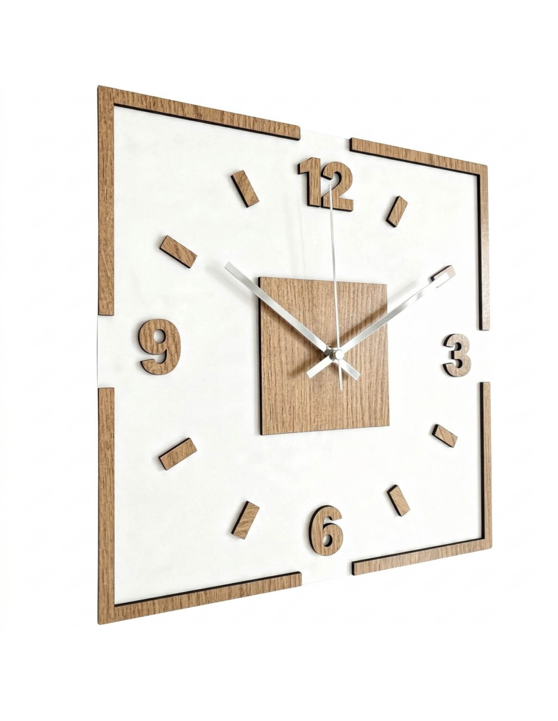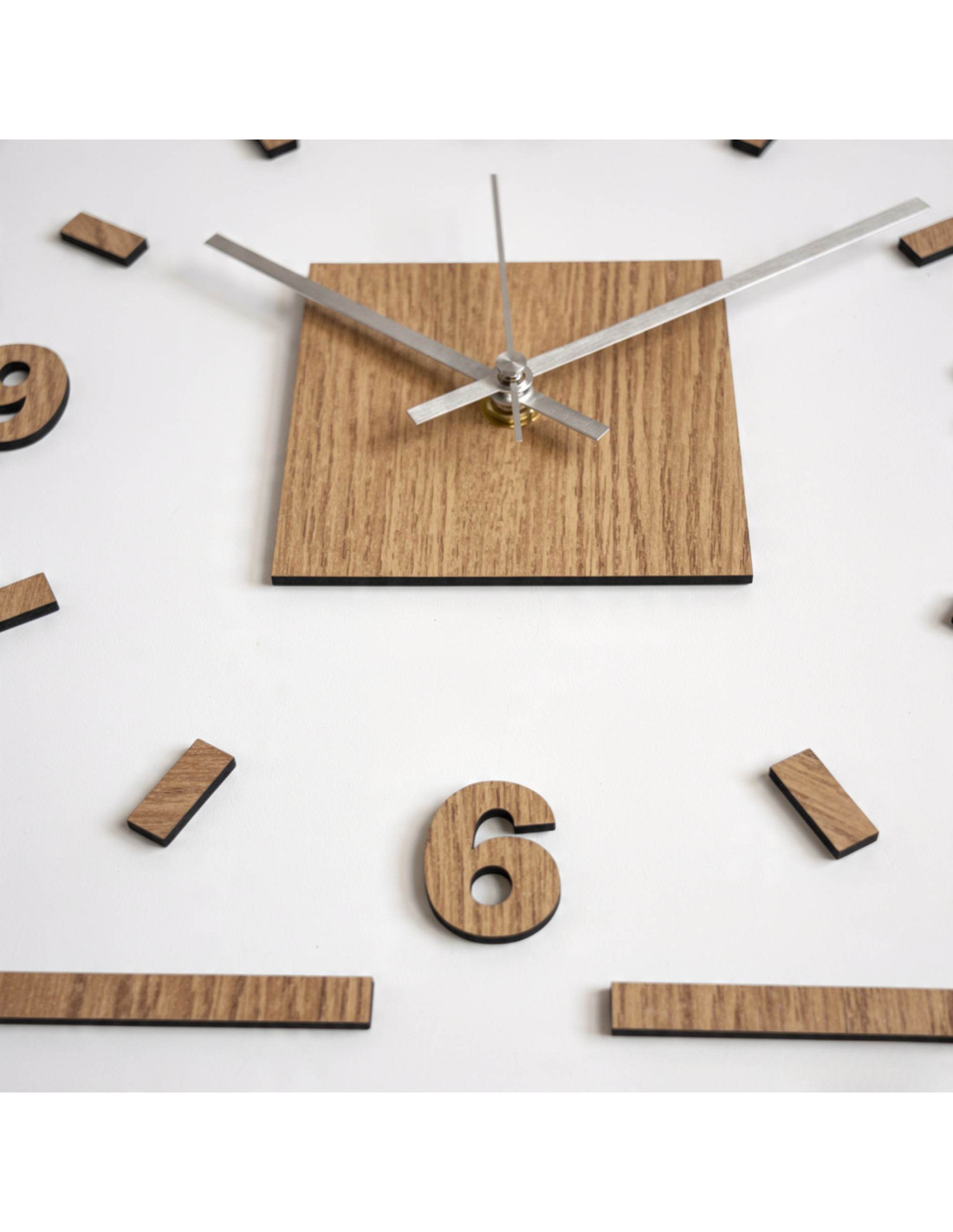 Das Zentrum der Uhr wird durch ein Eichenquadrat hervorgehoben, aus dem schwarze oder silberne Zeiger für perfekten Kontrast und optimale Ablesbarkeit hervortreten.