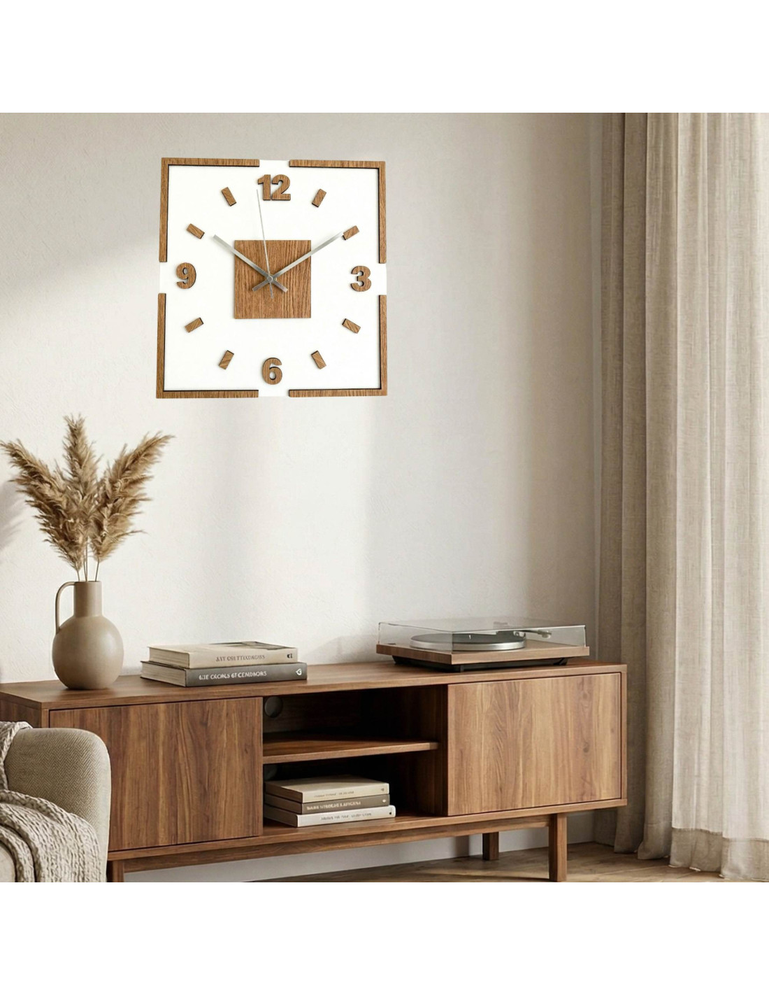 Moderne quadratische Wanduhr mit Eichendekor und weißem Hintergrund