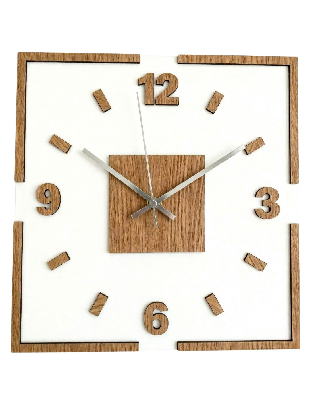 Moderne quadratische Wanduhr mit Eichendekor und weißem Plexiglas .