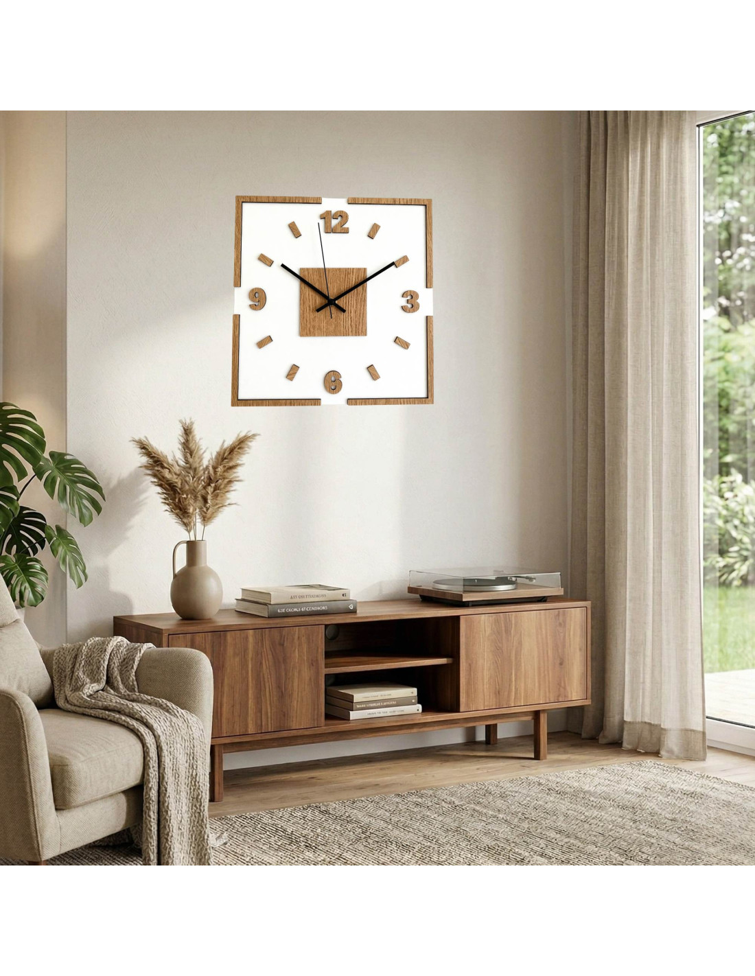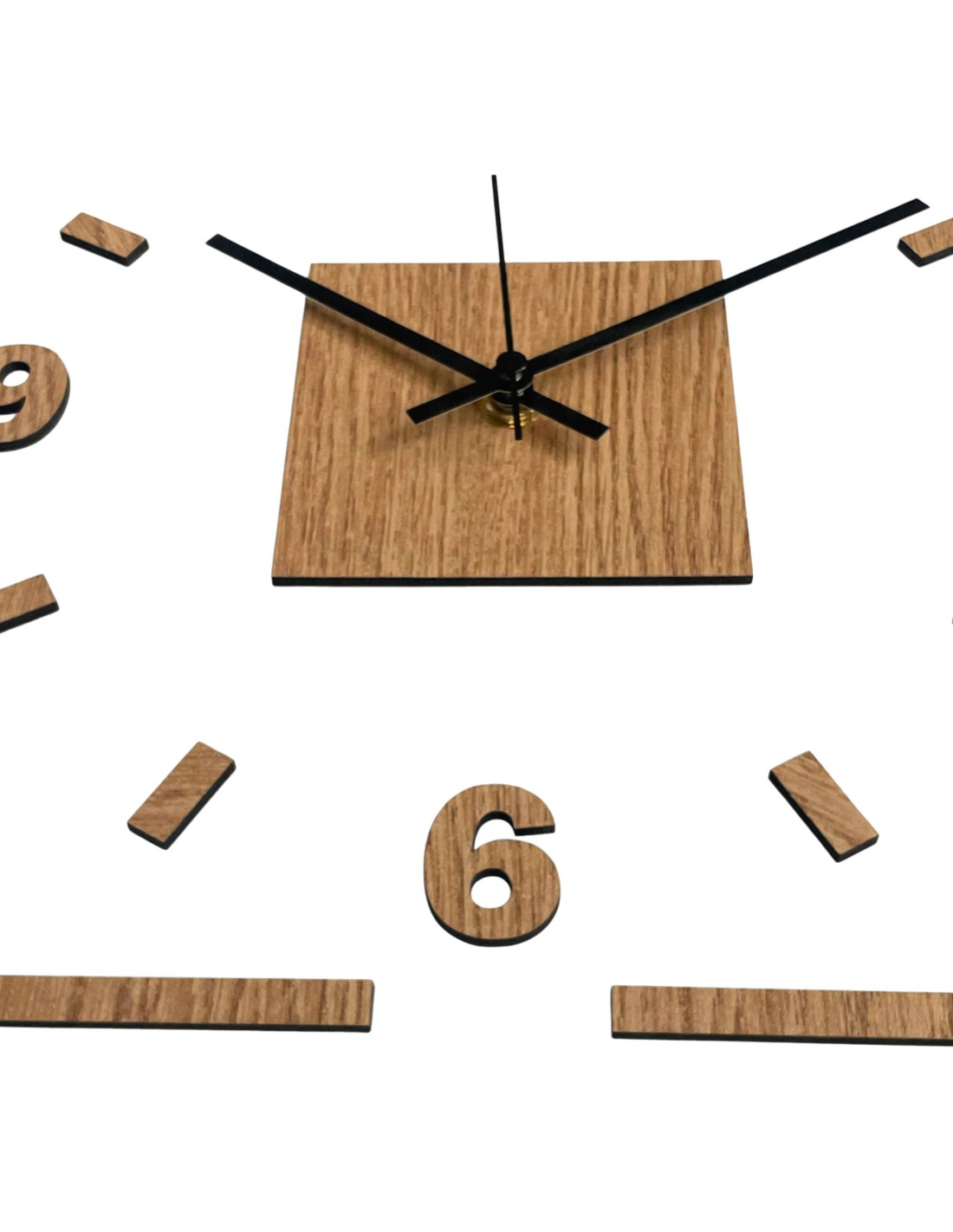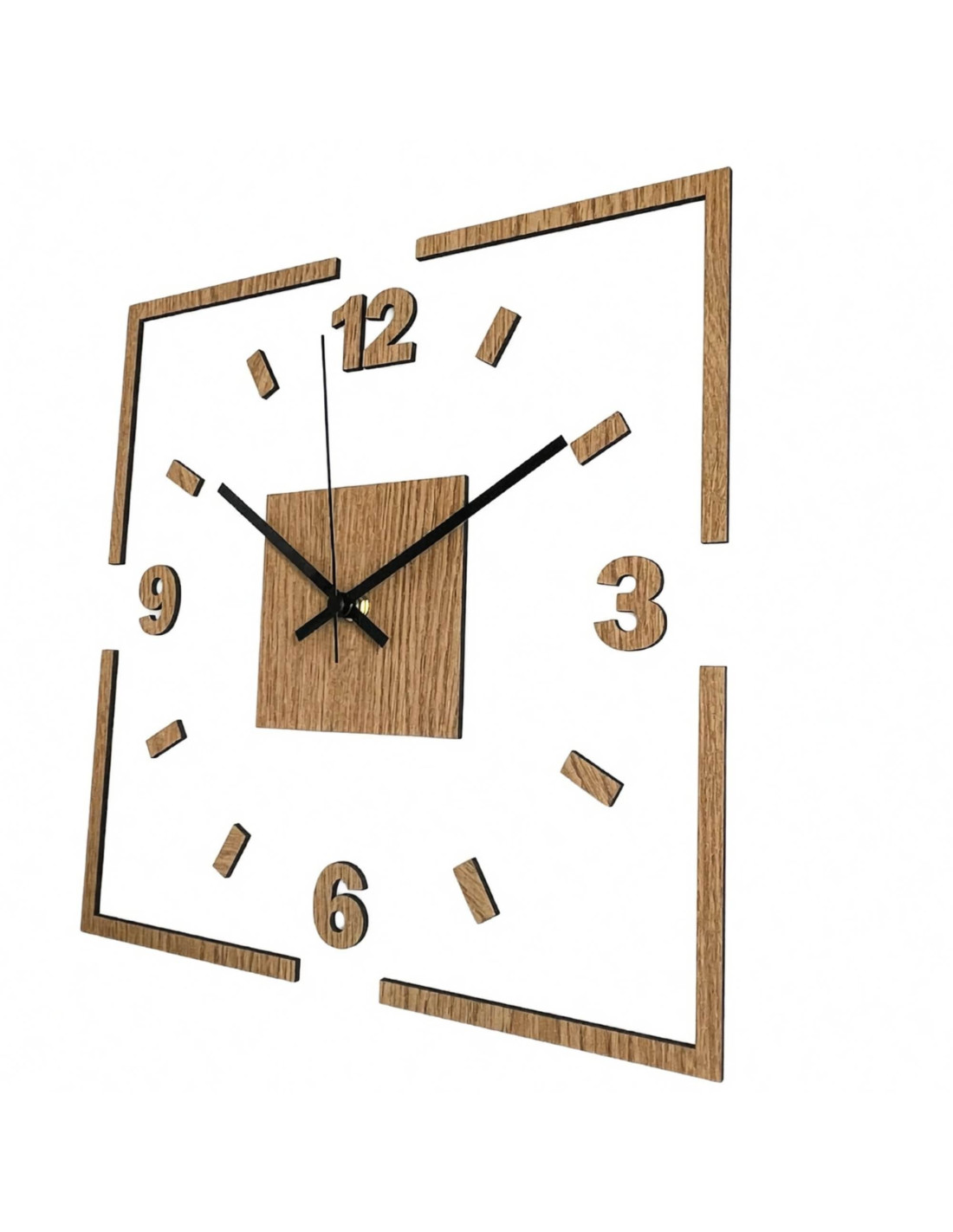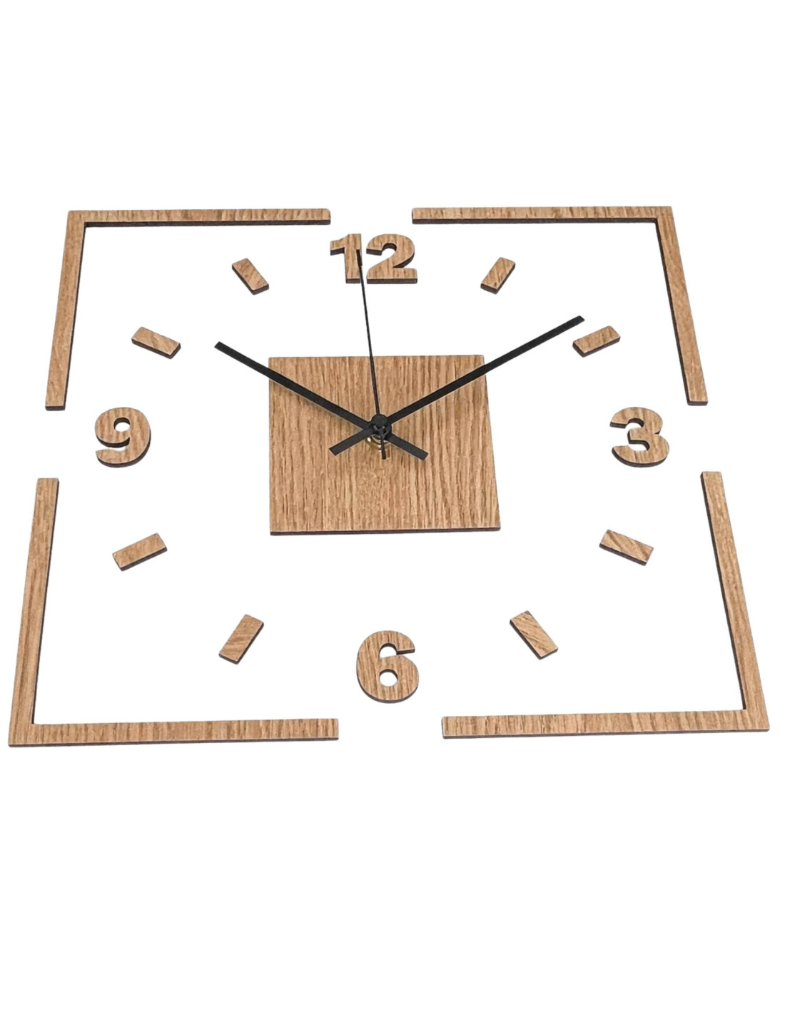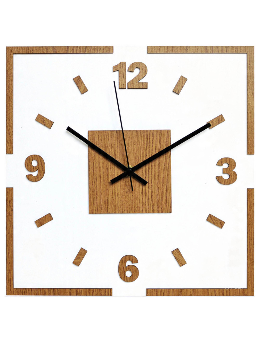 Moderne quadratische Wanduhr mit Eichendekor und weißem Hintergrund