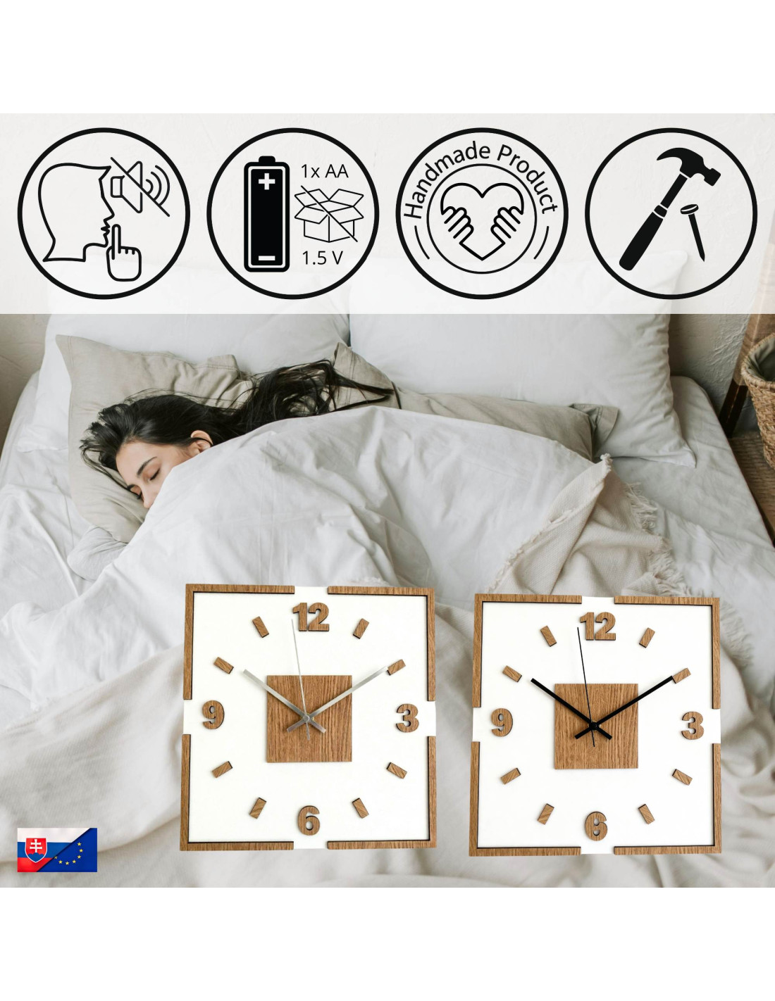 Das Zentrum der Uhr wird durch ein Eichenquadrat hervorgehoben, aus dem schwarze oder silberne Zeiger für perfekten Kontrast und optimale Ablesbarkeit hervortreten.
