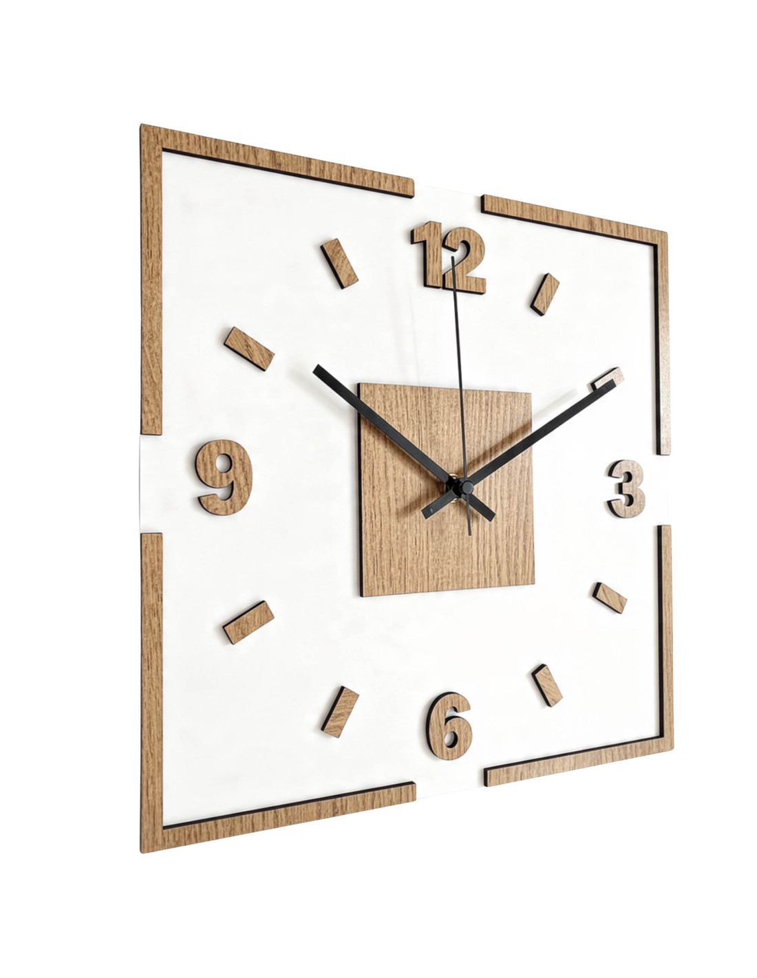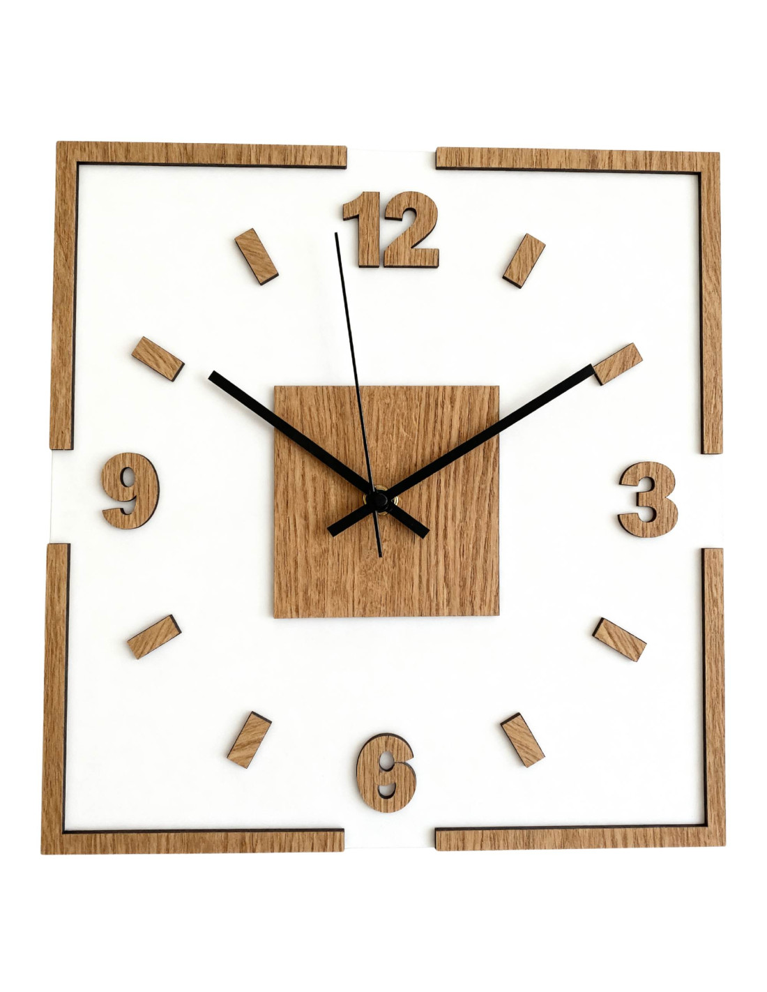 Moderne quadratische Wanduhr mit Eichendekor und weißem Plexiglas .