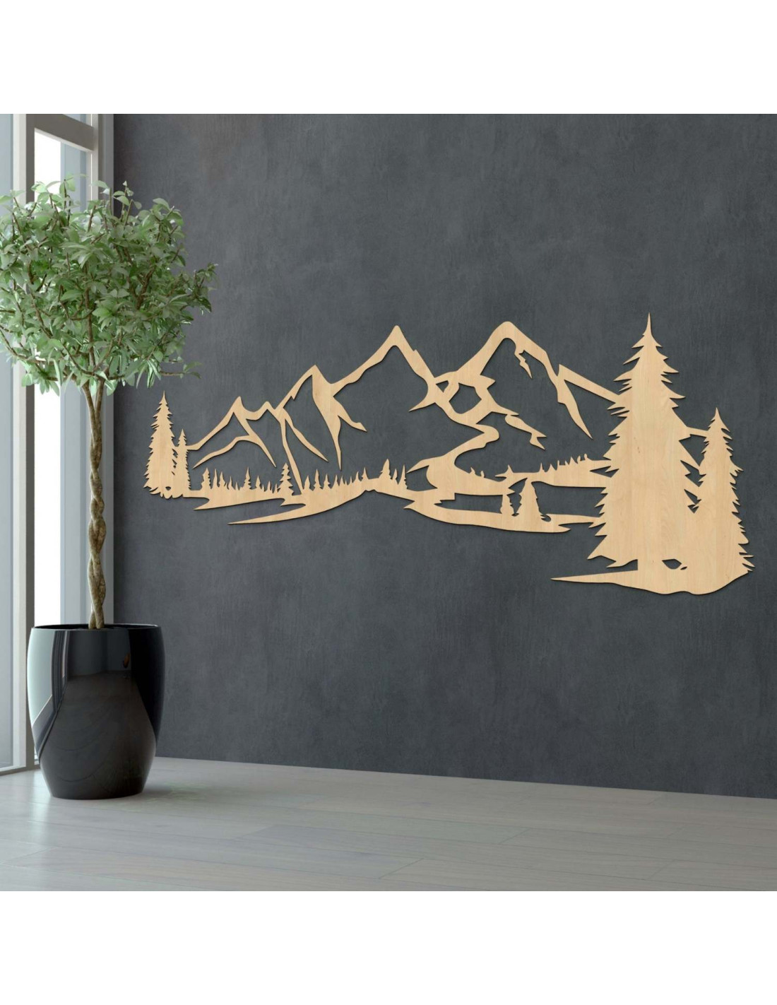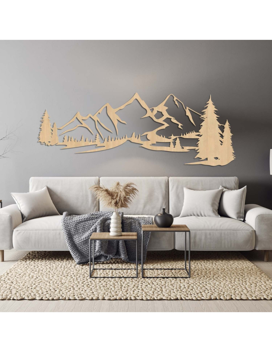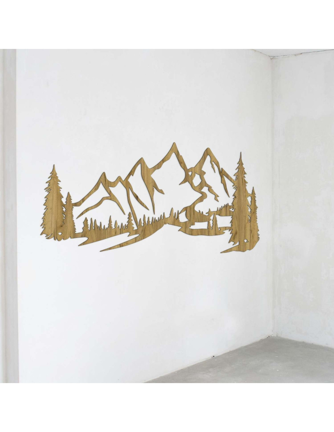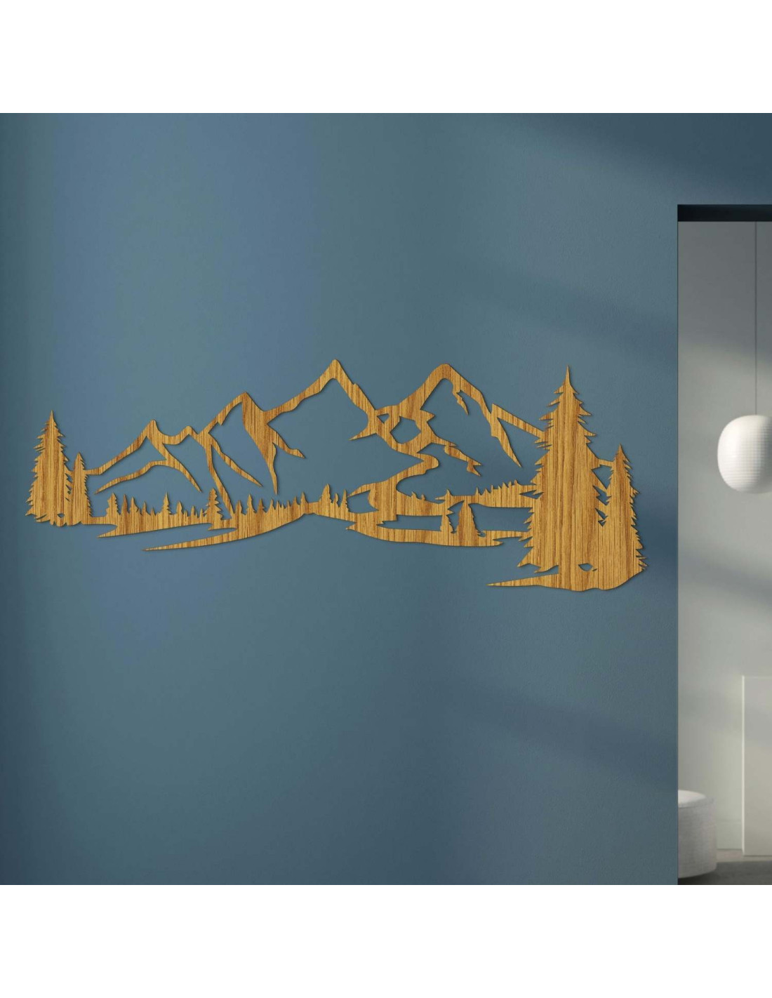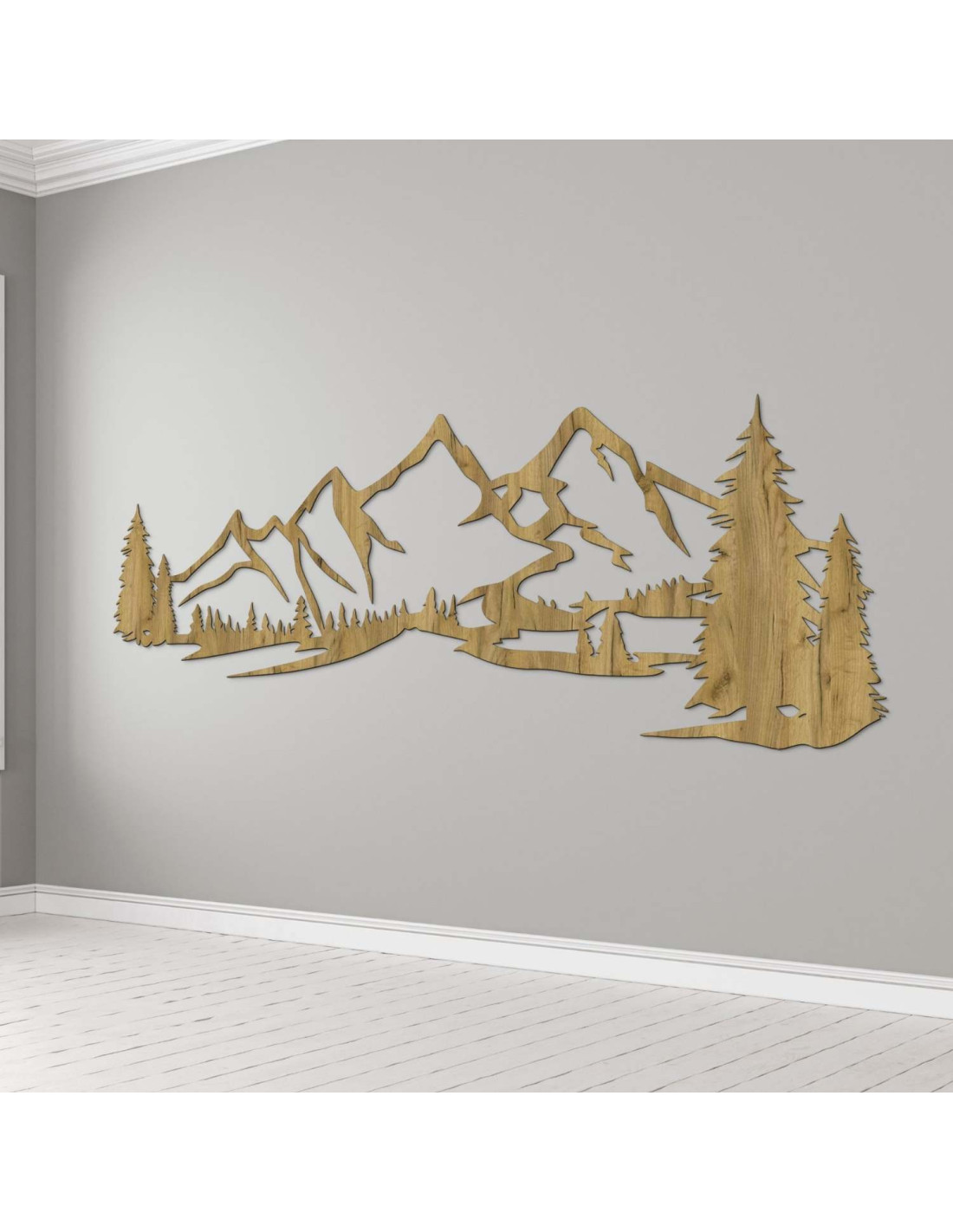 Die Kombination aus Berglandschaften, Nadelbäumen und präzisem Laserschnitt schafft eine unverwechselbare, dominante Ästhetik, die im Wohnzimmer, Schlafzimmer, Arbeitszimmer und Flur wunderschön zur Geltung kommt.