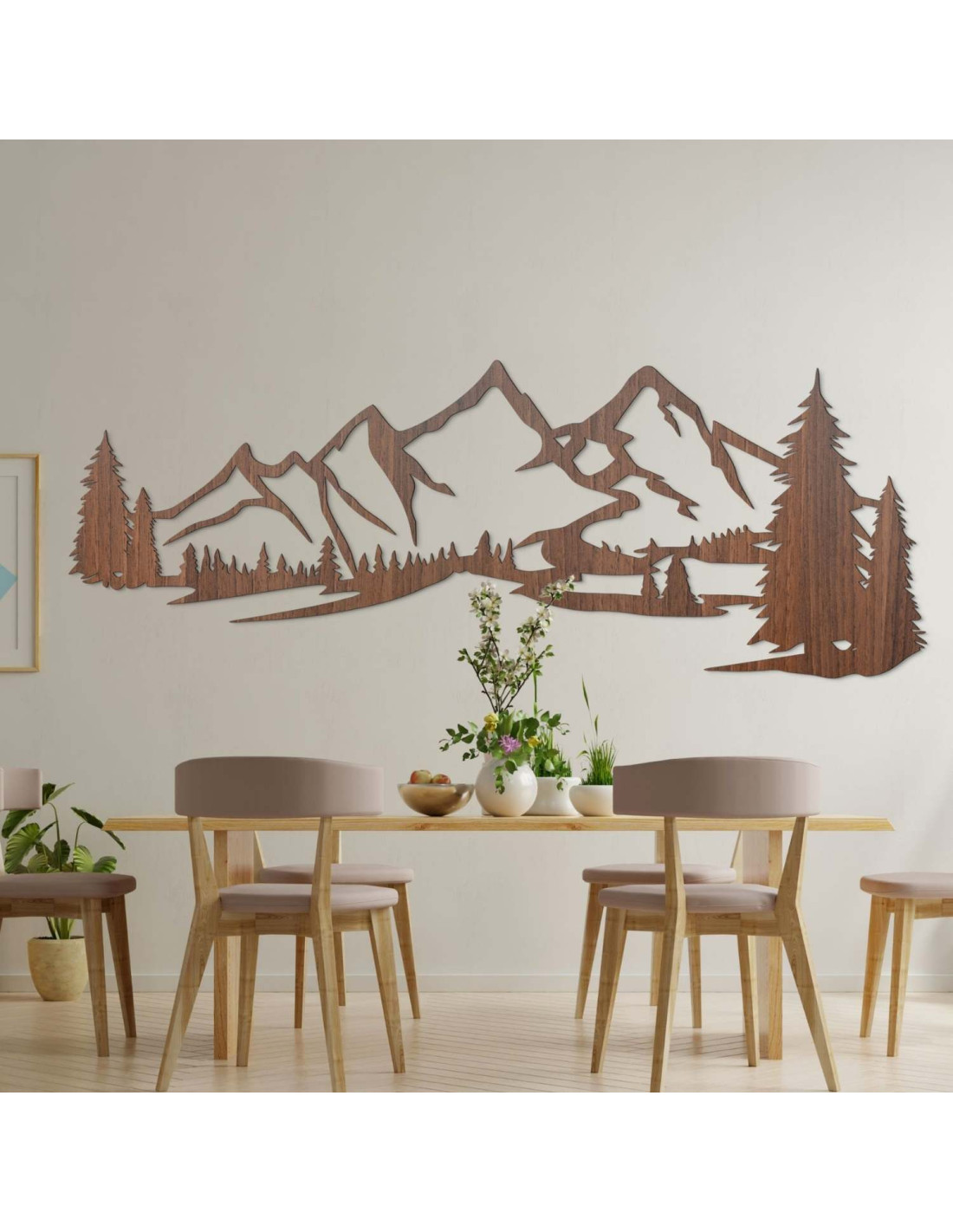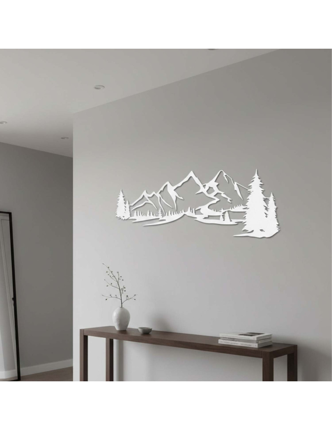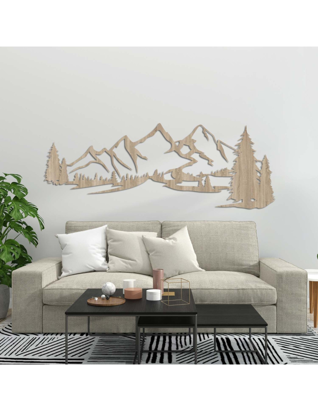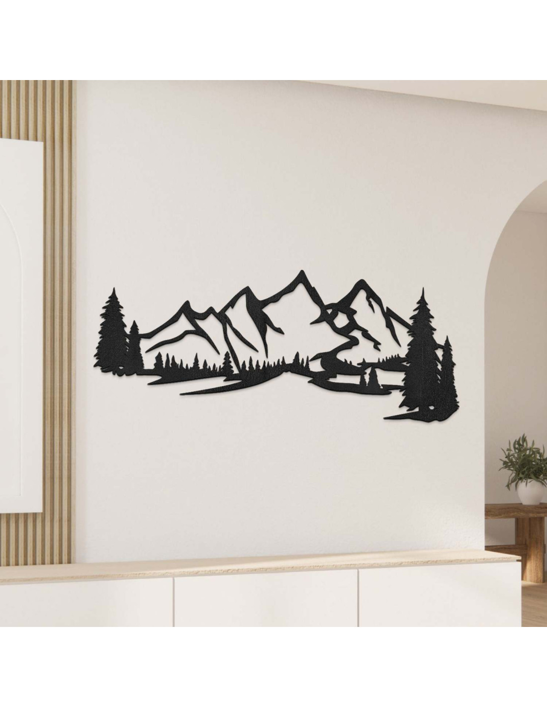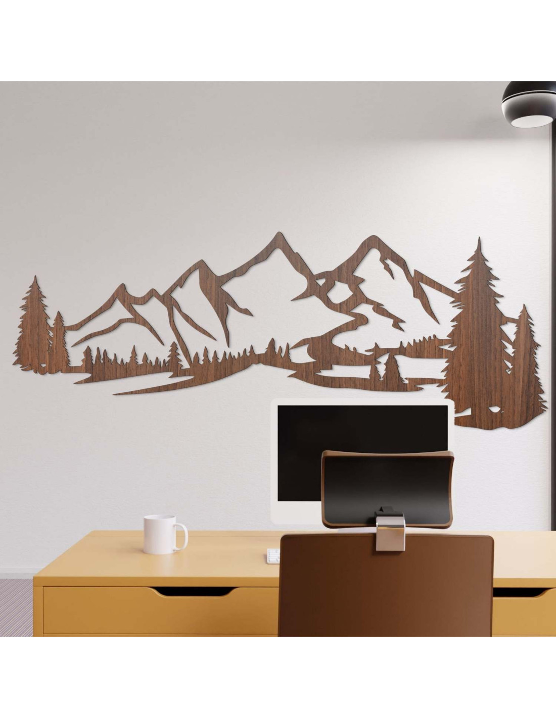 Die Kombination aus Berglandschaften, Nadelbäumen und präzisem Laserschnitt schafft eine unverwechselbare, dominante Ästhetik, die im Wohnzimmer, Schlafzimmer, Arbeitszimmer und Flur wunderschön zur Geltung kommt.
