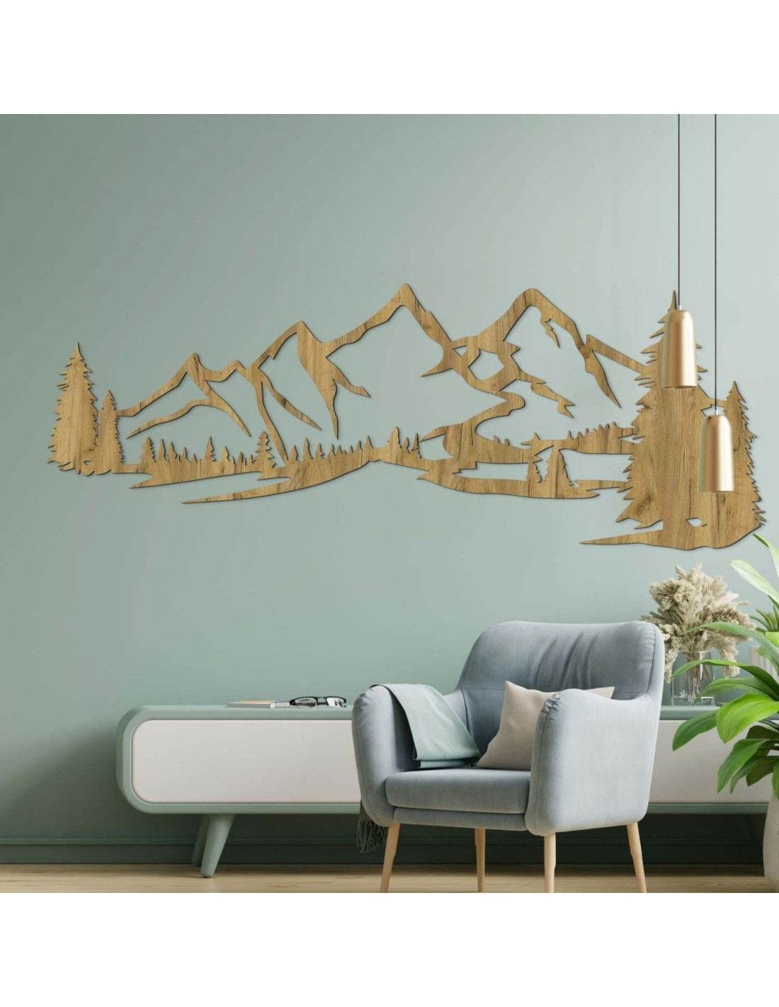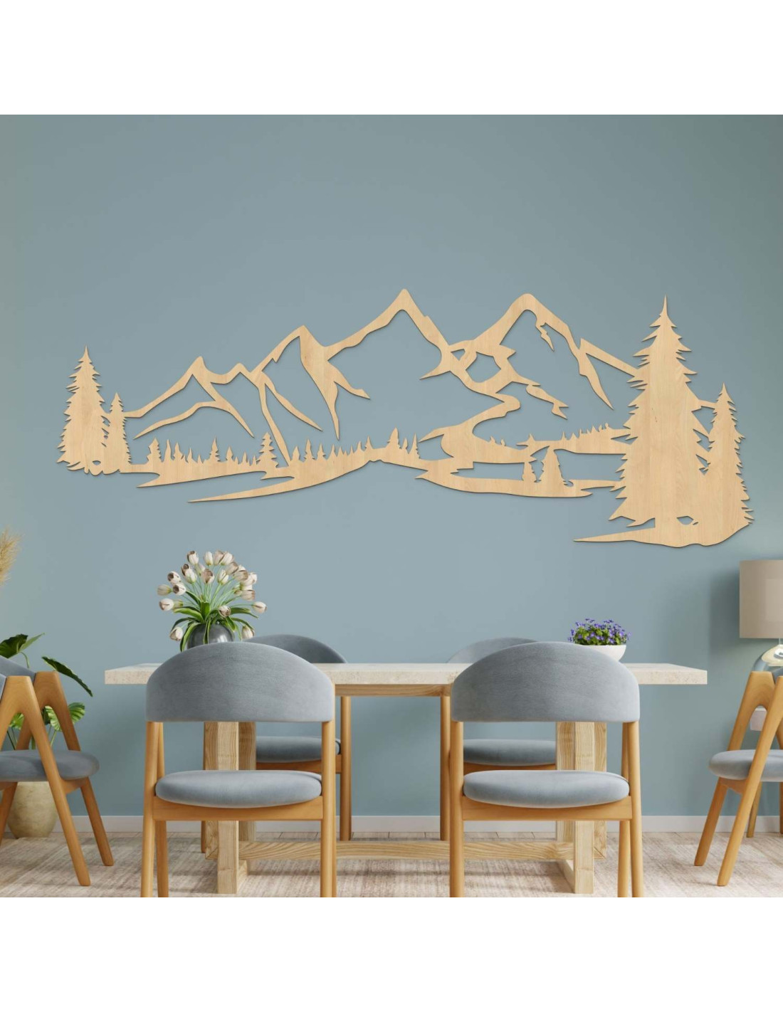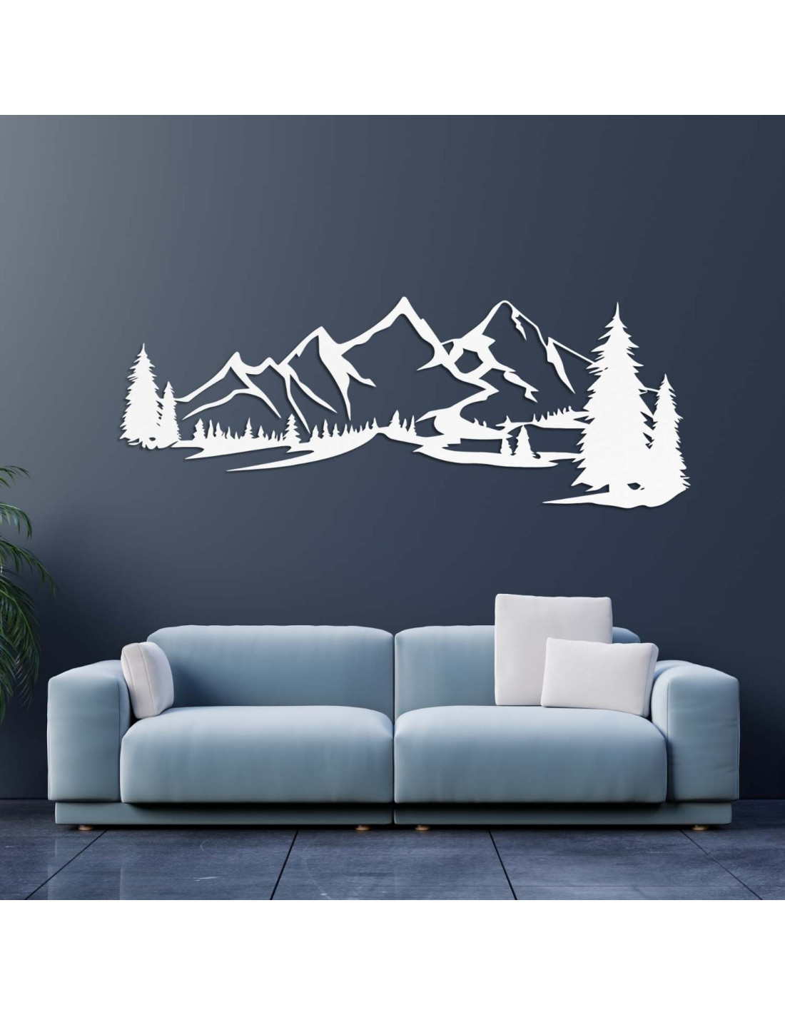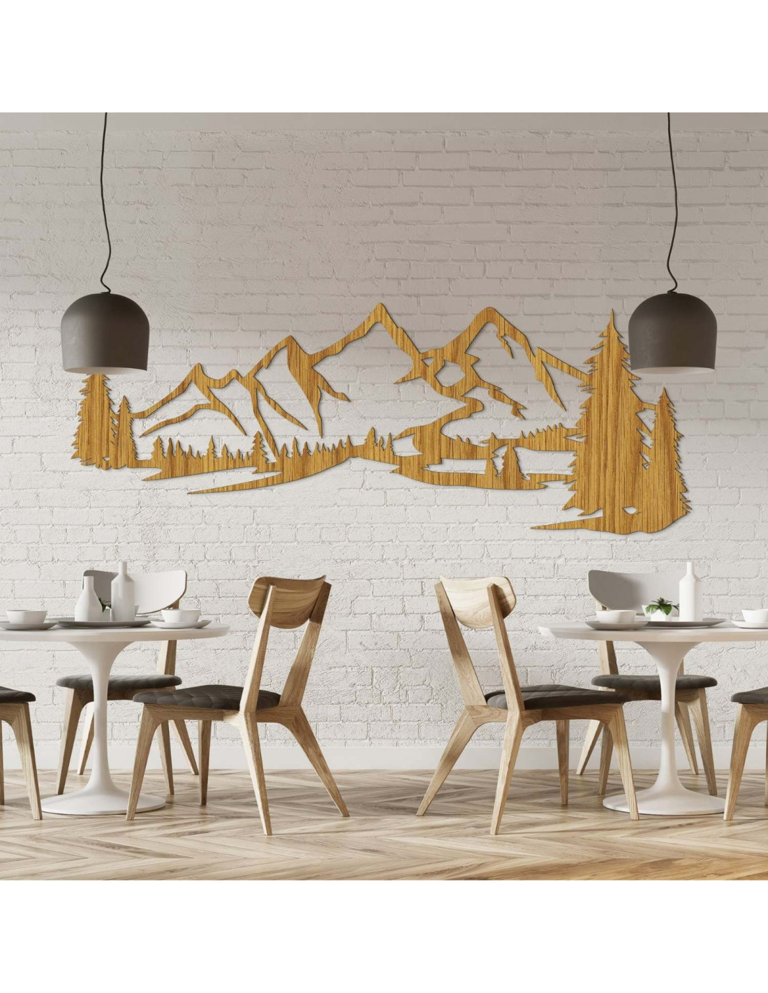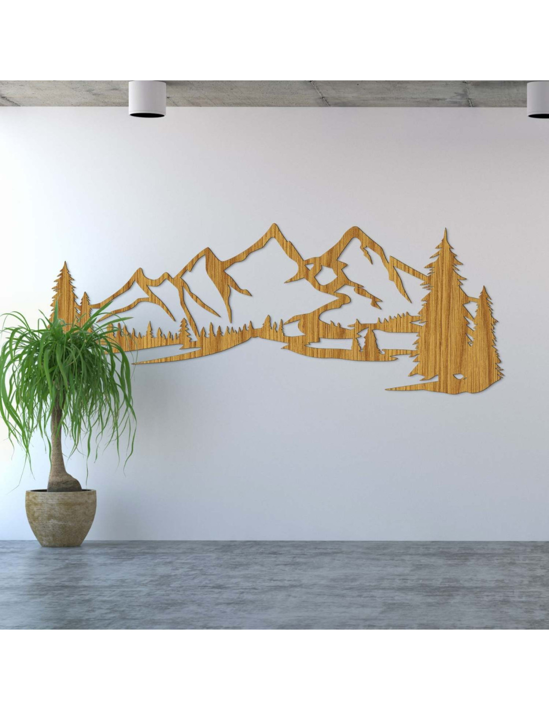 Die Kombination aus Berglandschaften, Nadelbäumen und präzisem Laserschnitt schafft eine unverwechselbare, dominante Ästhetik, die im Wohnzimmer, Schlafzimmer, Arbeitszimmer und Flur wunderschön zur Geltung kommt.