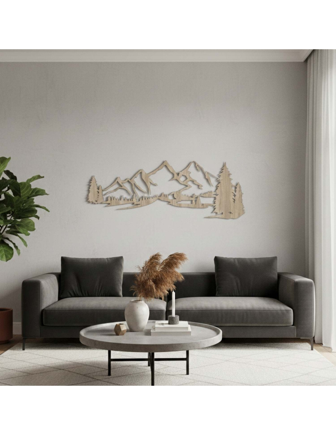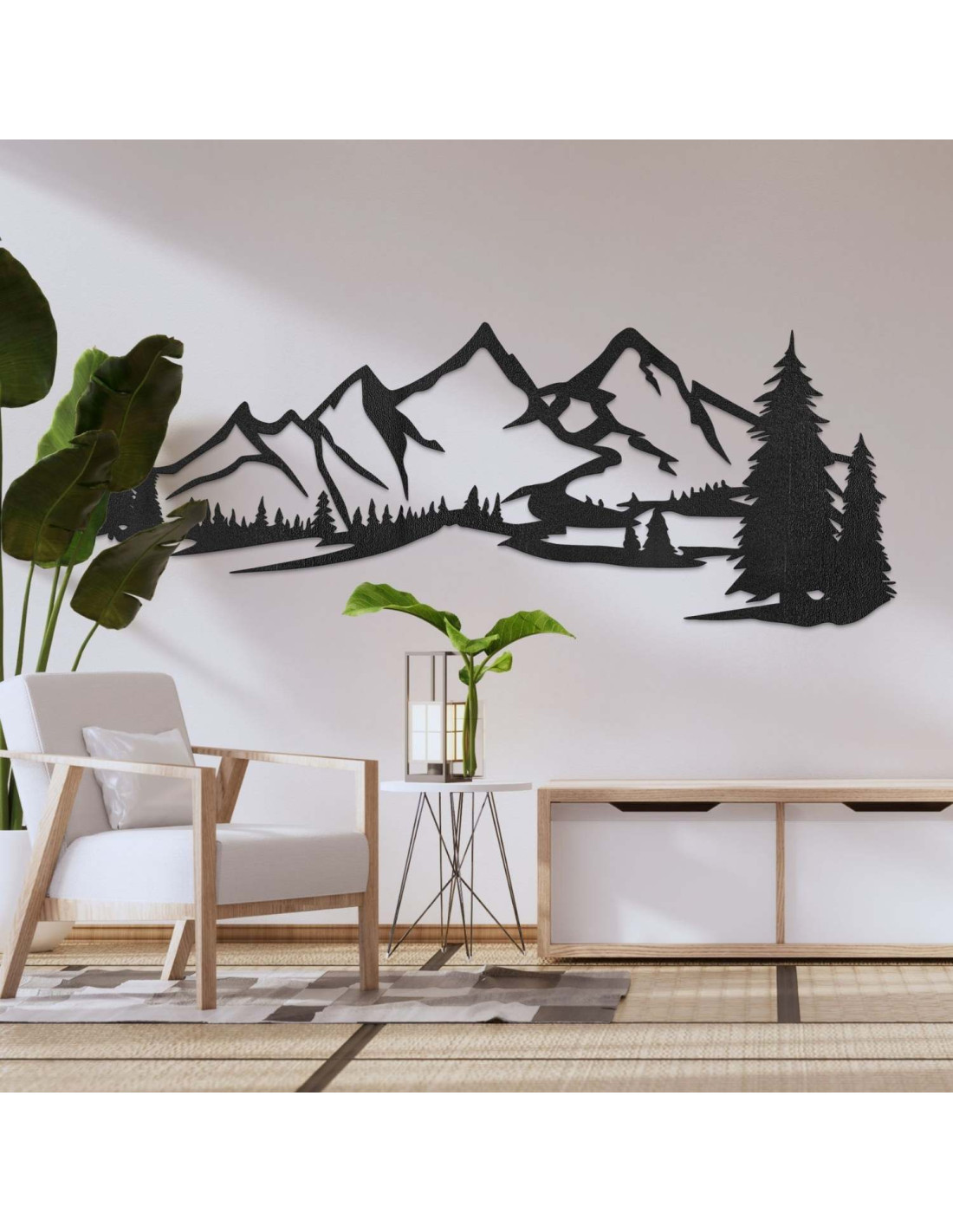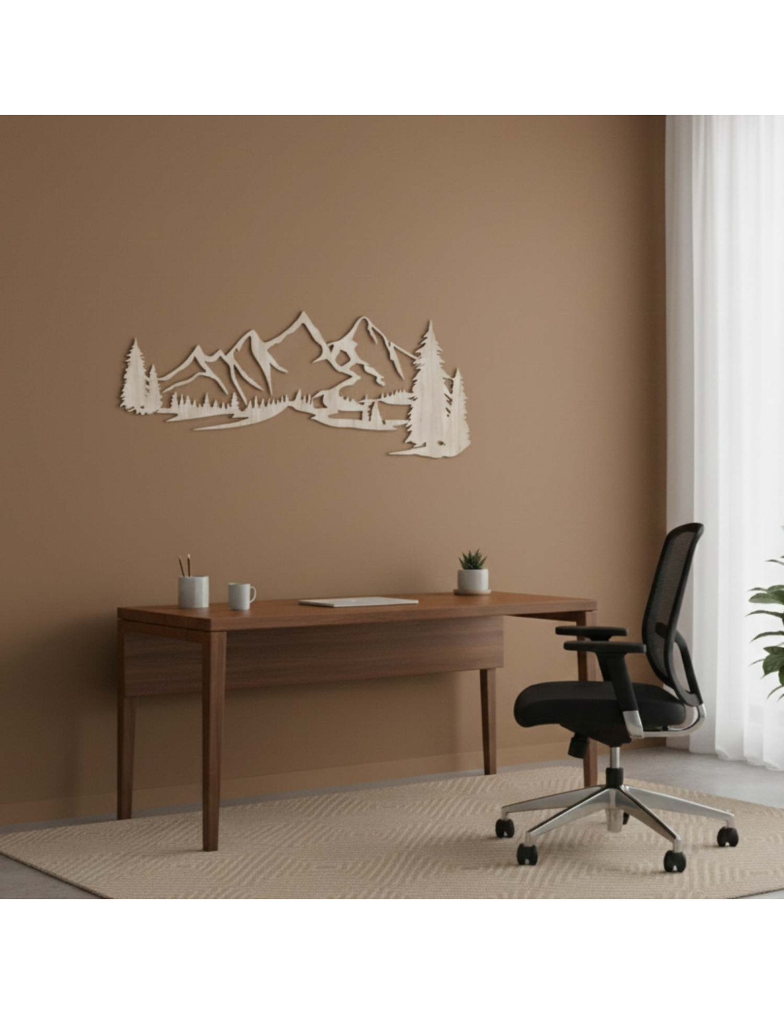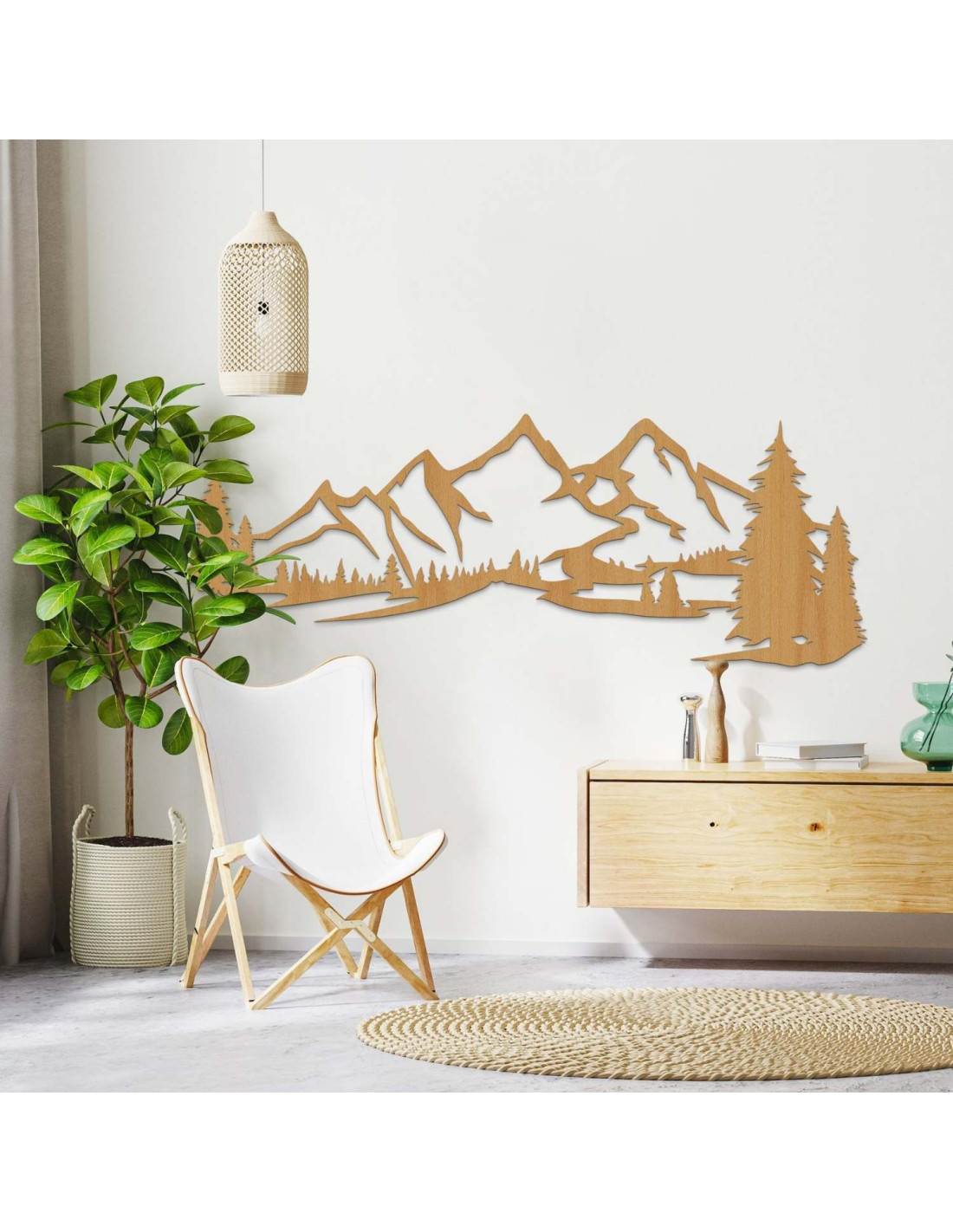 Die Kombination aus Berglandschaften, Nadelbäumen und präzisem Laserschnitt schafft eine unverwechselbare, dominante Ästhetik, die im Wohnzimmer, Schlafzimmer, Arbeitszimmer und Flur wunderschön zur Geltung kommt.