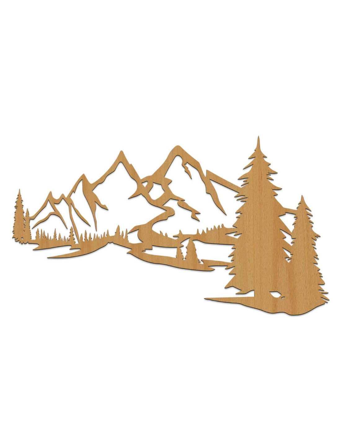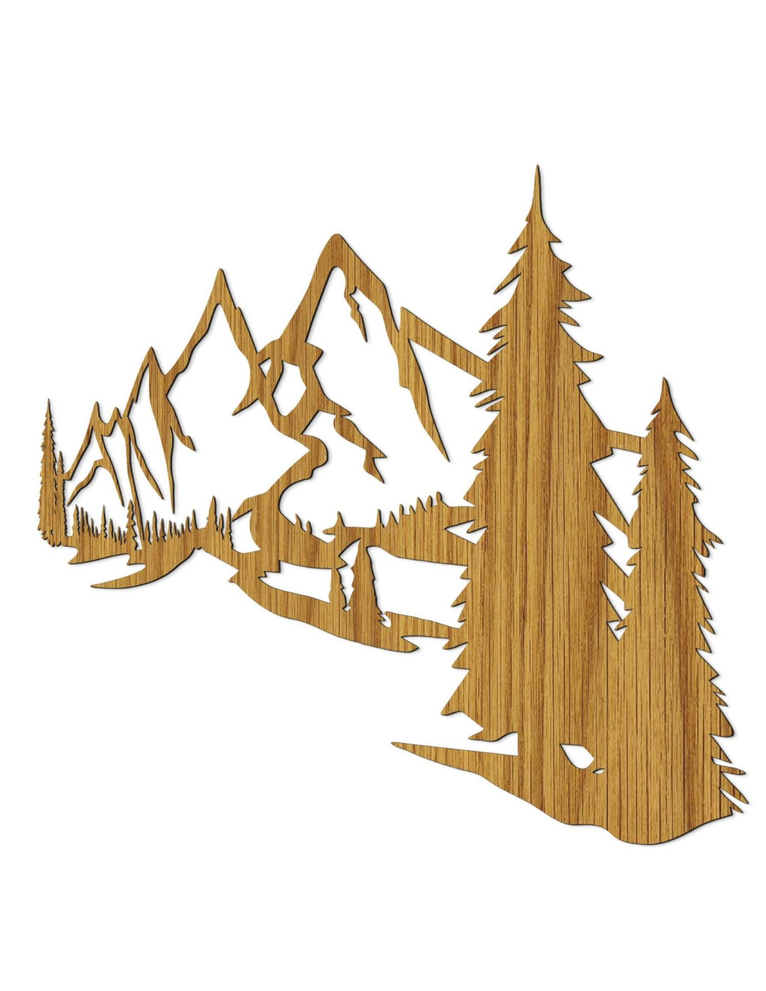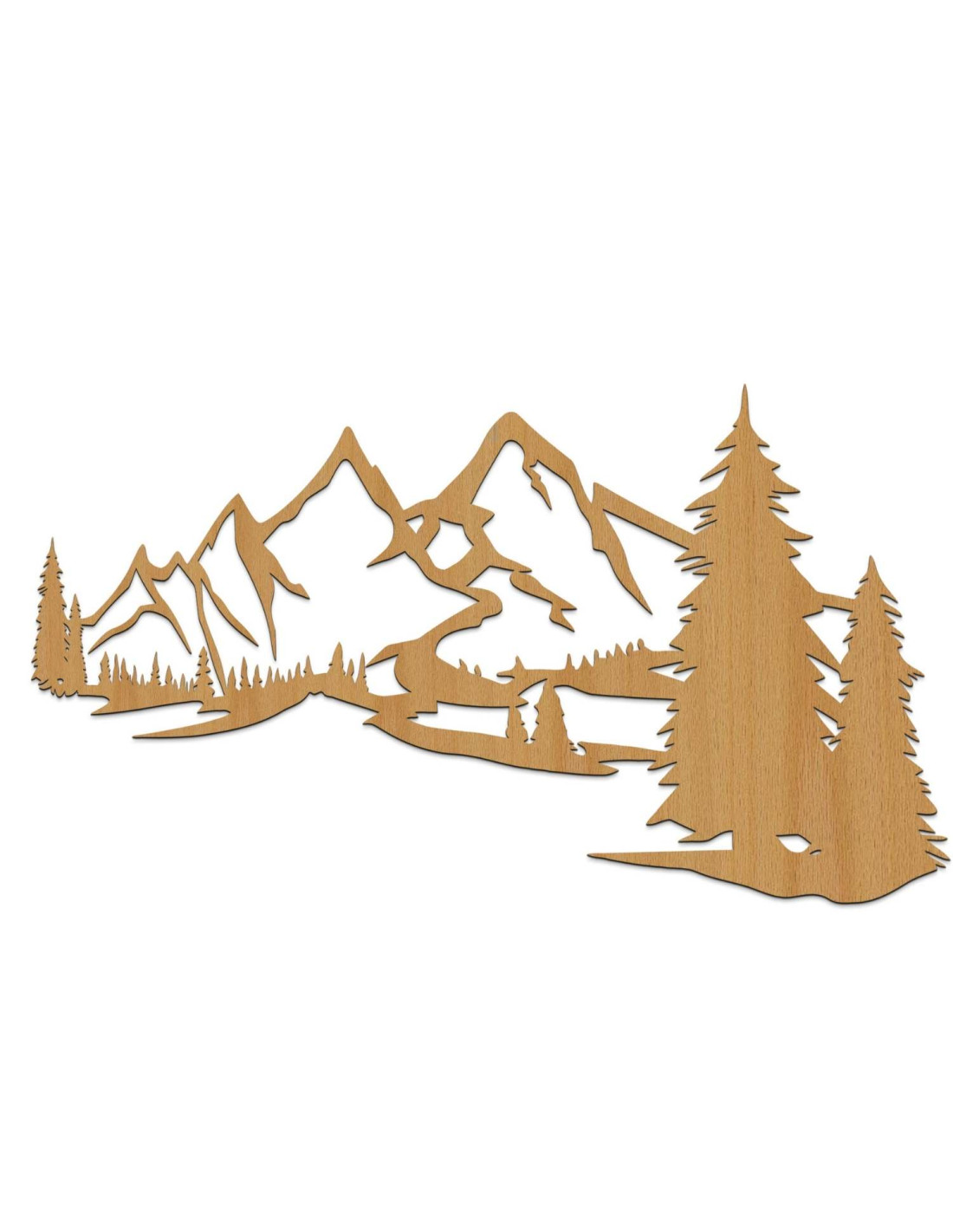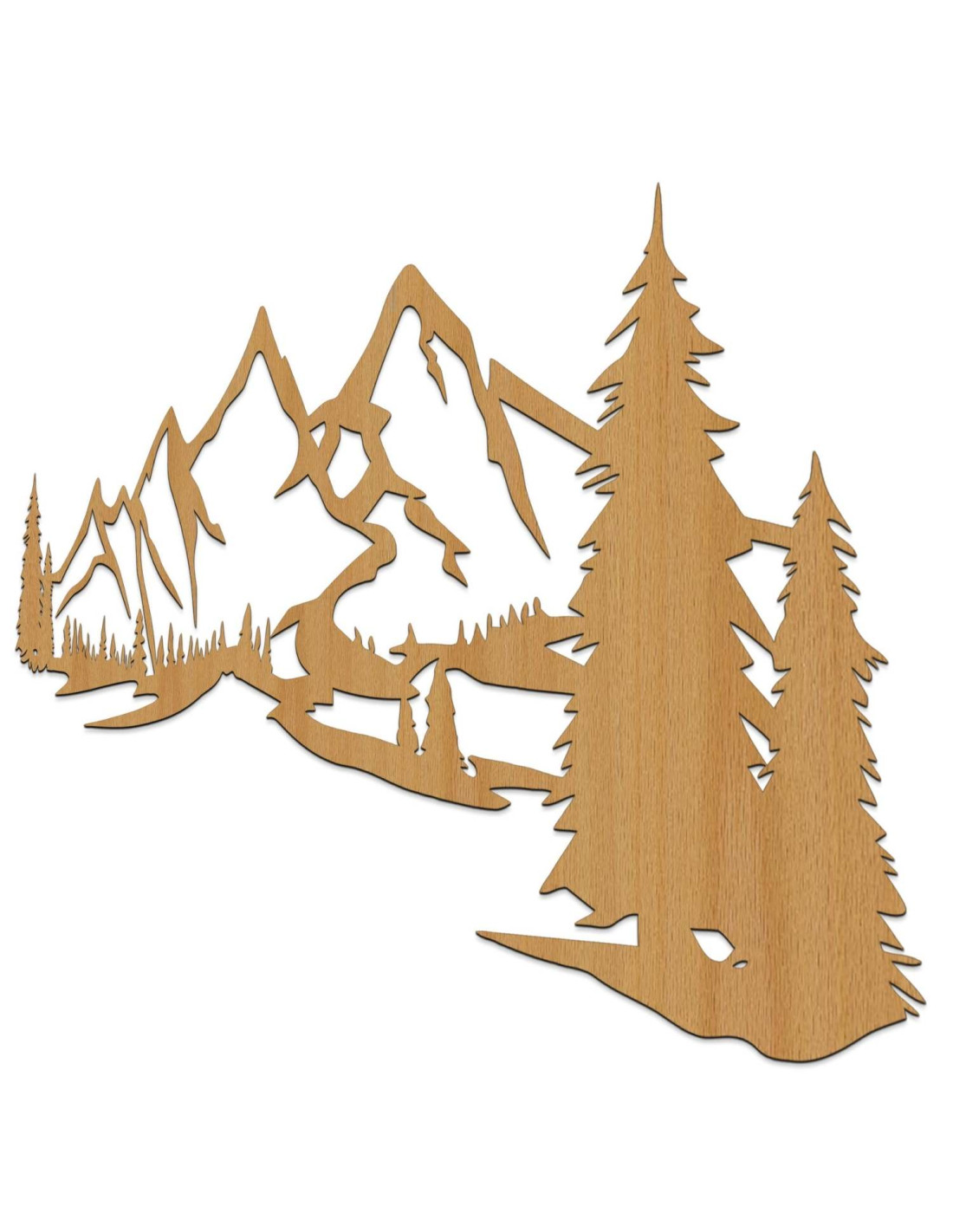 Die Landschaft mit ihren majestätischen Bergen und Nadelbäumen ist mit präzisem Laserschnitt herausgearbeitet, wodurch feine Details, klare Linien und eine professionelle Verarbeitungsqualität gewährleistet werden.