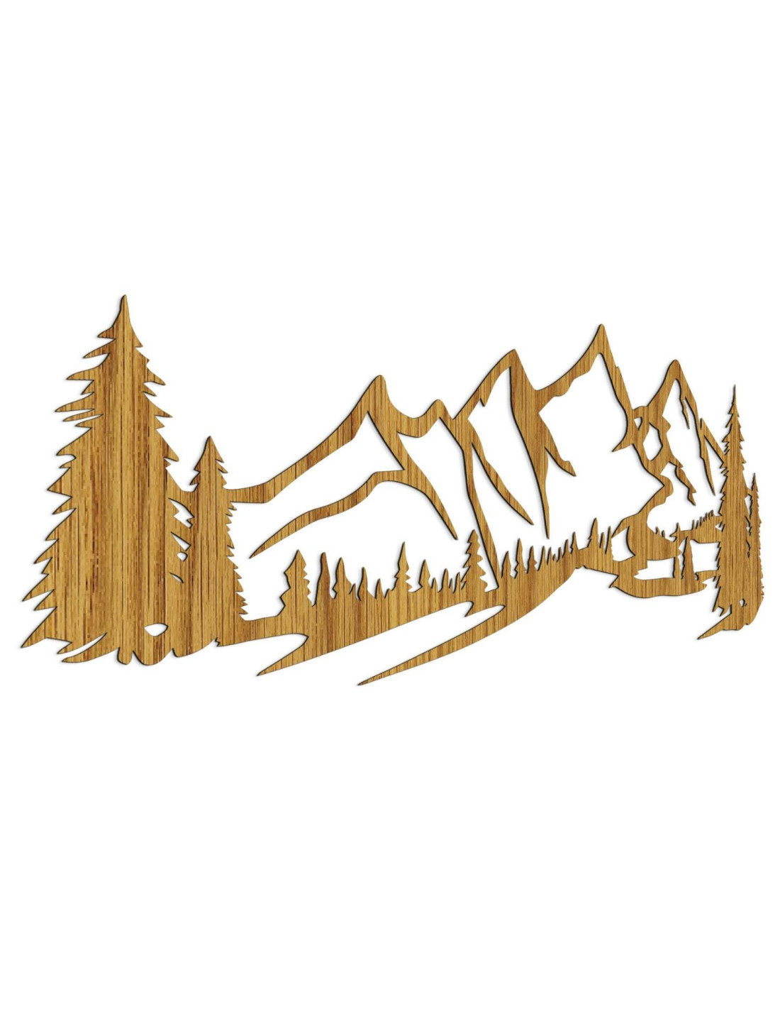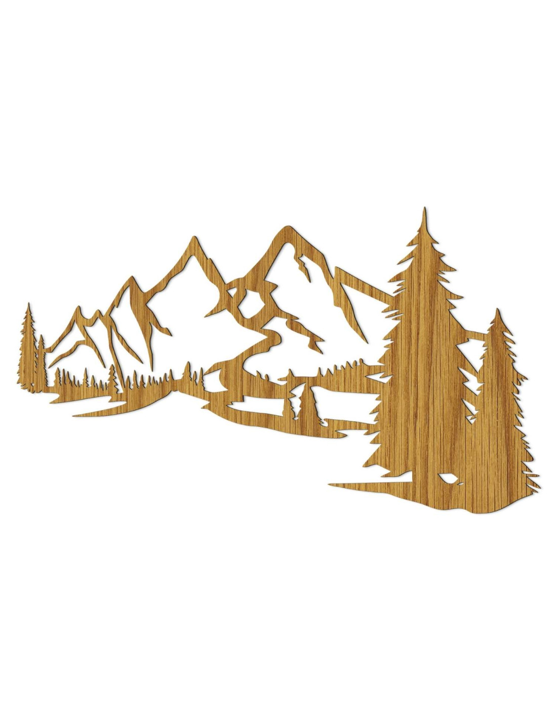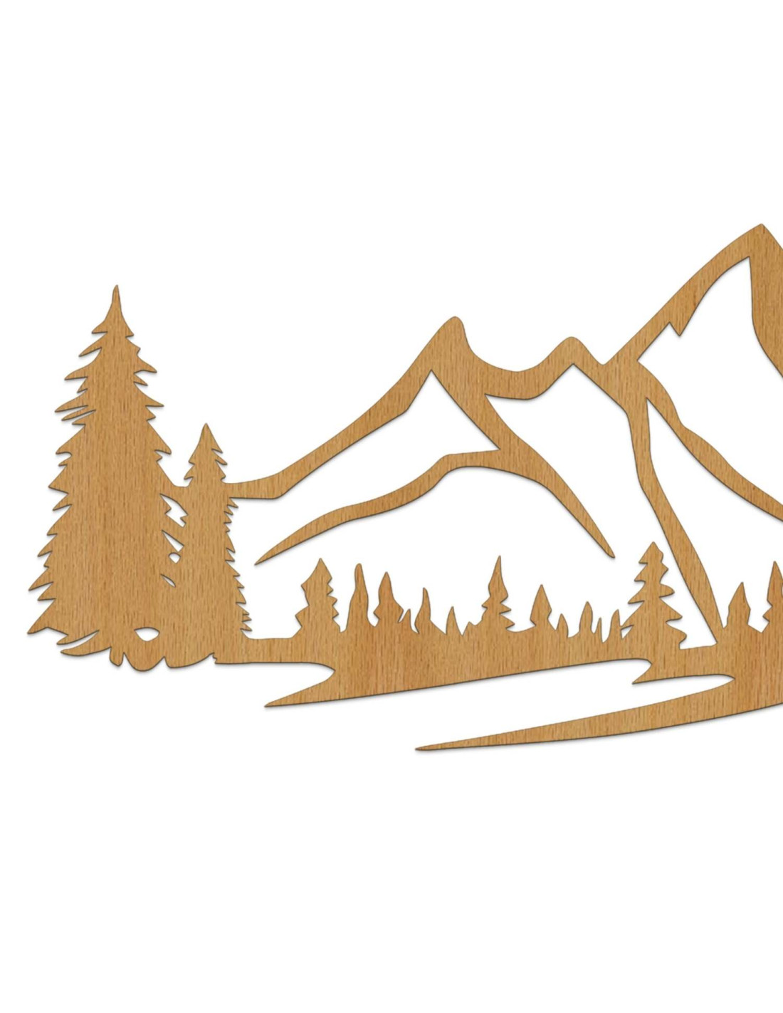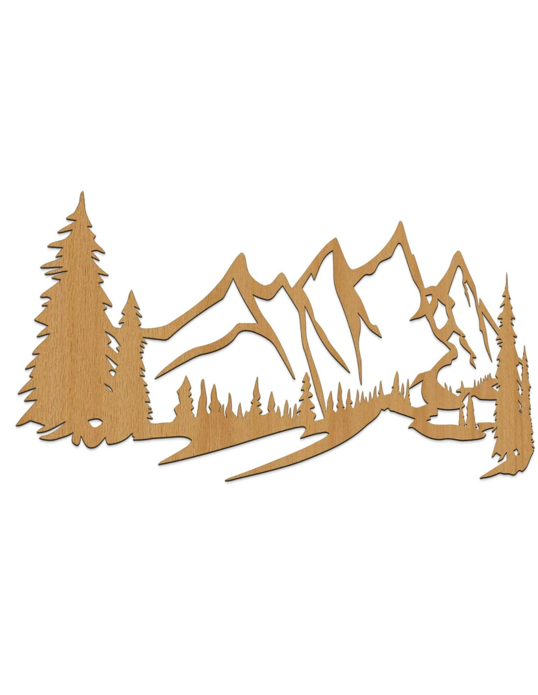 Die Landschaft mit ihren majestätischen Bergen und Nadelbäumen ist mit präzisem Laserschnitt herausgearbeitet, wodurch feine Details, klare Linien und eine professionelle Verarbeitungsqualität gewährleistet werden.
