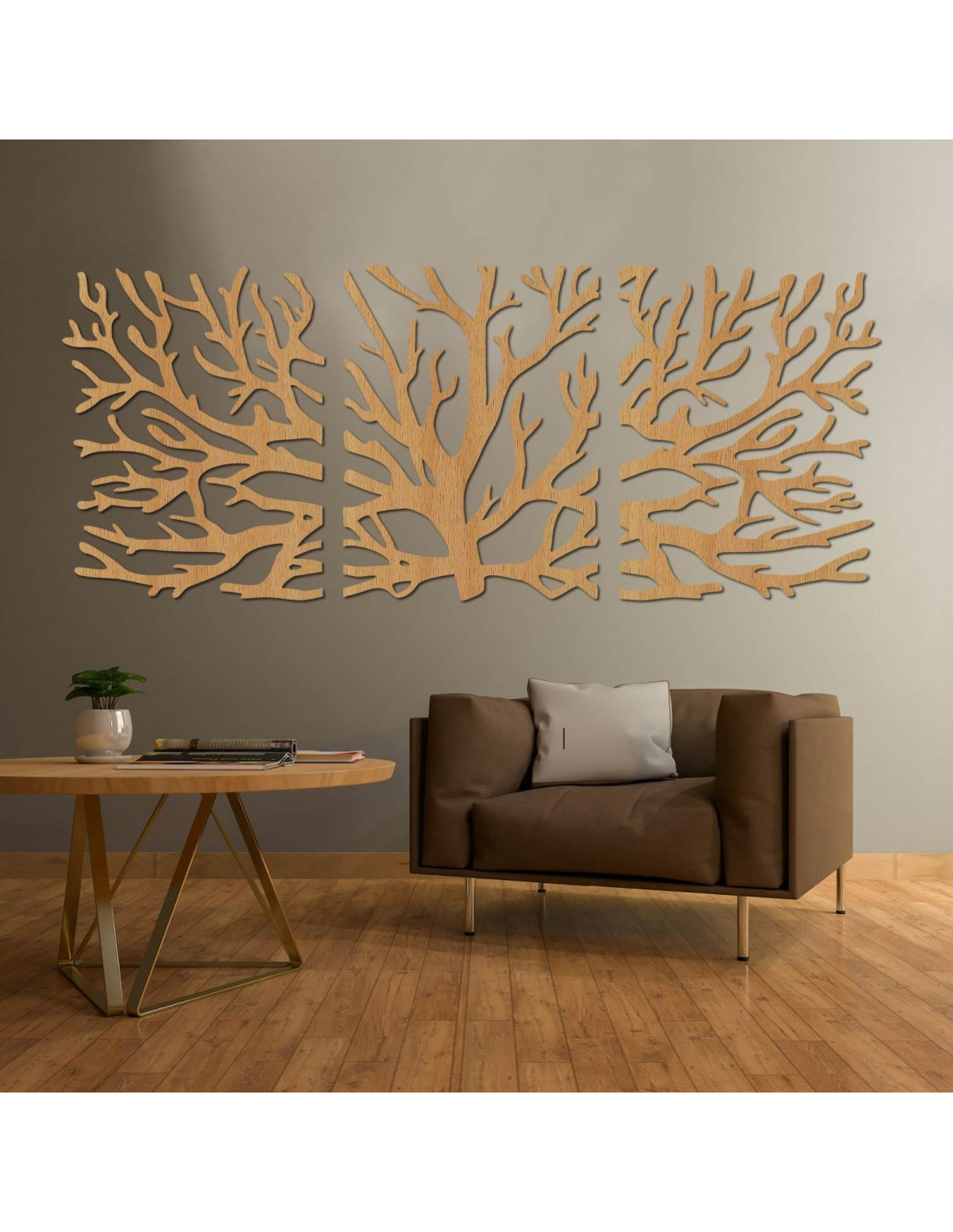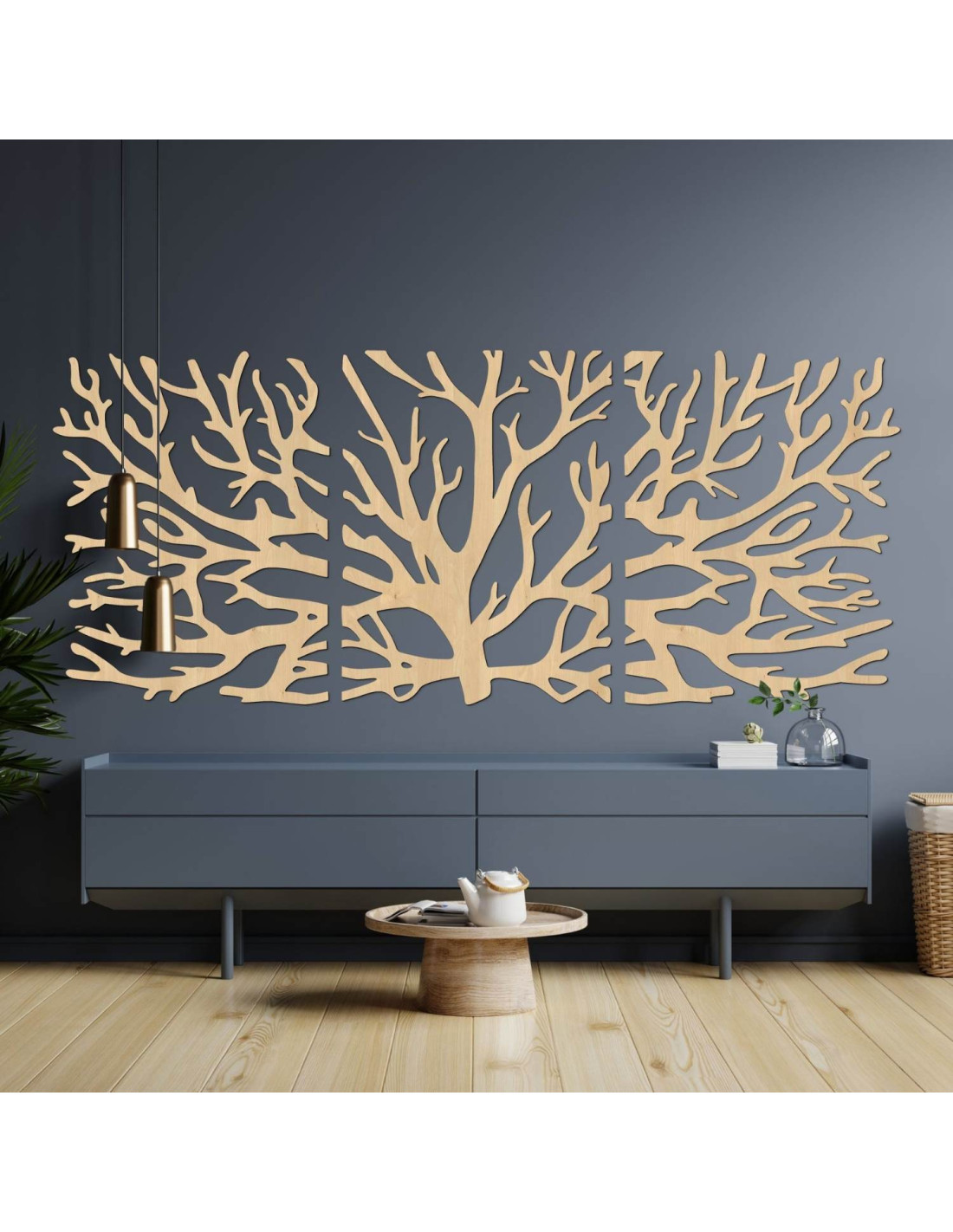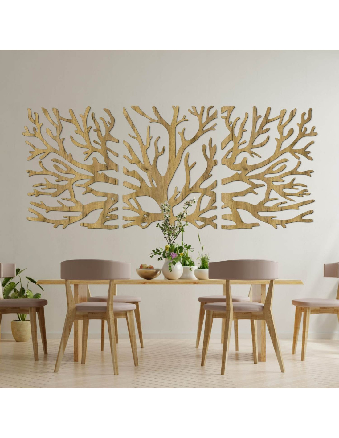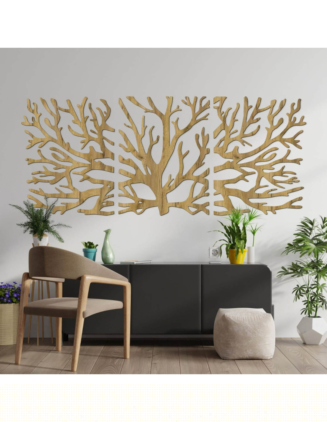 Entdecken Sie ein dreiteiliges Holzbild mit dem Motiv des Lebensbaums – eine harmonische Kombination aus modernem Design , natürlicher Symbolik und künstlerischer Eleganz , die Ihrem Interieur einen einzigartigen Charakter verleiht.